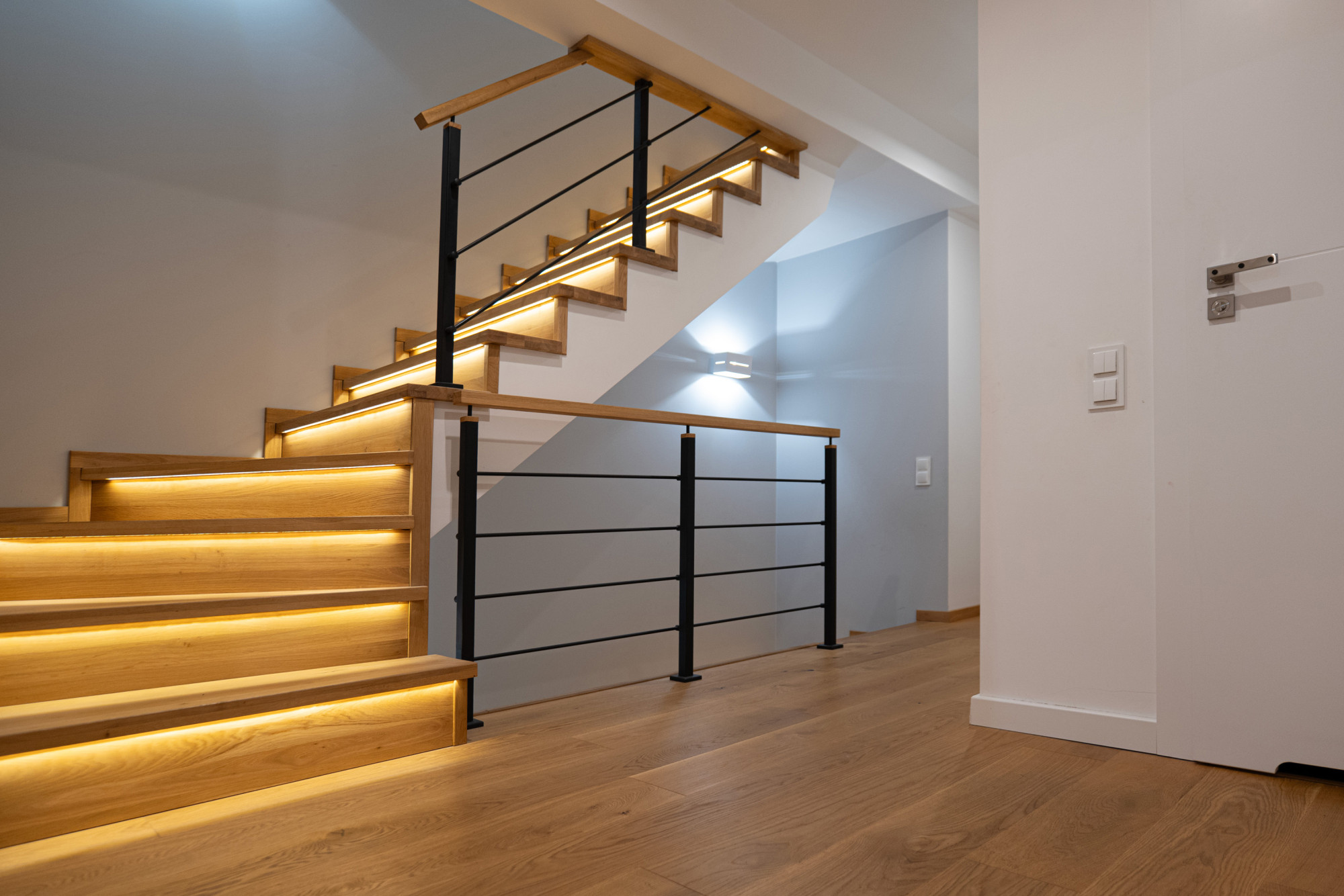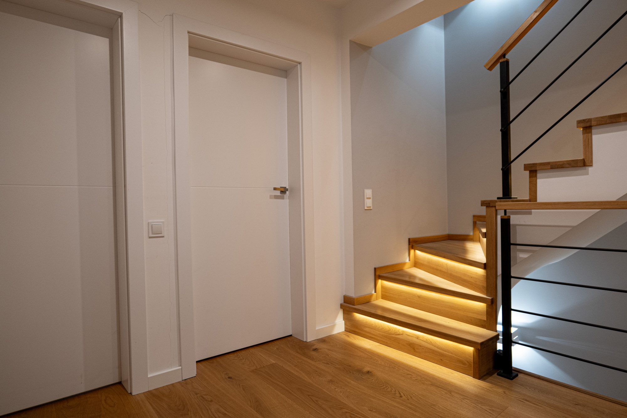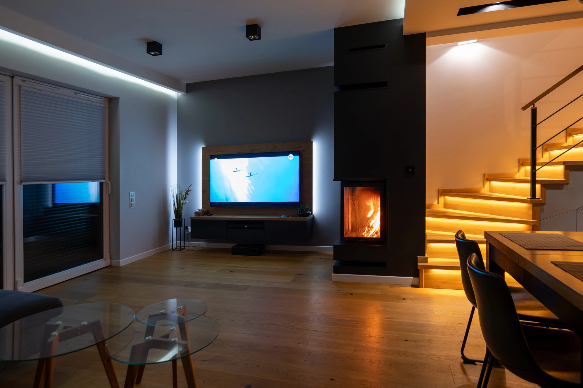 – Przestronny salon z aneksem kuchennym, kominkiem, zabudową pod schodami i wyjściem do ogrodu;