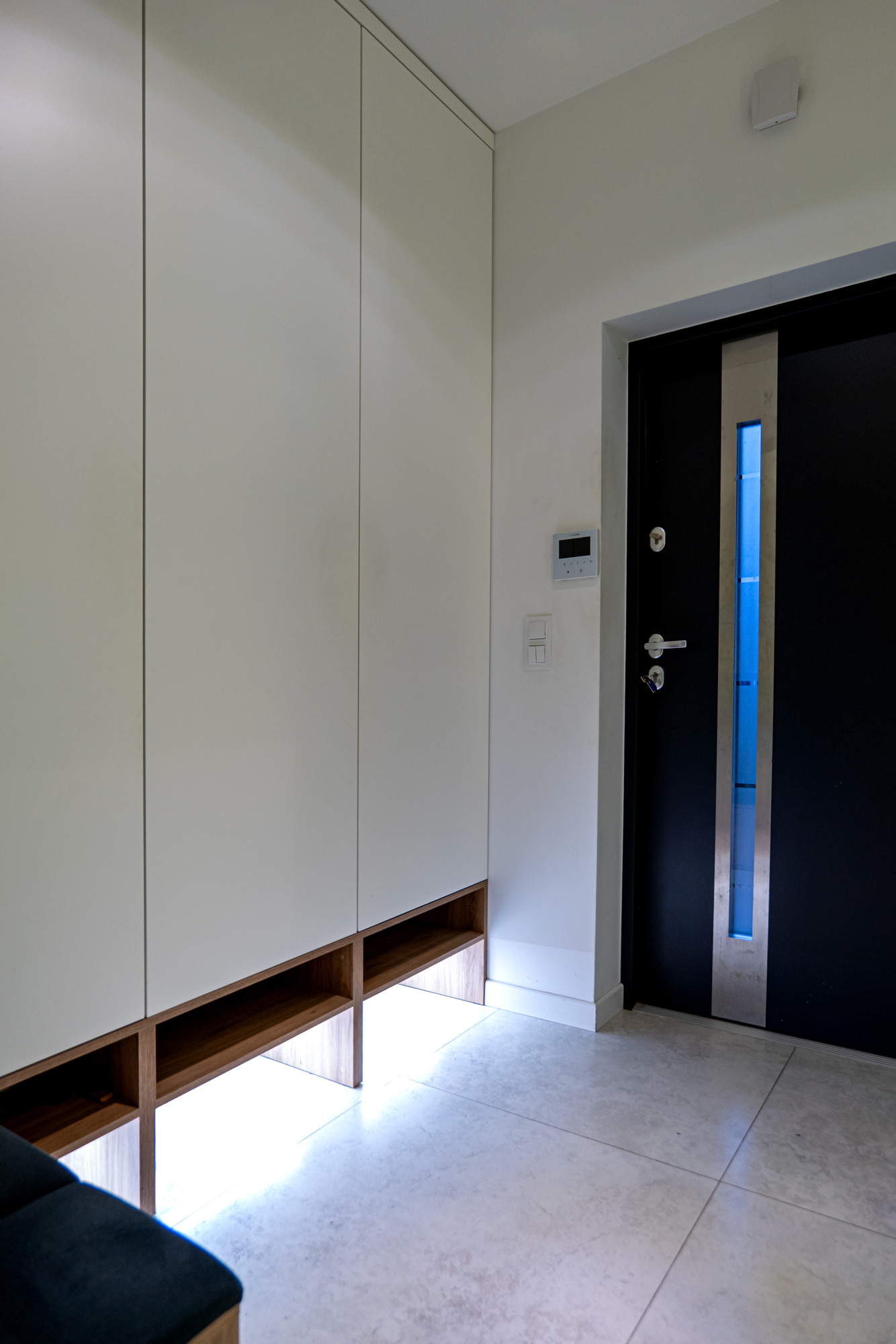– Garaż z elektryczną bramą Hormann oraz wbudowanymi półkami przeznaczonymi do przechowywania narzędzi.
