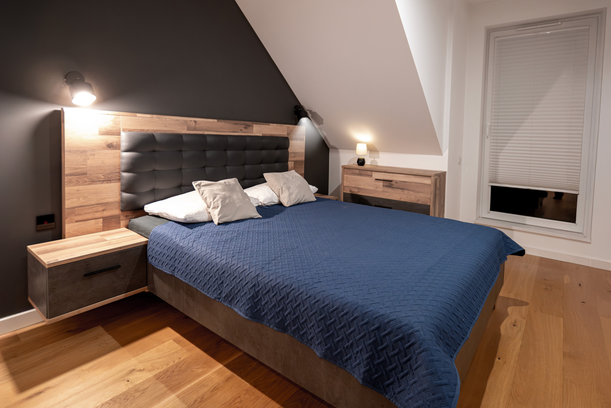 – Trzy przestronne sypialnie, każda z praktyczną zabudową meblową, w tym wbudowanymi szafami. Jedna z sypialni dodatkowo wyposażona jest w garderobę oraz wyjście na taras;