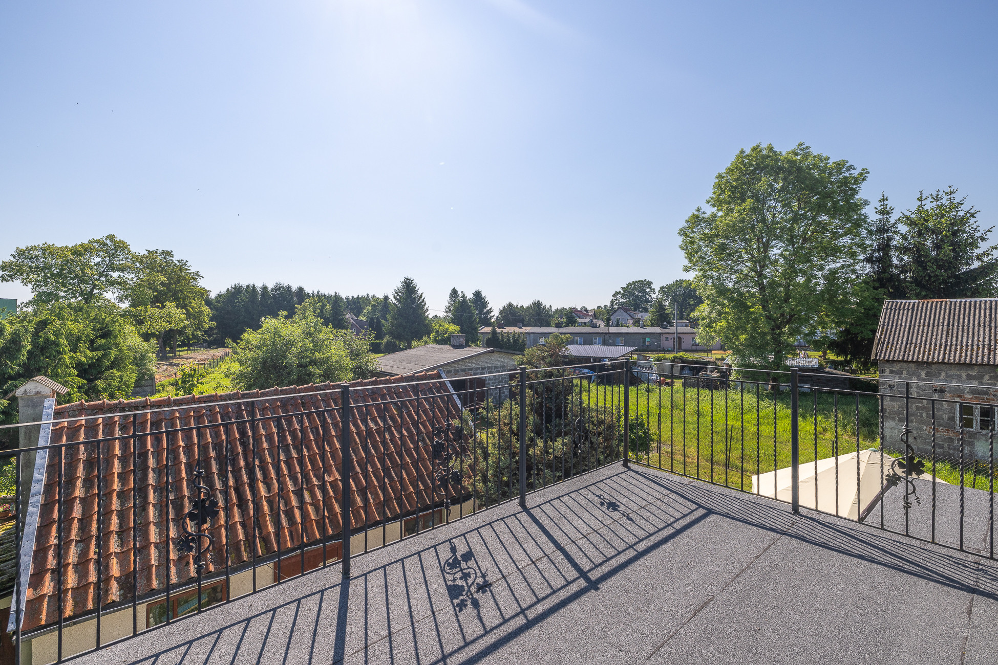 -Dom wybudowany z cegły, na dachu eternit malowany, na tarasie na piętrze papa