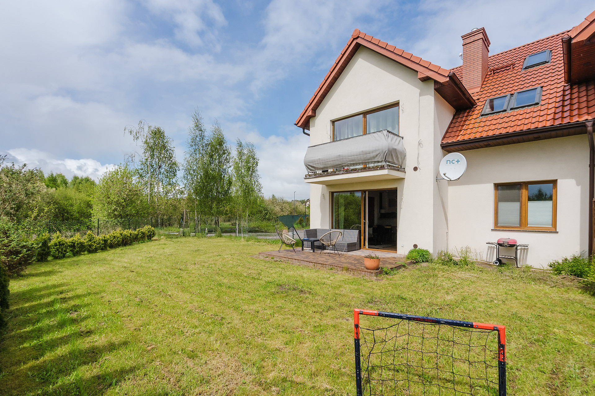 Nieruchomość położona jest w Baninie – spokojnej i dynamicznie rozwijającej się miejscowości tuż przy granicy z Gdańskiem. Lokalizacja łączy w sobie bliskość natury, ciszę i komfort życia z doskonałym dostępem do Trójmiasta. Okolica jest zielona, cicha i bardzo kameralna, z przewagą zabudowy jednorodzinnej, a sam budynek znajduje się na końcu ulicy, tuż przy małym lesie, co zapewnia wyjątkowy klimat oraz prywatność. W najbliższym otoczeniu znajdują się sklepy, szkoła, przedszkola, restauracje, punkty usługowe oraz liczne tereny rekreacyjne. Miejsce jest bardzo dobrze skomunikowane – dojazd do Gdańska Osowy zajmuje 10 minut, do obwodnicy Trójmiasta 15 minut, a do centrum Gdańska około 25 minut. Blisko stąd również do stacji PKM Rębiechowo i przystanków autobusowych, które zapewniają szybkie połączenia z całym Trójmiastem.