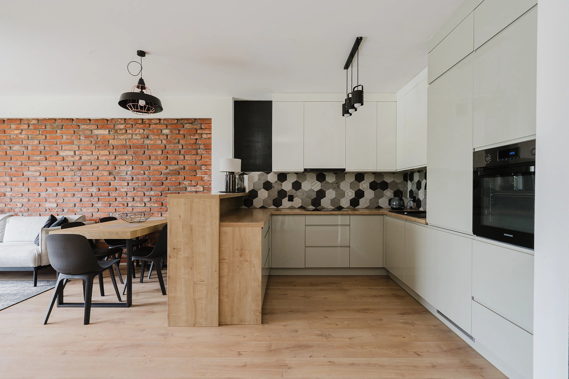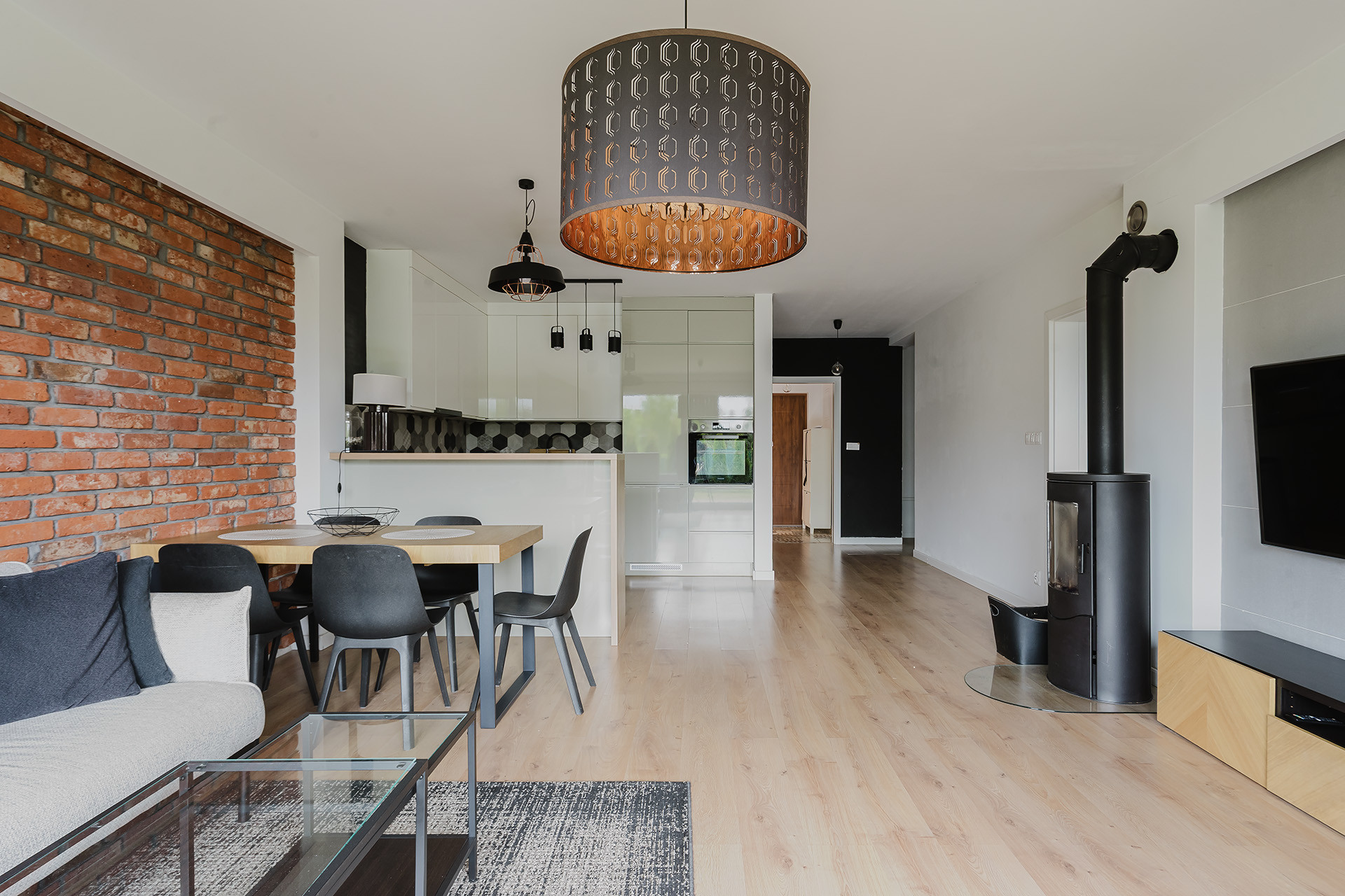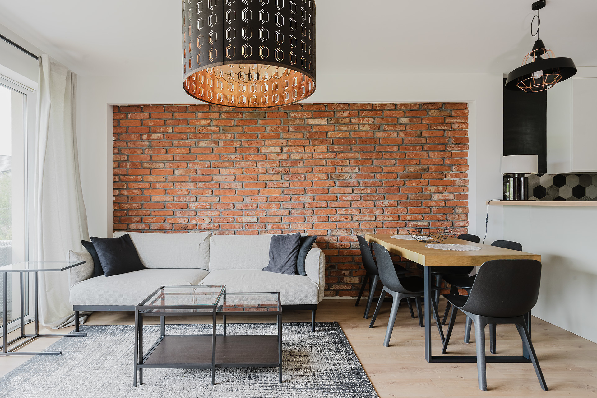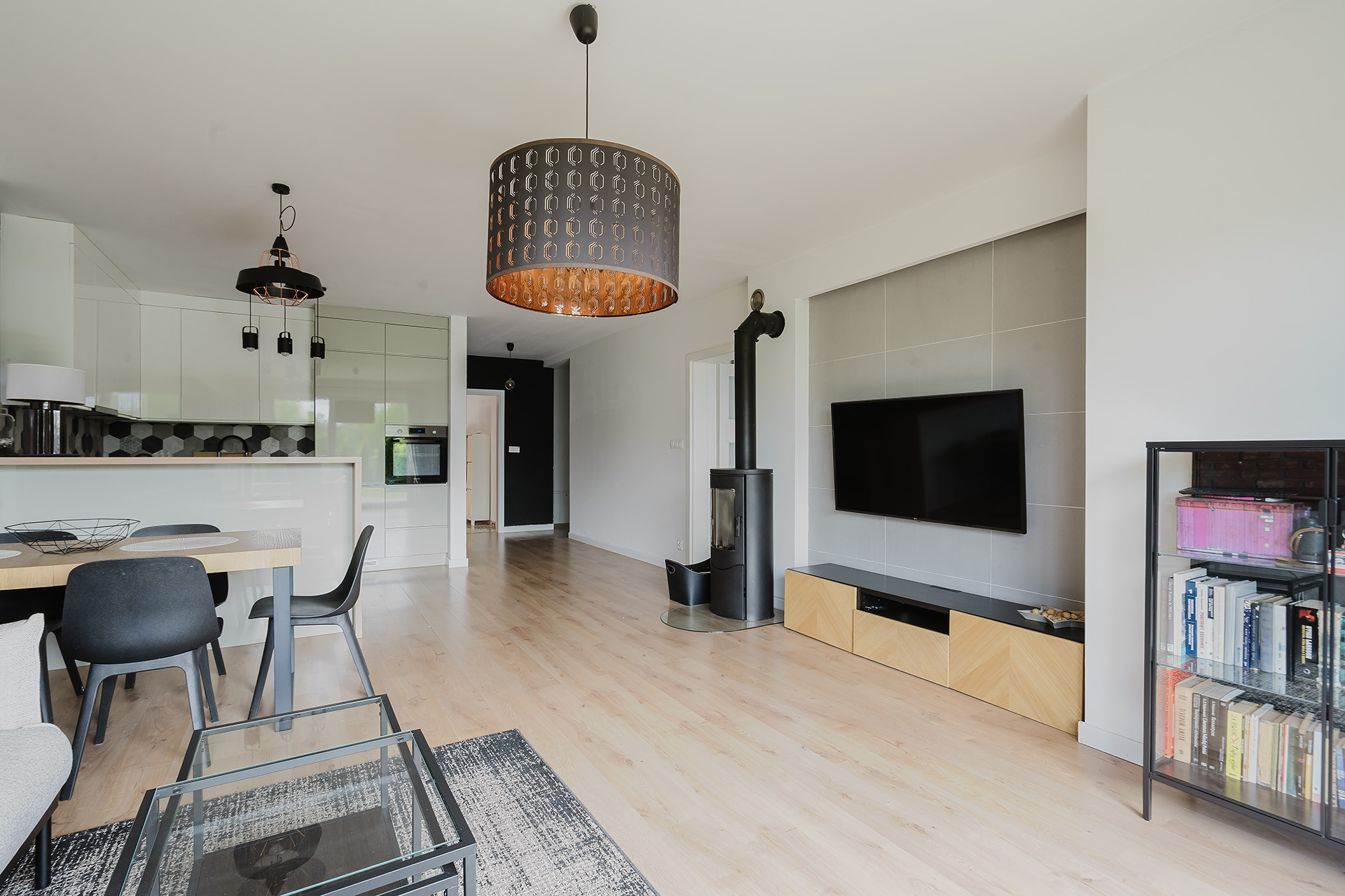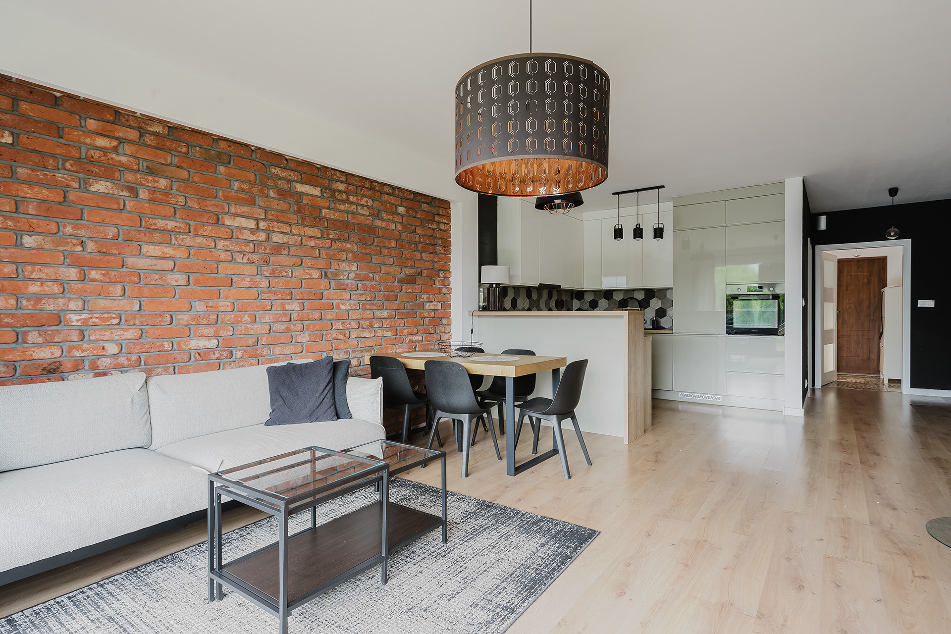 Mieszkanie sprzedawane jest z pełnym wyposażeniem, w tym z kuchnią wykonaną na wymiar przez stolarza wraz ze sprzętem AGD, nowymi meblami ruchomymi oraz meblami tarasowymi a także grillem. Na ścianie w salonie położona została cegła naturalna.
