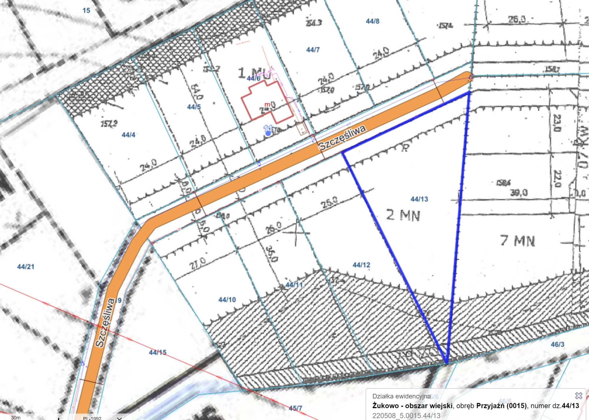 Działka 44/13 i działki do niej przylegające są objęte miejscowym planem zagospodarowania przestrzennego przyjętym uchwałą nr XIX/376/2004 Rady Miejskiej w Żukowie z dn. 30.04.2004 (Dz. Urz. Woj. Pom. nr 82 poz. 1508 z dn. 07.07.2004). Działka nr 44/13 jest położona na terenie oznaczonym symbolem 2 MN, tj. zabudowa mieszkaniowa jednorodzinna, gdzie: