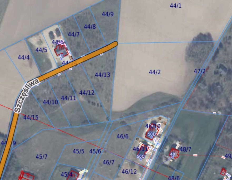 Płaska działka budowlana o pow. 2.183 m² z dostępem do drogi publicznej (ul. Słoneczna) ulicą Szczęśliwą, na której jest ustanowiona nieodpłatna i nieograniczona służebność drogowa (działka 44/14).
