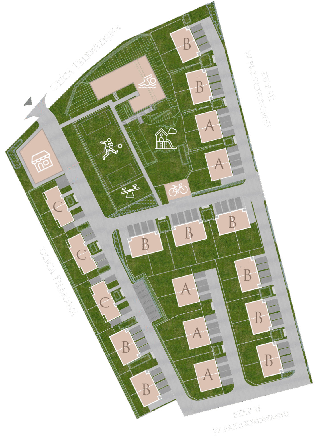 Miejsca postojowe: dwa przed każdym domem, w tym jedno z gniazdem do ładowania pojazdów elektrycznych