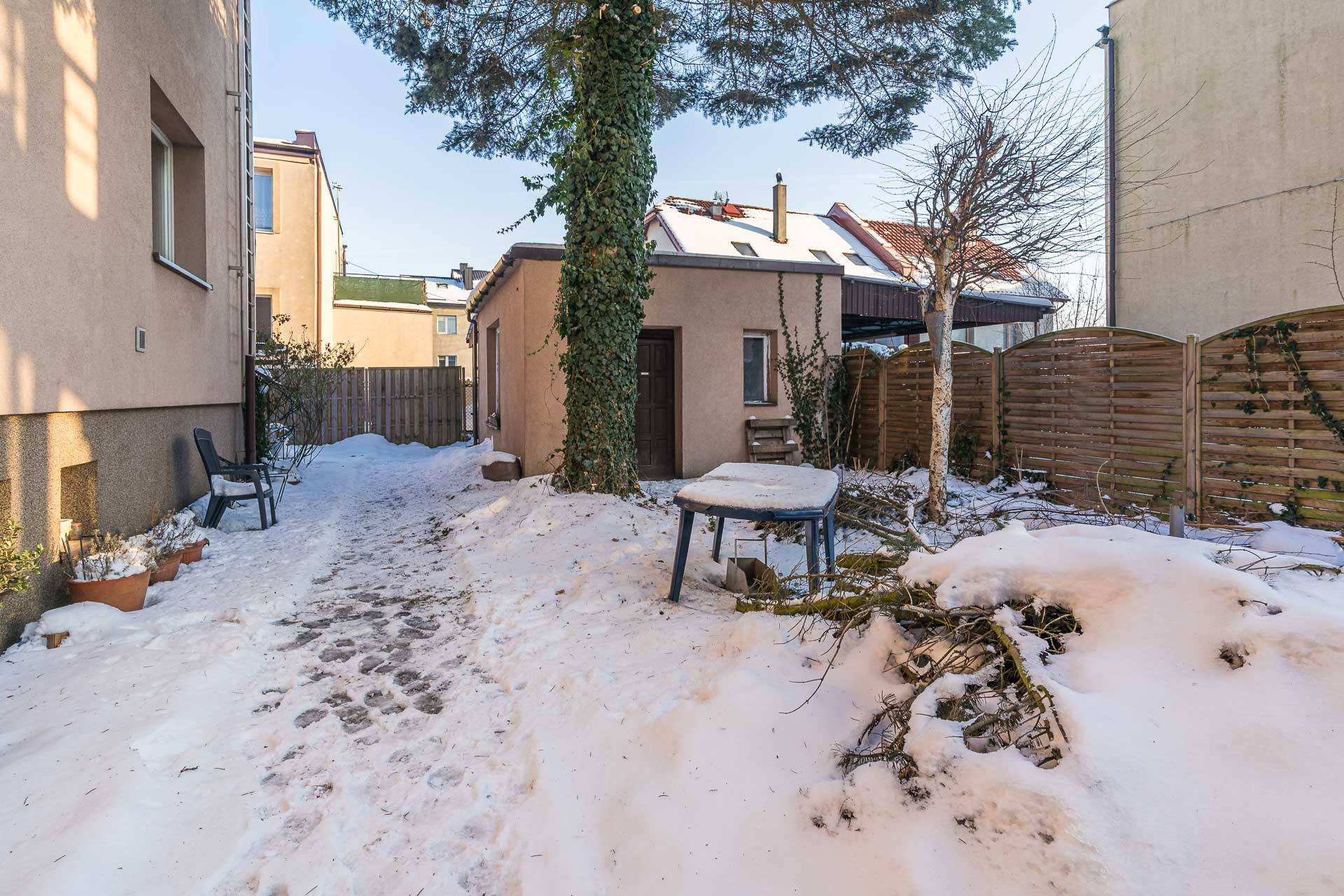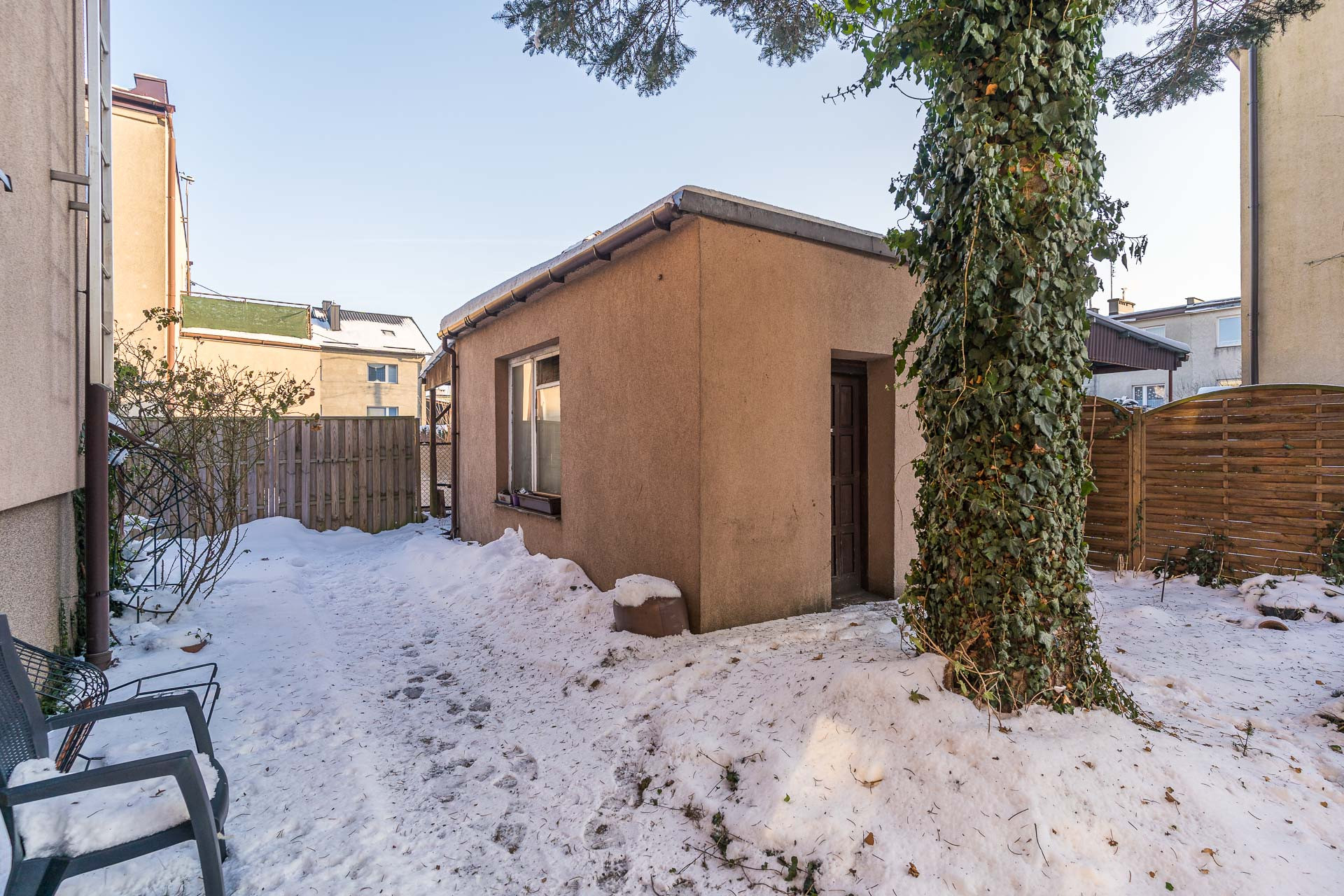 Dom posadowiony jest na działce o powierzchni 295 m², o regularnym kształcie prostokąta. Teren jest w pełni ogrodzony- od frontu ogrodzeniem metalowym, natomiast z boków i z tyłu siatką. Dojazd do nieruchomości zapewnia gminna droga asfaltowa. Do działki doprowadzone są wszystkie media: gaz, prąd, woda oraz kanalizacja. Dodatkowym atutem jest murowany domek gospodarczy o powierzchni 16,70 m², idealny do przechowywania lub na cele gospodarcze.
