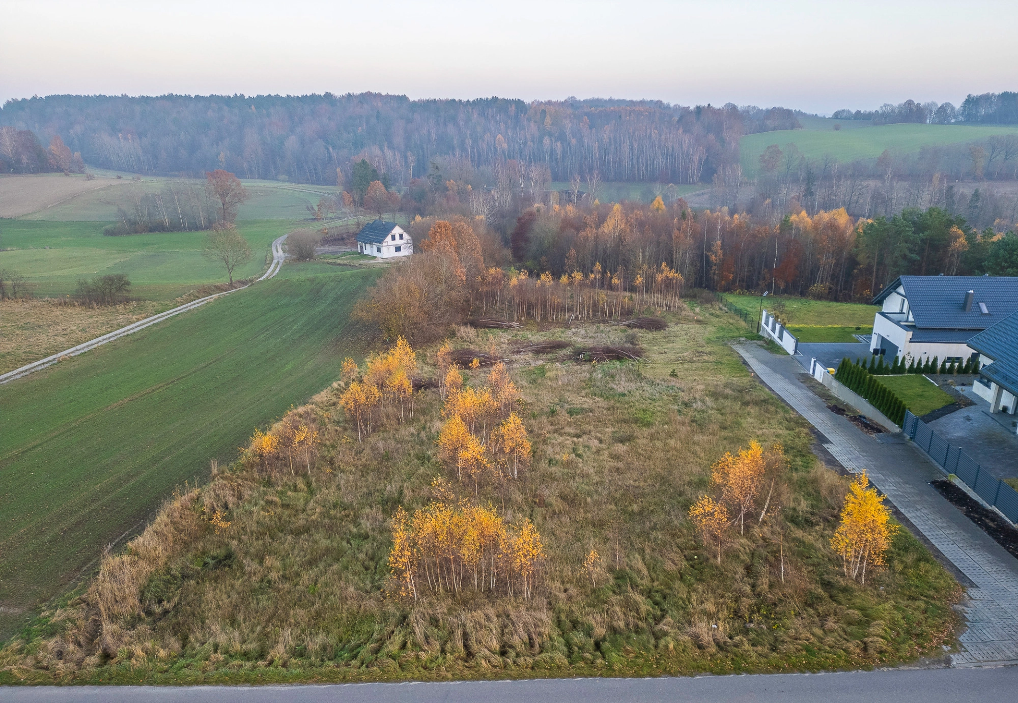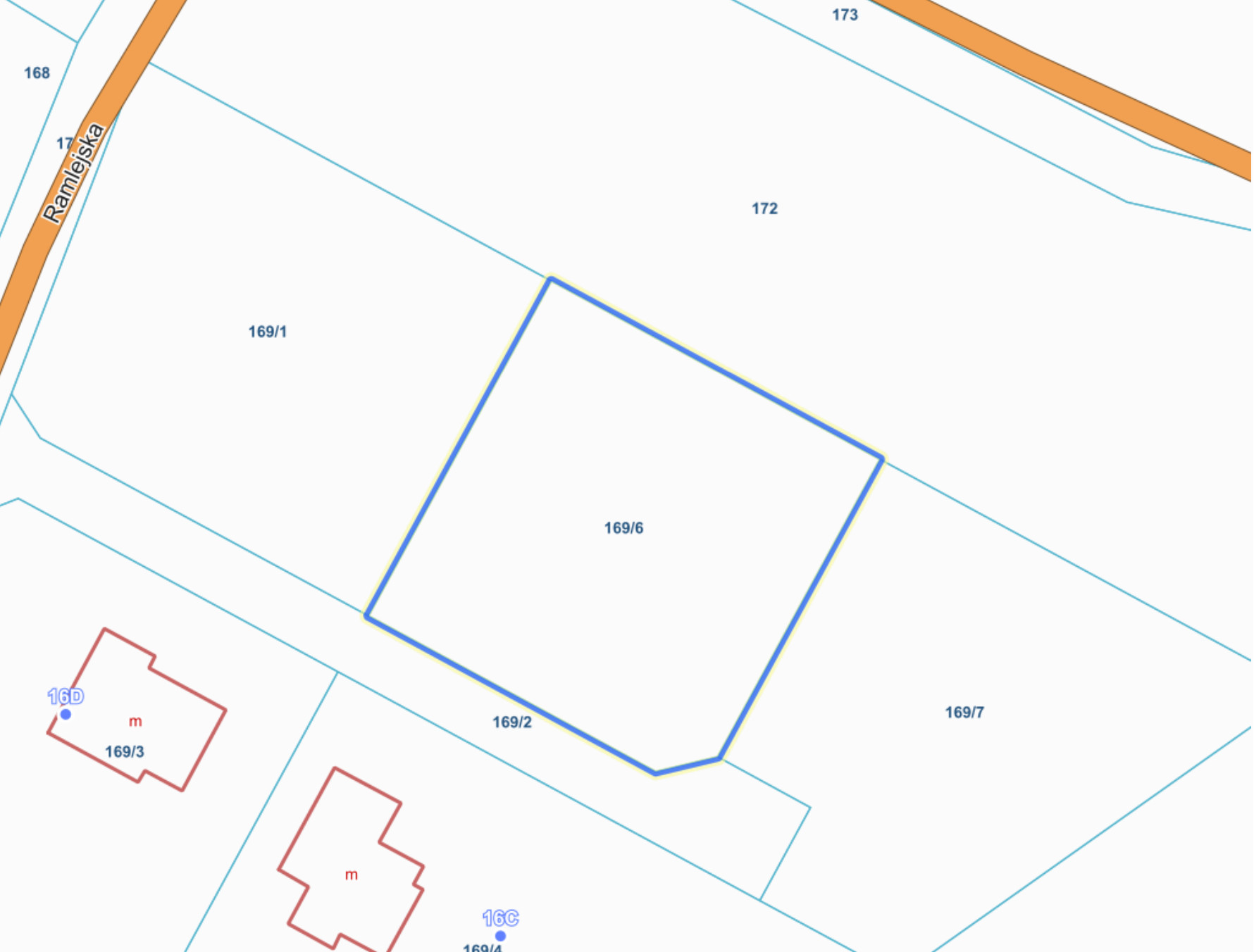 Działka o powierzchni 1267 m², w kształcie zbliżonym do kwadratu, o lekko nachylonym terenie. Dojazd do nieruchomości prowadzi utwardzoną drogą z płyt betonowych (ok. 100 m drogi prywatnej), która łączy się z gminną, asfaltową ulicą Ramlejską. W drodze dostępne media: prąd i woda.