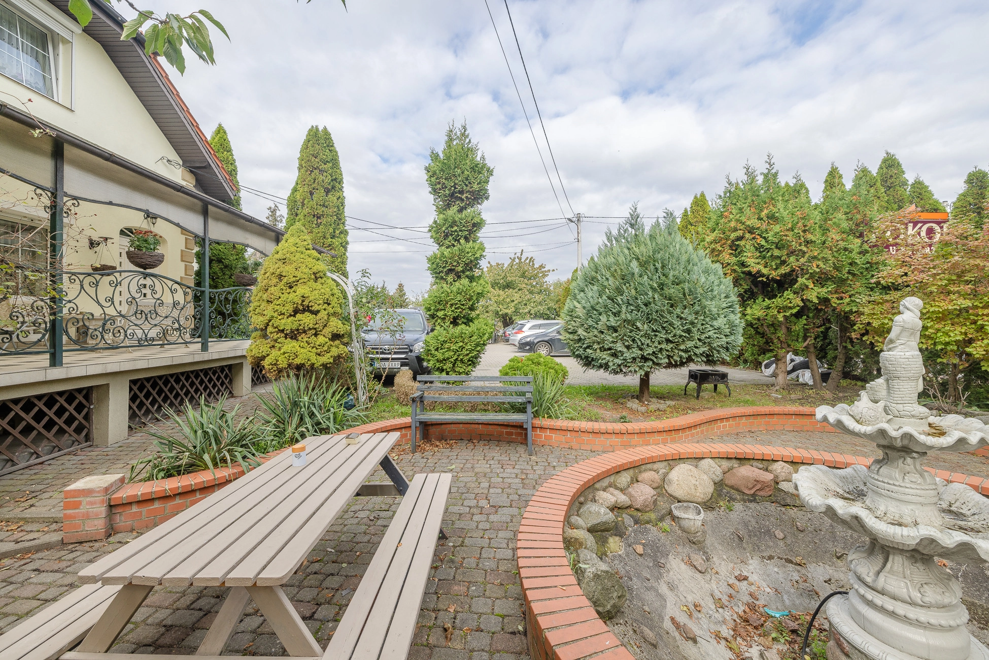 Pensjonat ogrodzony, zamykana brama wjazdowa, działka zagospodarowana z nasadzeniami, fontanną, ławeczkami, grillem, placem zabaw dla dzieci oraz miejscem na ognisko.