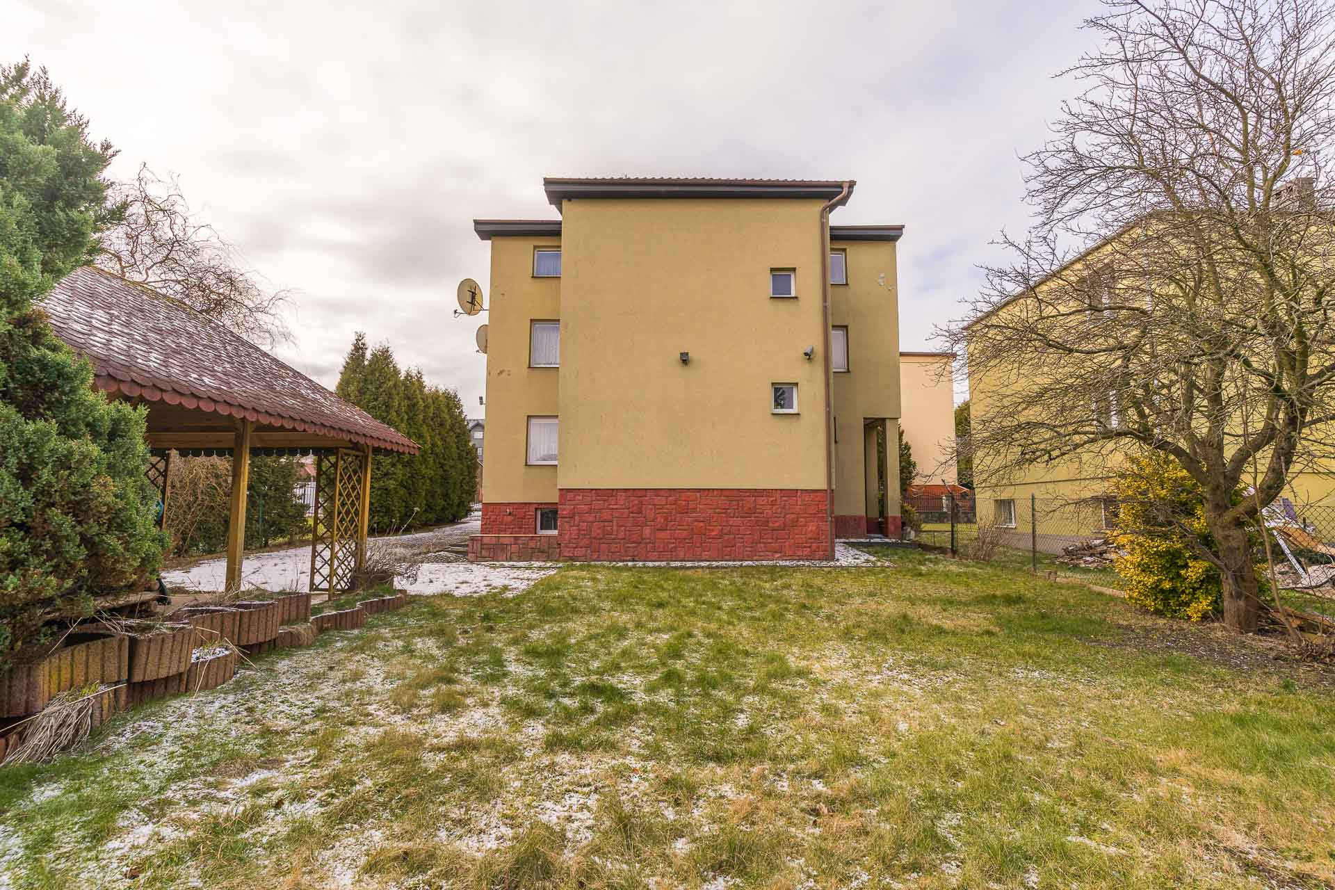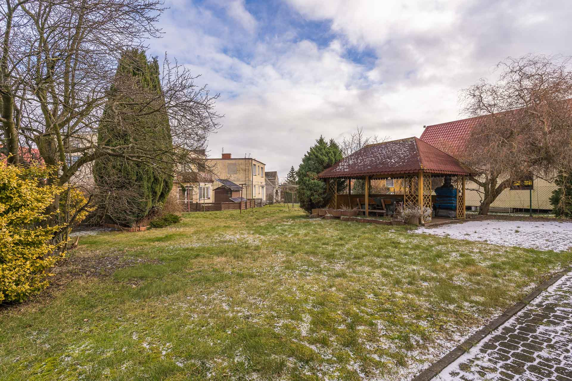 Budynek posadowiony na działce o powierzchni 655m2. Działka w kształcie prostokąta. Teren płaski, ogrodzony- z przodu brama kuta na podmurówce, w tylnej części siatka. Dojazd do działki drogą z kostki brukowej. Na działce znajduje się altana letnia z miejscem na grilla. Na działce miejsca postojowe dla dodatkowych samochodów gości. Media: prąd, kanalizacja i woda z sieci miejskiej+ gaz (w drodze przy budynku).