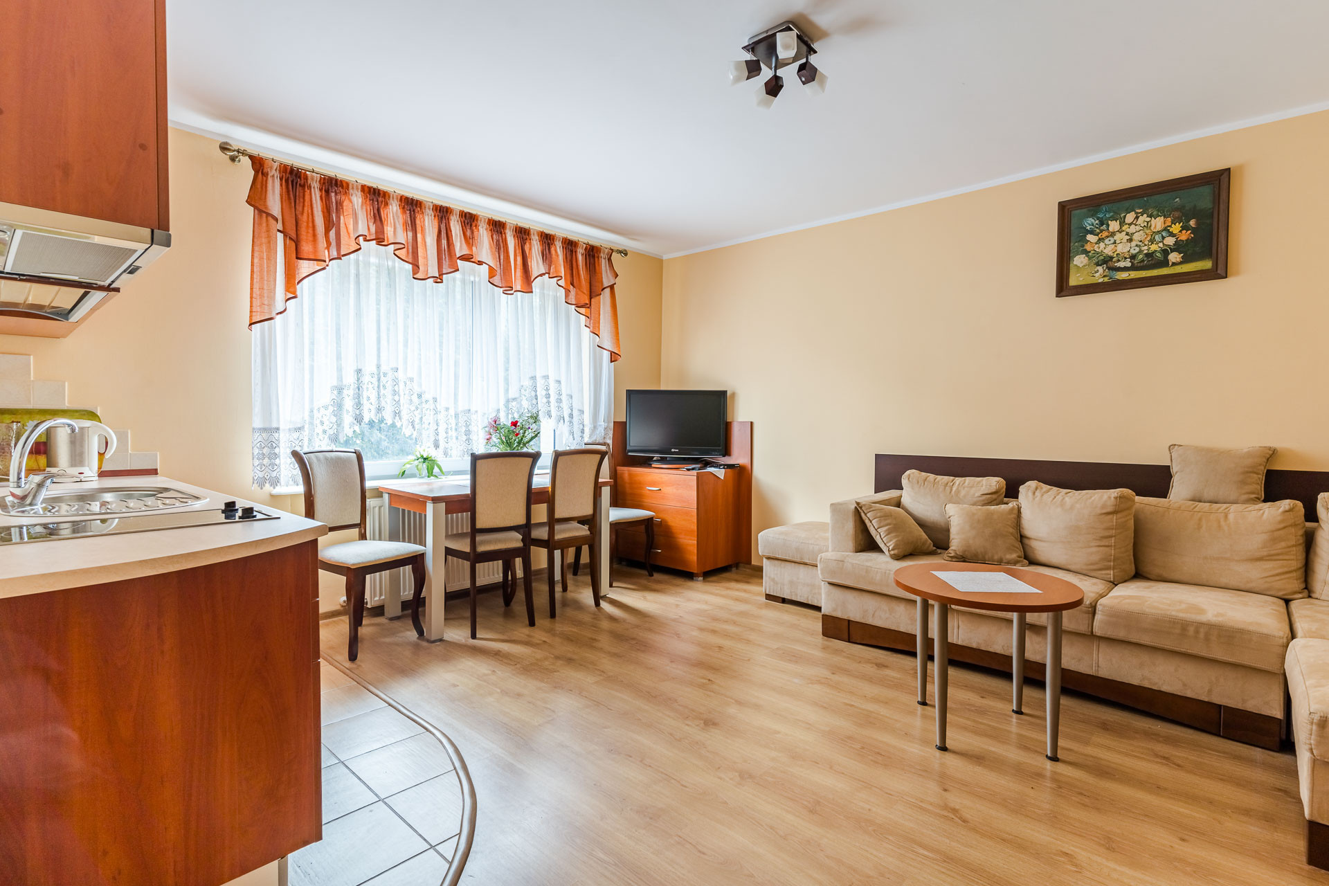 -Mieszkanie właściciela 80m2: salon z jadalnią, kuchnia, łazienka, sypialnia z łazienką
