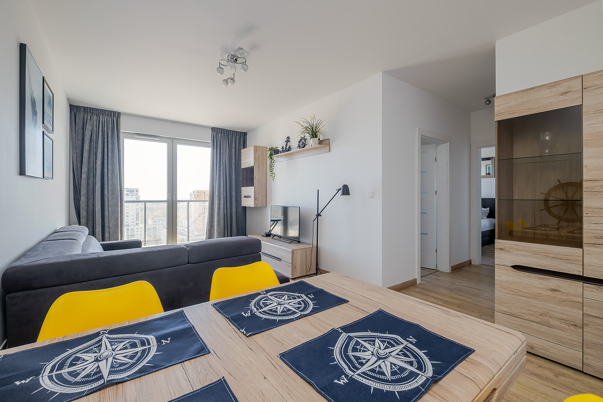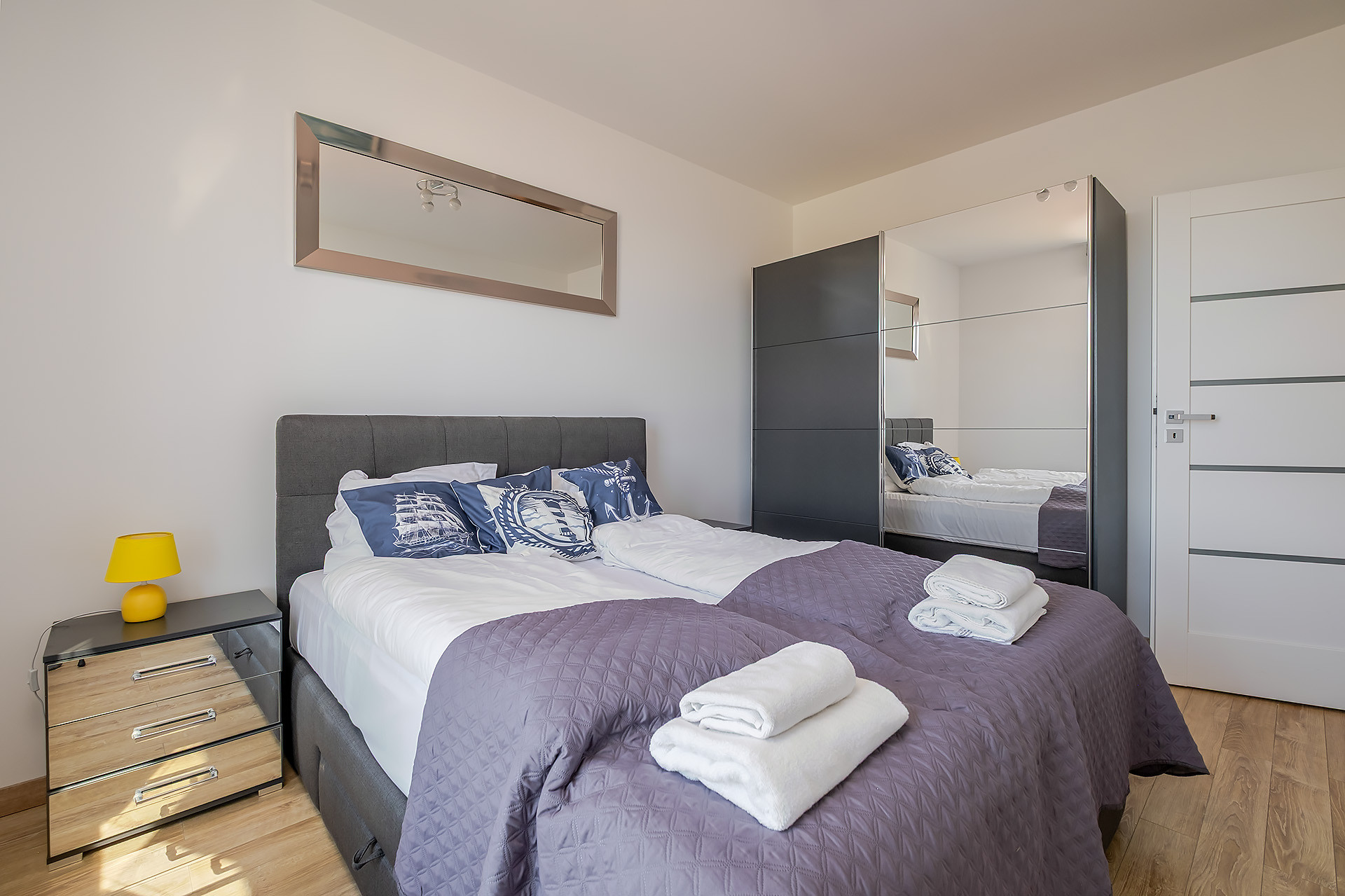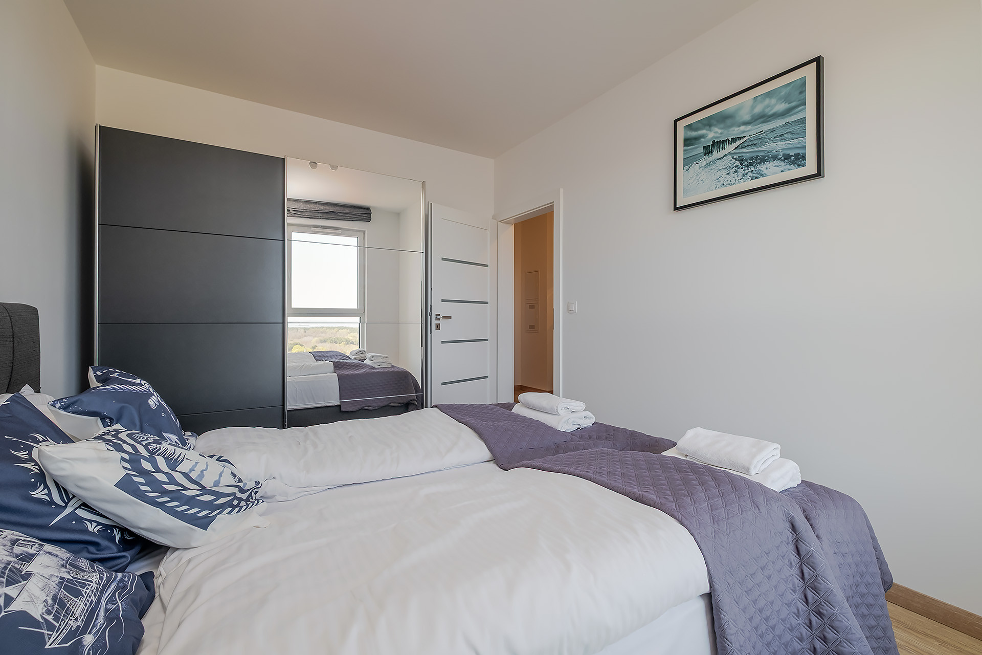 Lokal składa się z dużej sypialni, salonu z balkonem i pięknym widokiem na Park Regana i Zatokę Gdańską, osobnej kuchni oraz łazienki z prysznicem. Kuchnia wyposażona w lodówkę, piekarnik, płytę grzewczą, zmywarkę. Na wyposażeniu wszystko włącznie z meblami, odkurzaczem, żelaskiem, deską do prasowania i zestawem wypoczynkowym na balkon.