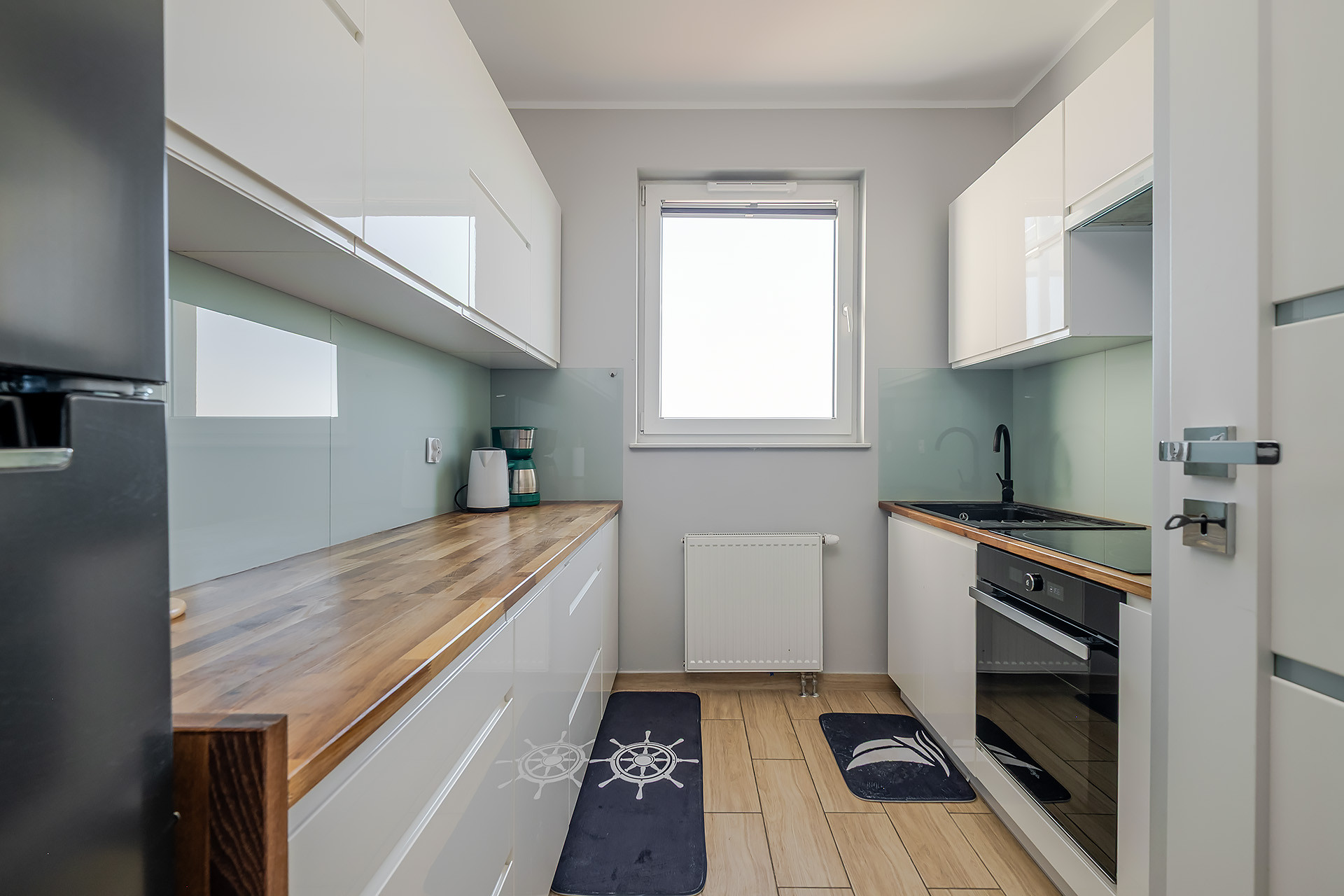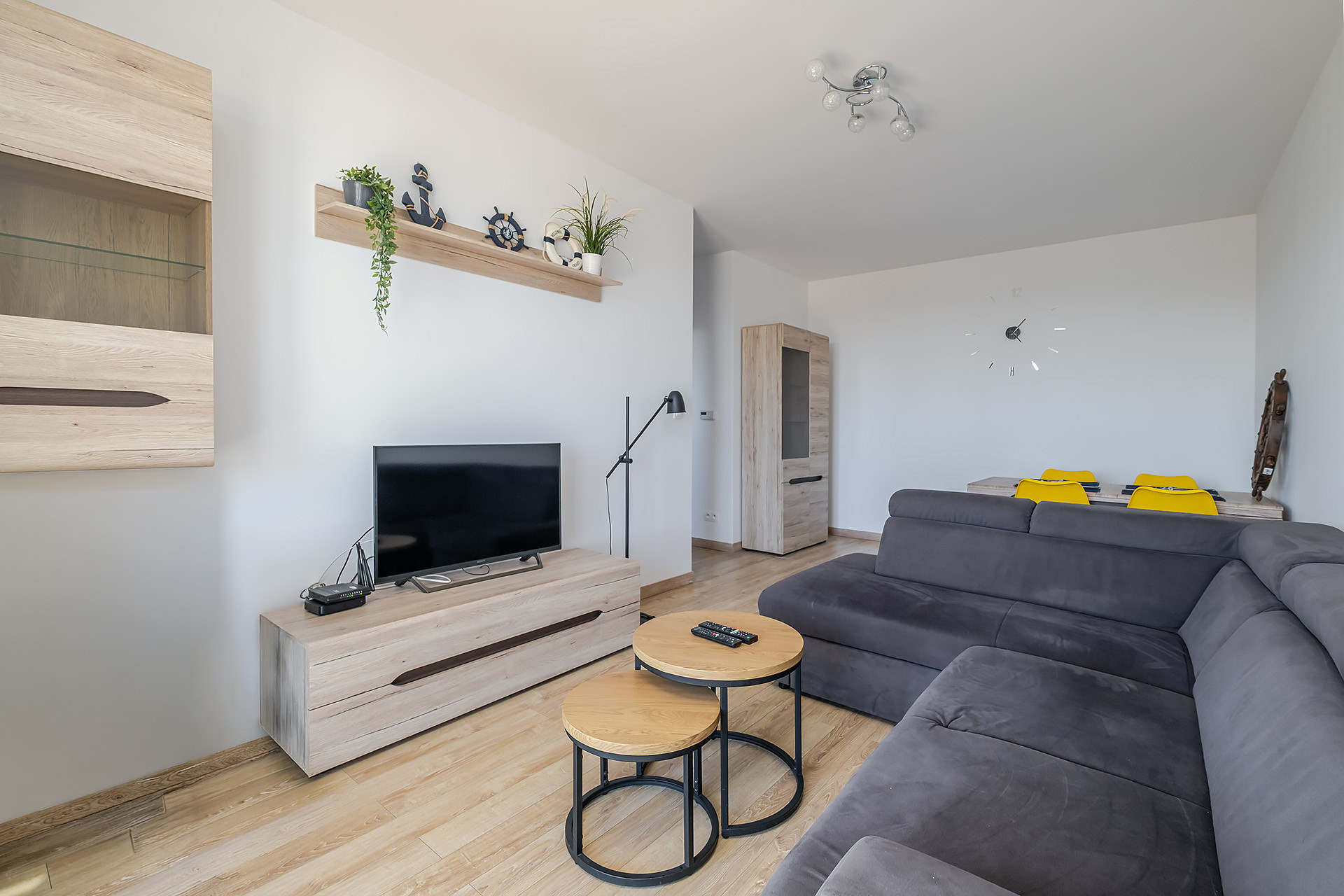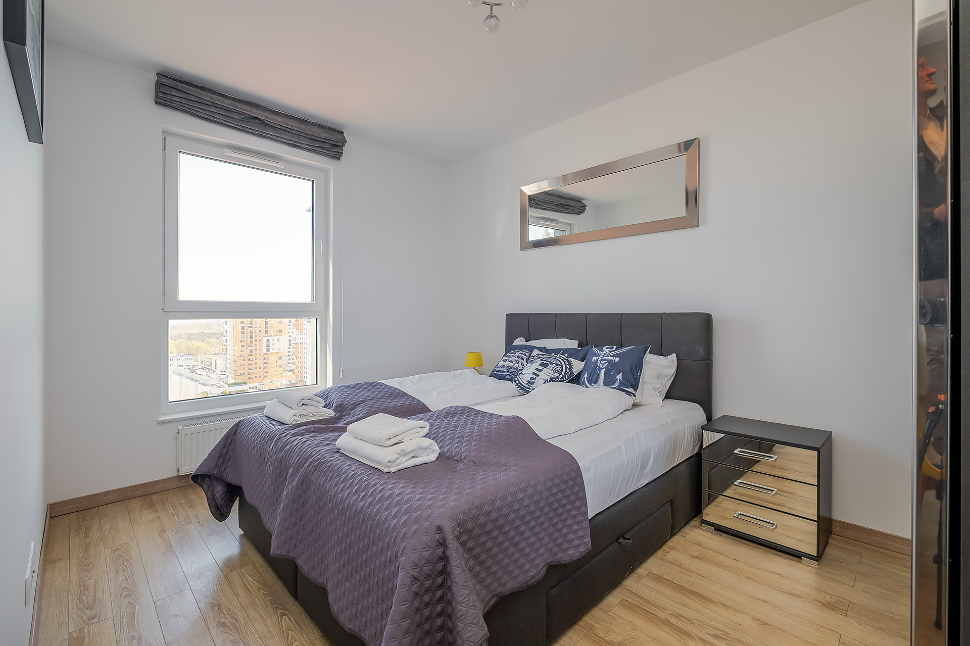 Lokal składa się z dużej sypialni, salonu z balkonem i pięknym widokiem na Park Regana i Zatokę Gdańską, osobnej kuchni oraz łazienki z prysznicem. Kuchnia wyposażona w lodówkę, piekarnik, płytę grzewczą, zmywarkę. Na wyposażeniu wszystko włącznie z meblami, odkurzaczem, żelaskiem, deską do prasowania i zestawem wypoczynkowym na balkon.