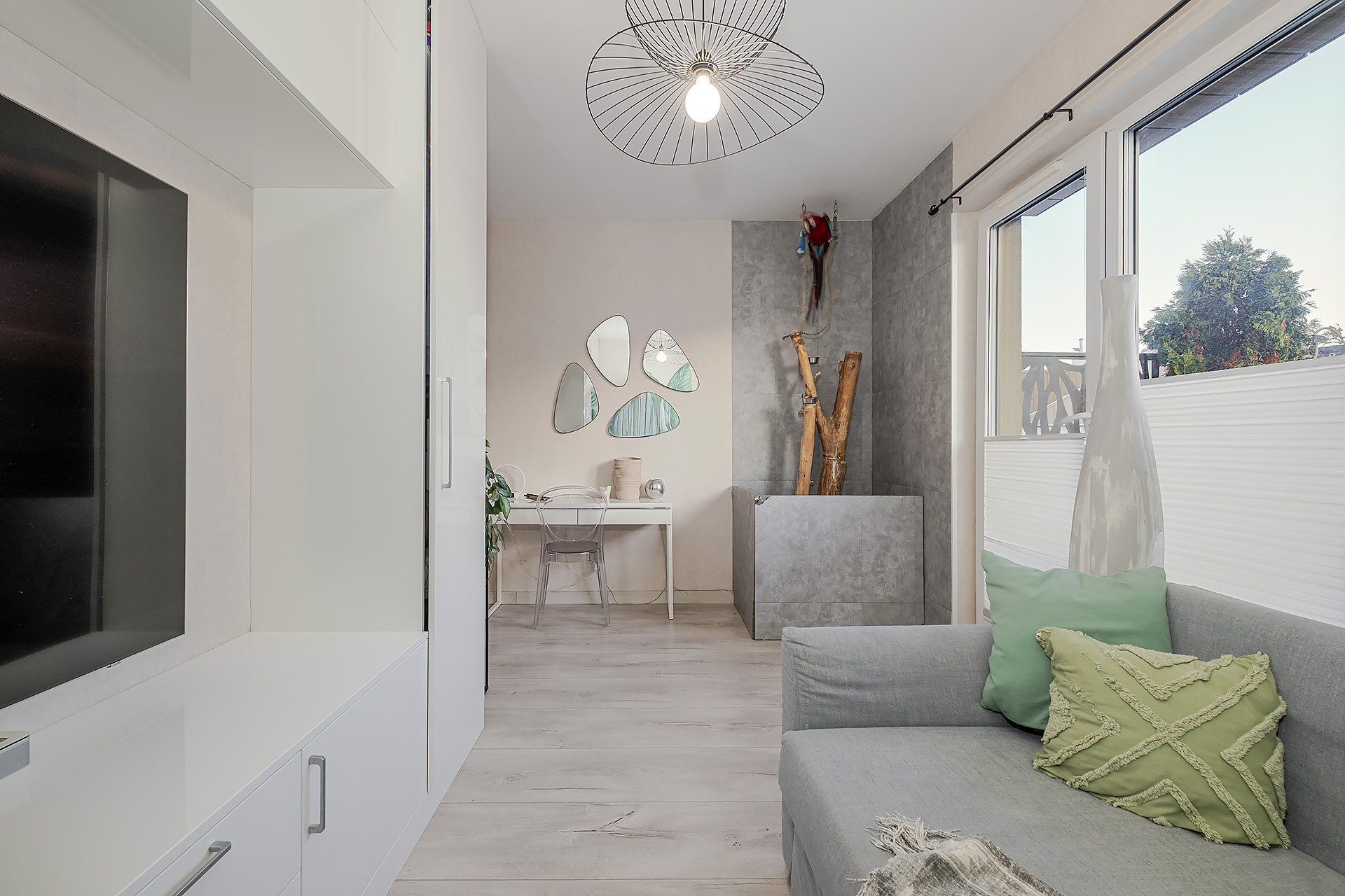 Nieruchomość zaprojektowana tak, by jak najlepiej wykorzystać przestrzeń. Panoramiczne okna sprawiają, że mieszkanie jest świetnie doświetlone, jasne i ciepłe. Kuchnia oraz zabudowy robione na zamówienie u stolarza. Mieszkanie wykończone ze smakiem z materiałów wysokiej jakości.