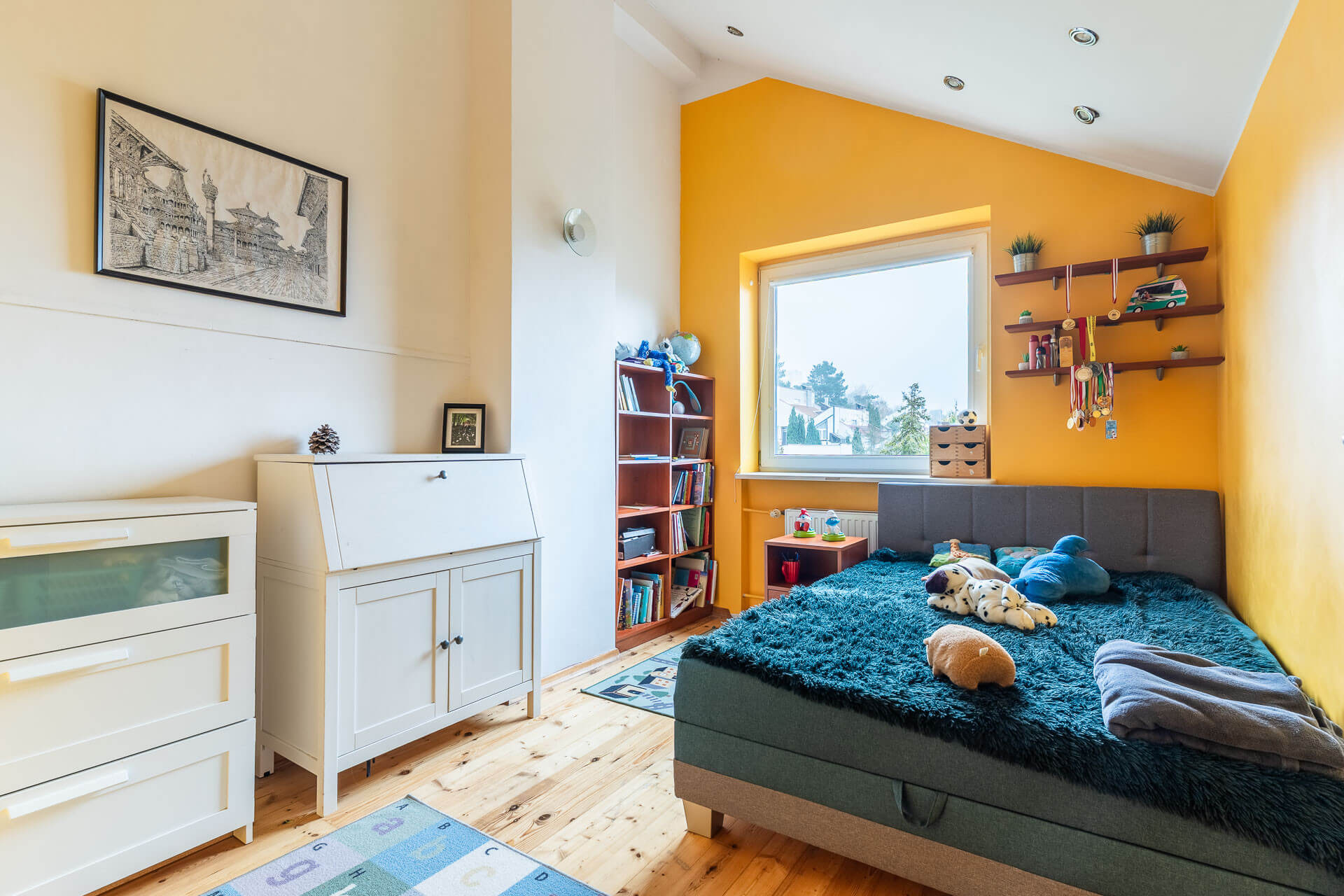 W skład domu wchodzi przestronny salon połączony z aneksem kuchennym, z którego jest bezpośrednie wyjście na ogród. Na pozostałych kondygnacjach znajduje się pięć sypialni, w tym dwie posiadające własne balkony, trzy łazienki oraz praktyczna garderoba. Dodatkowym atutem jest drugi, mniejszy ogródek znajdujący się z przodu nieruchomości, od strony wejścia do domu.