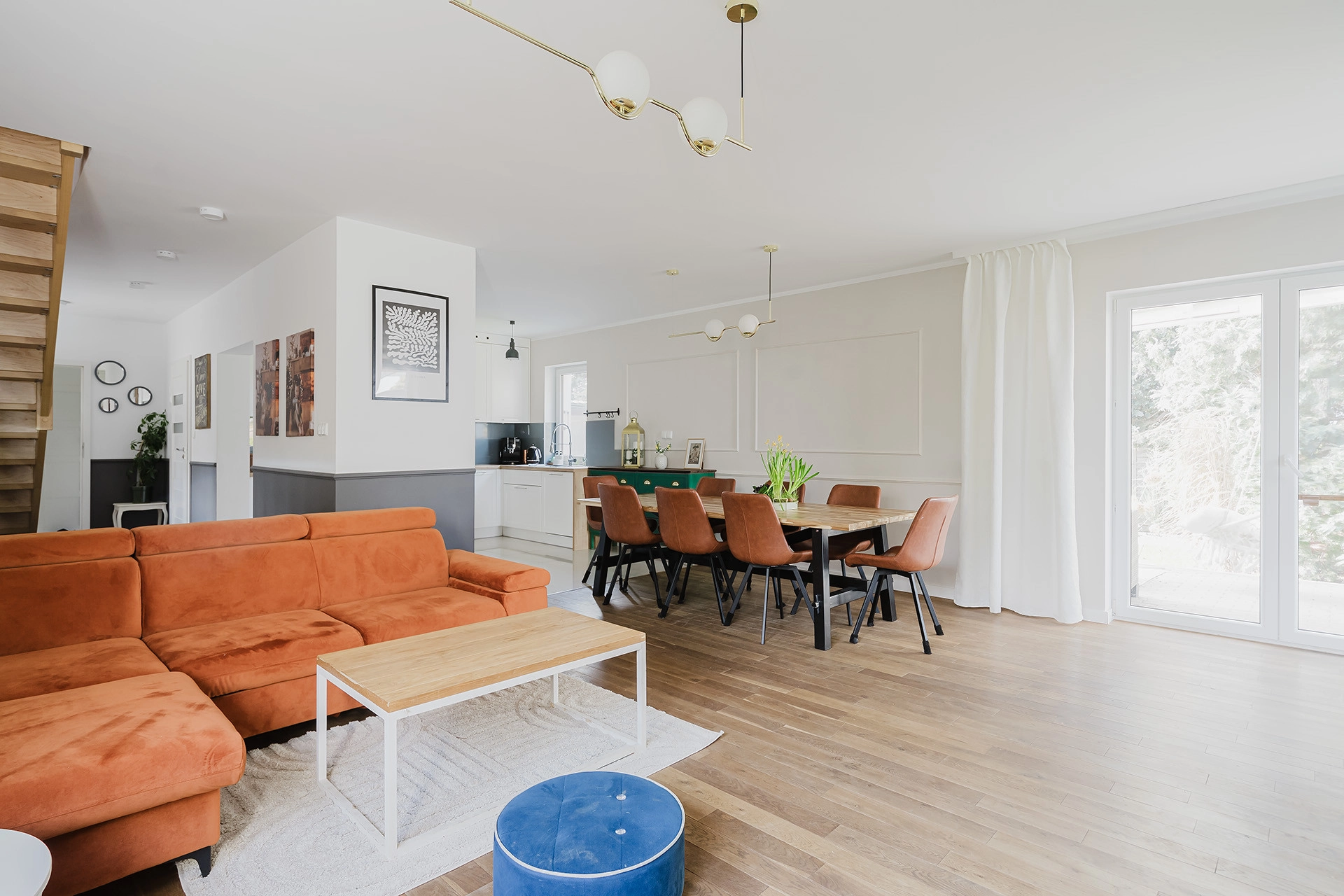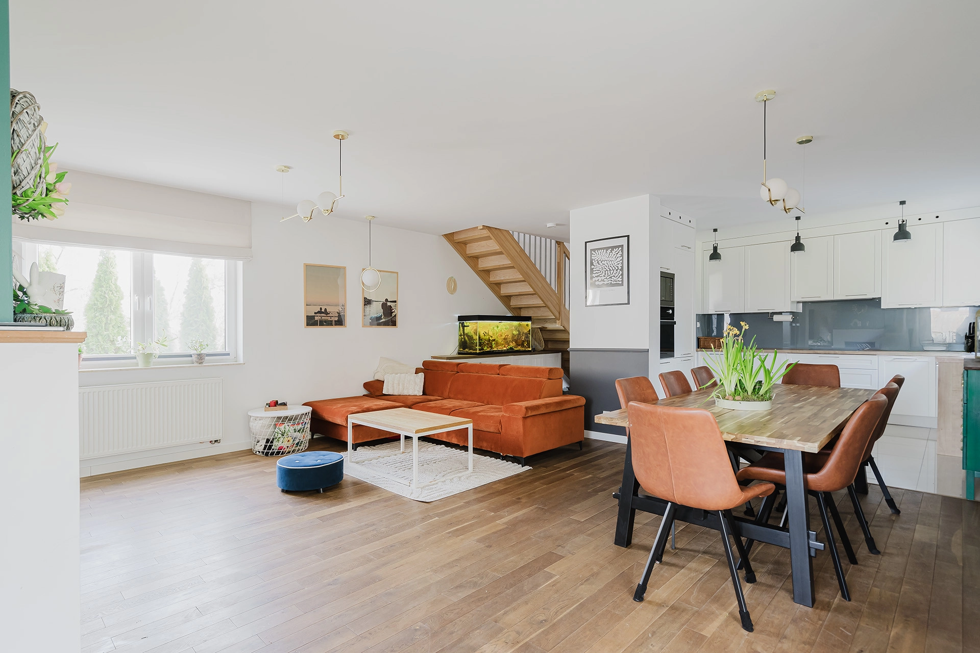 ✅ Wysoki standard wykończenia – deski dębowe, barlineckie, drewniane schody, zabudowa kuchenna na wymiar, sprzęt AGD wysokiej jakości.
