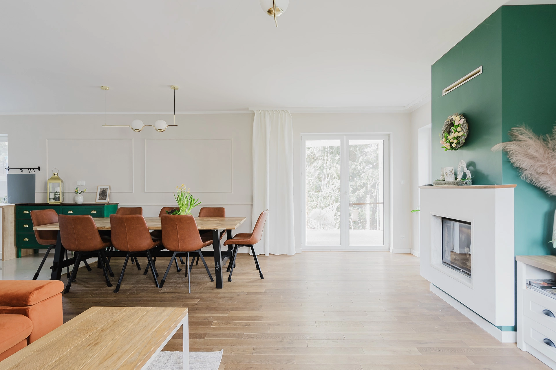 * Salon z aneksem kuchennym (42,6 m²) – elegancka przestrzeń dzienna z kominkiem, który nadaje przytulności.