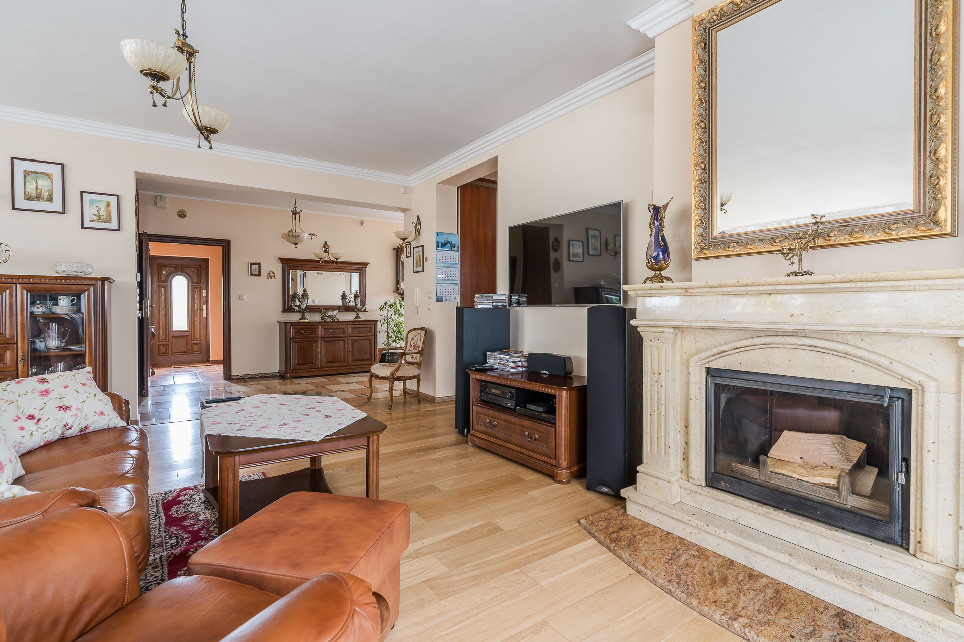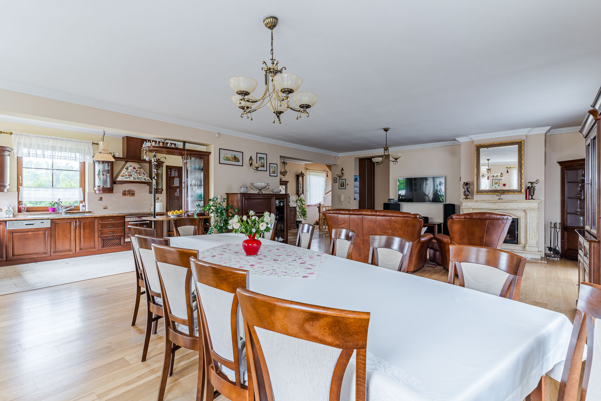 Jednym z kluczowych atutów tej nieruchomości jest przestronny, otwarty układ wnętrz, wykończony z dbałością o detale oraz wykorzystaniem materiałów najwyższej klasy. Na podłogach znajduje się dębowa deska, która nadaje wnętrzom ciepła i elegancji. Kuchnia została zaprojektowana z myślą o funkcjonalności i estetyce – znajdziemy tu drewnianą zabudowę stolarską, granitowe blaty oraz marmurowe kafle, które podkreślają prestiż wykończenia.