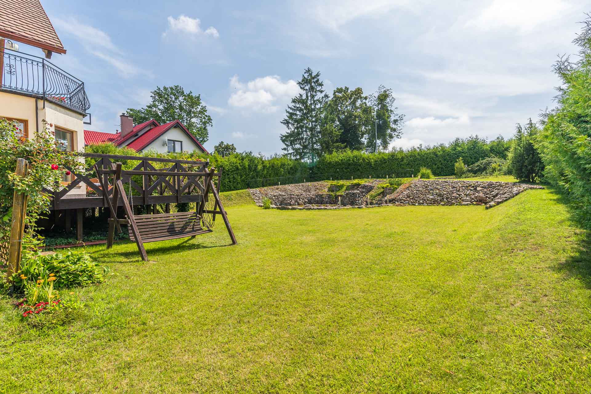 DZIAŁKA: Przedmiotem oferty jest słoneczna i starannie zagospodarowana działka o powierzchni 1 842 m2, stanowi miejsce pełne komfortu, prywatności i relaksu. Na działce znajdują się liczne, starannie nasadzenia roślin.