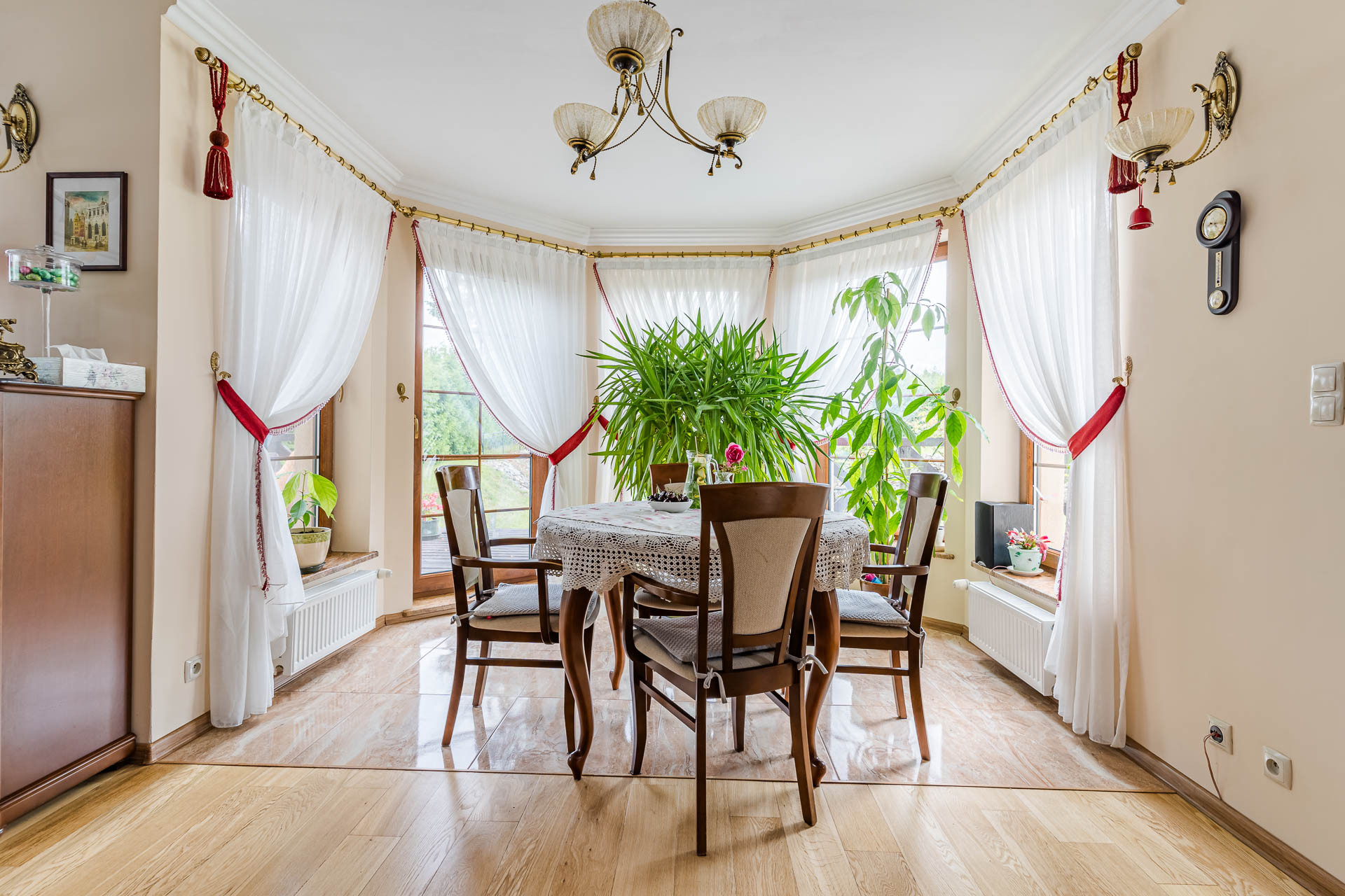 Jednym z kluczowych atutów tej nieruchomości jest przestronny, otwarty układ wnętrz, wykończony z dbałością o detale oraz wykorzystaniem materiałów najwyższej klasy. Na podłogach znajduje się dębowa deska, która nadaje wnętrzom ciepła i elegancji. Kuchnia została zaprojektowana z myślą o funkcjonalności i estetyce – znajdziemy tu drewnianą zabudowę stolarską, granitowe blaty oraz marmurowe kafle, które podkreślają prestiż wykończenia.