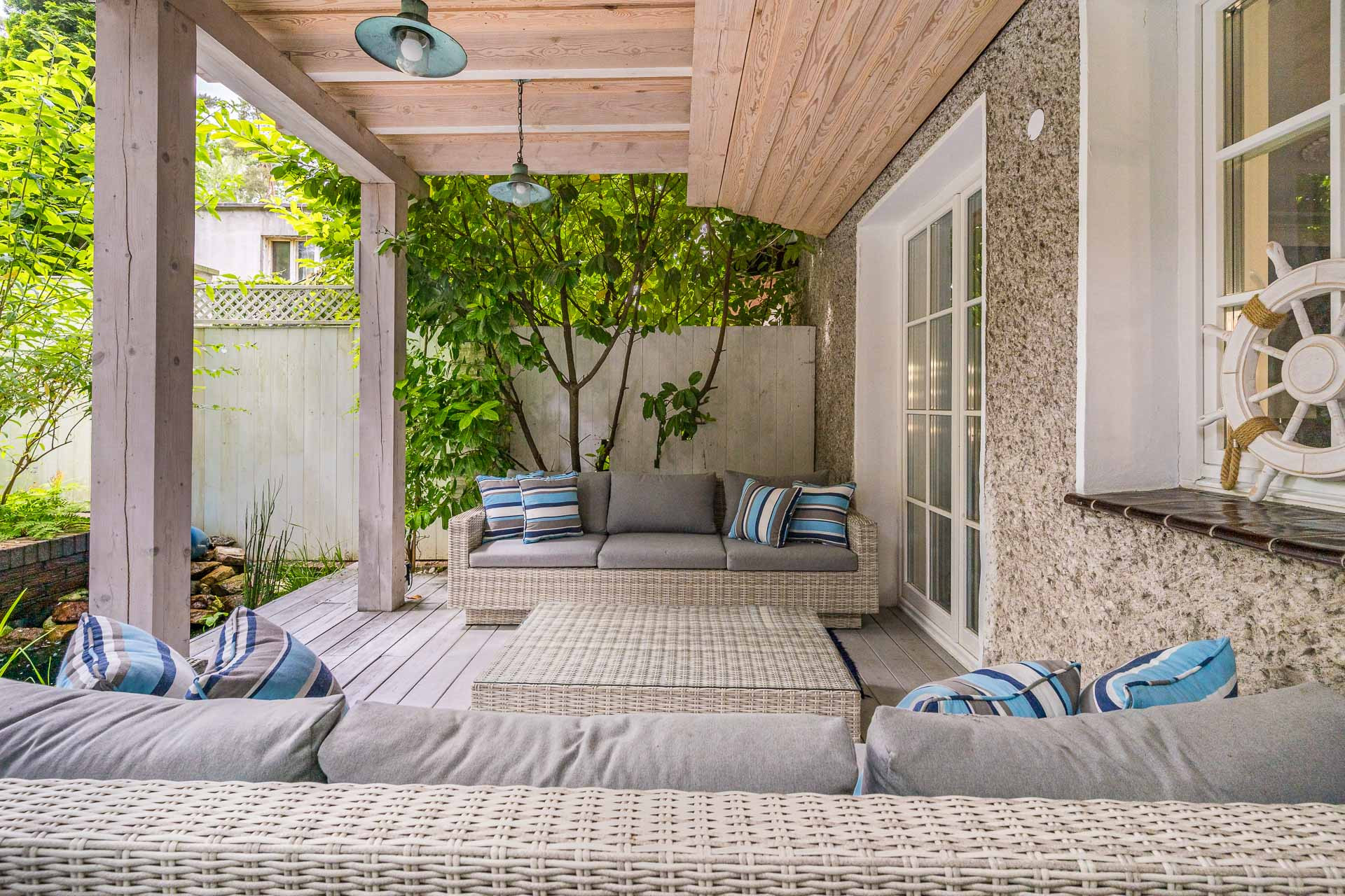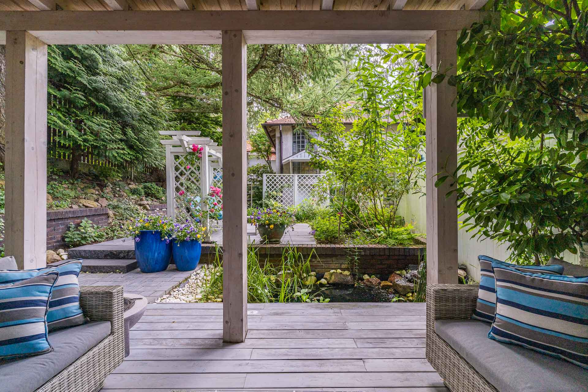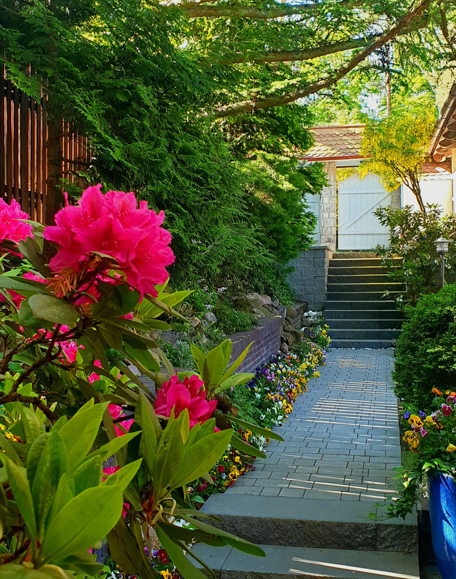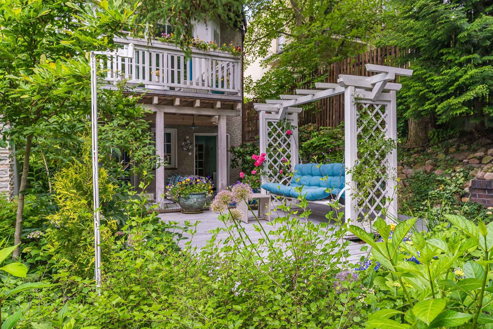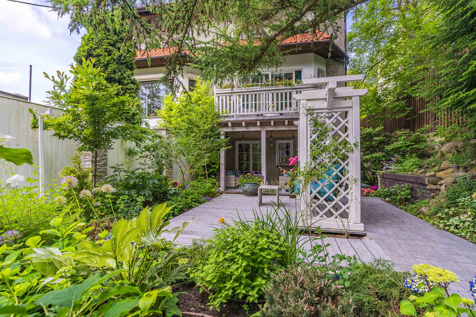 Niebywałym atutem całej nieruchomości jest jej magiczny ogród przenoszący nas w inny, spokojny świat. Szum niewielkiej fontanny w oczku wodnym, modrzewiowych gałęzi, czy krzewu rododendronu, to tylko niektóre elementy, które z pewnością przykują uwagę odwiedzających. Całość o lekko nachylonym, kaskadowym układzie, co dodatkowo podkreśla wyjątkowość znajdujących się tam kompozycji przestrzennych. W takim miejscu nie sposób się nie zrelaksować i zapomnieć o troskach życia codziennego – tutaj chcąc nie chcąc się odpoczywa!
