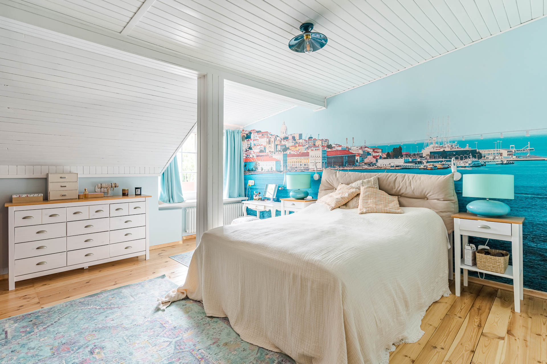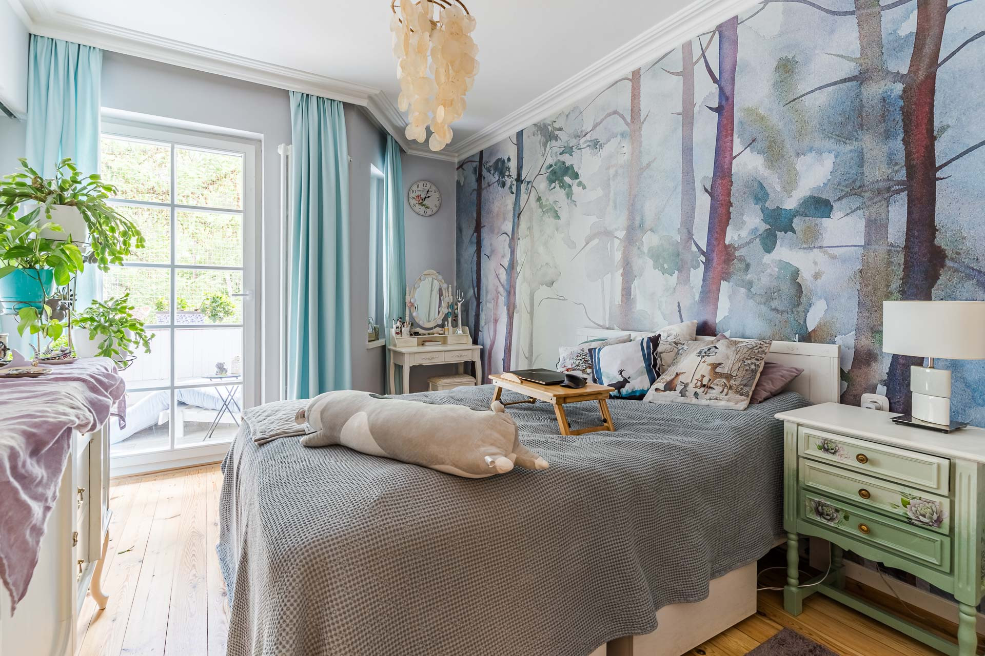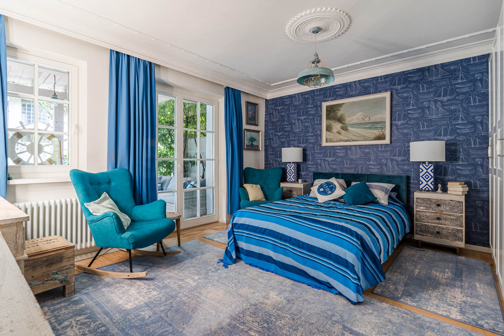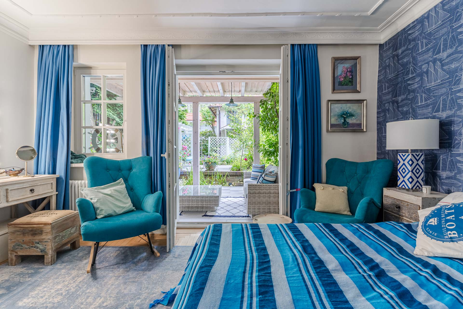 – pokój (17,40 m2) z wyjściem na taras, gdzie możemy zrelaksować się przy szumie wody z oczka wodnego jednocześnie podziwiając ogrodową roślinność,