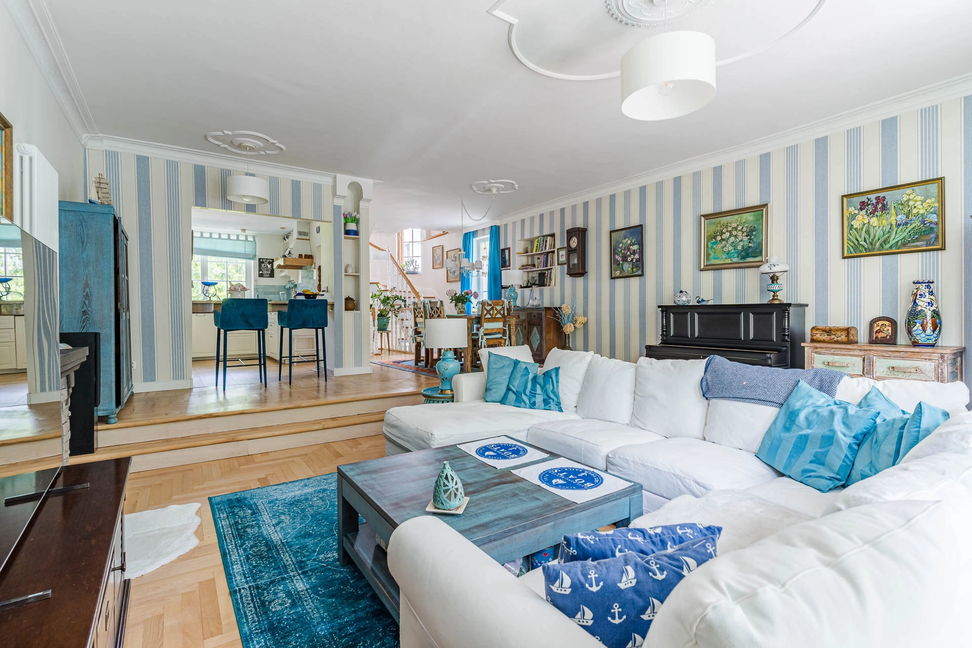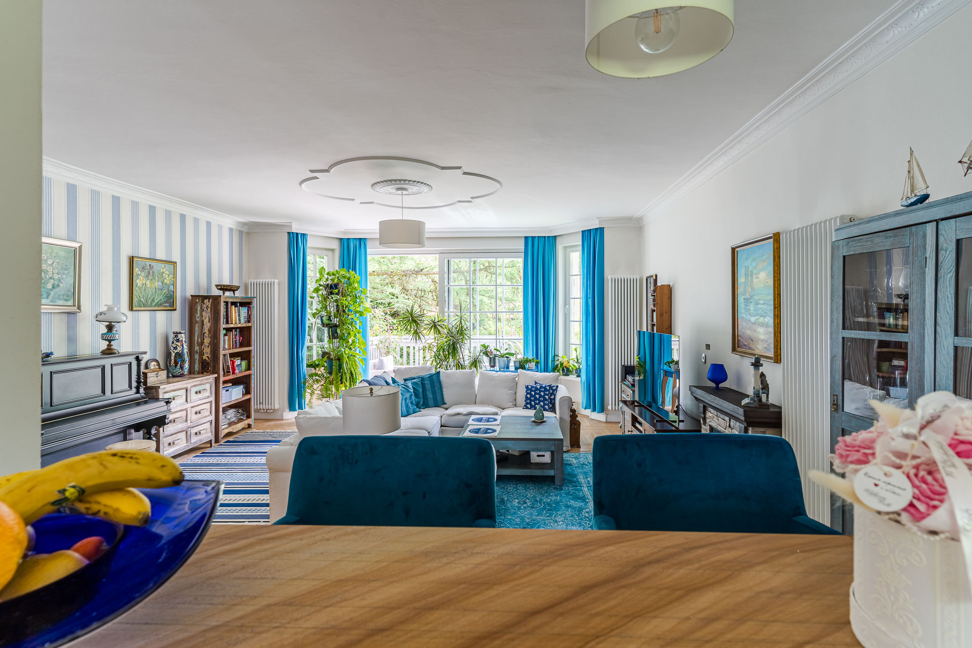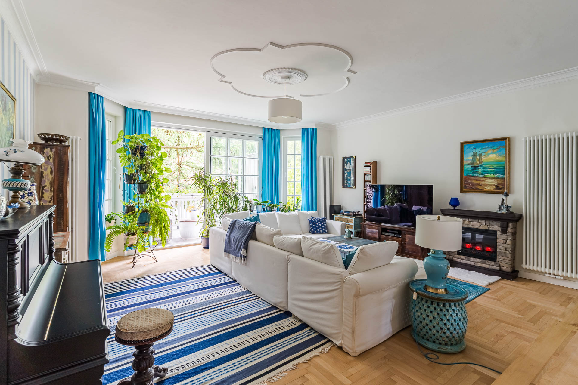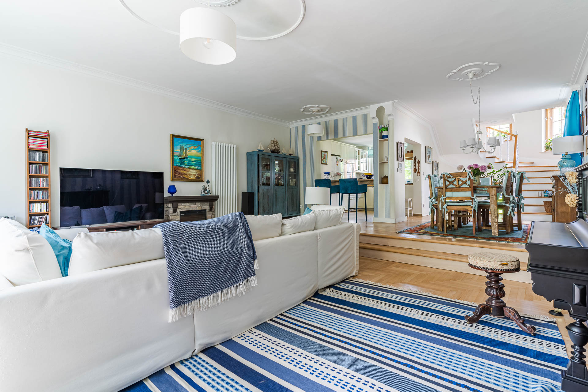 – salon (46,50 m2) z wyjściem na taras, z którego rozpościera się widok na ogród i okoliczne drzewa; bardzo duża powierzchnia tego pokoju spotęgowana jest dodatkowo jego ponad 3-metrową wysokością, co czyni go niesamowicie przestrzennym,