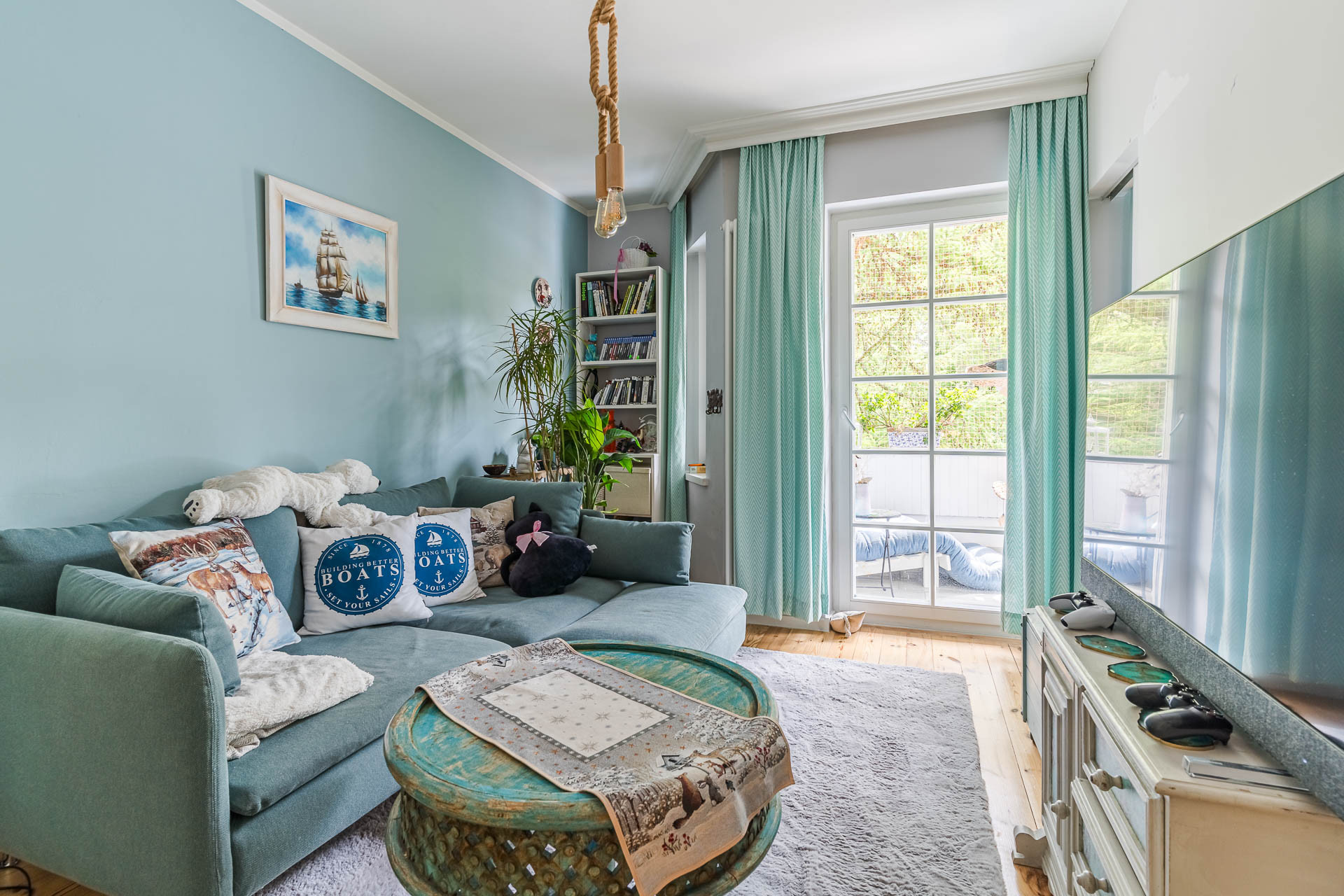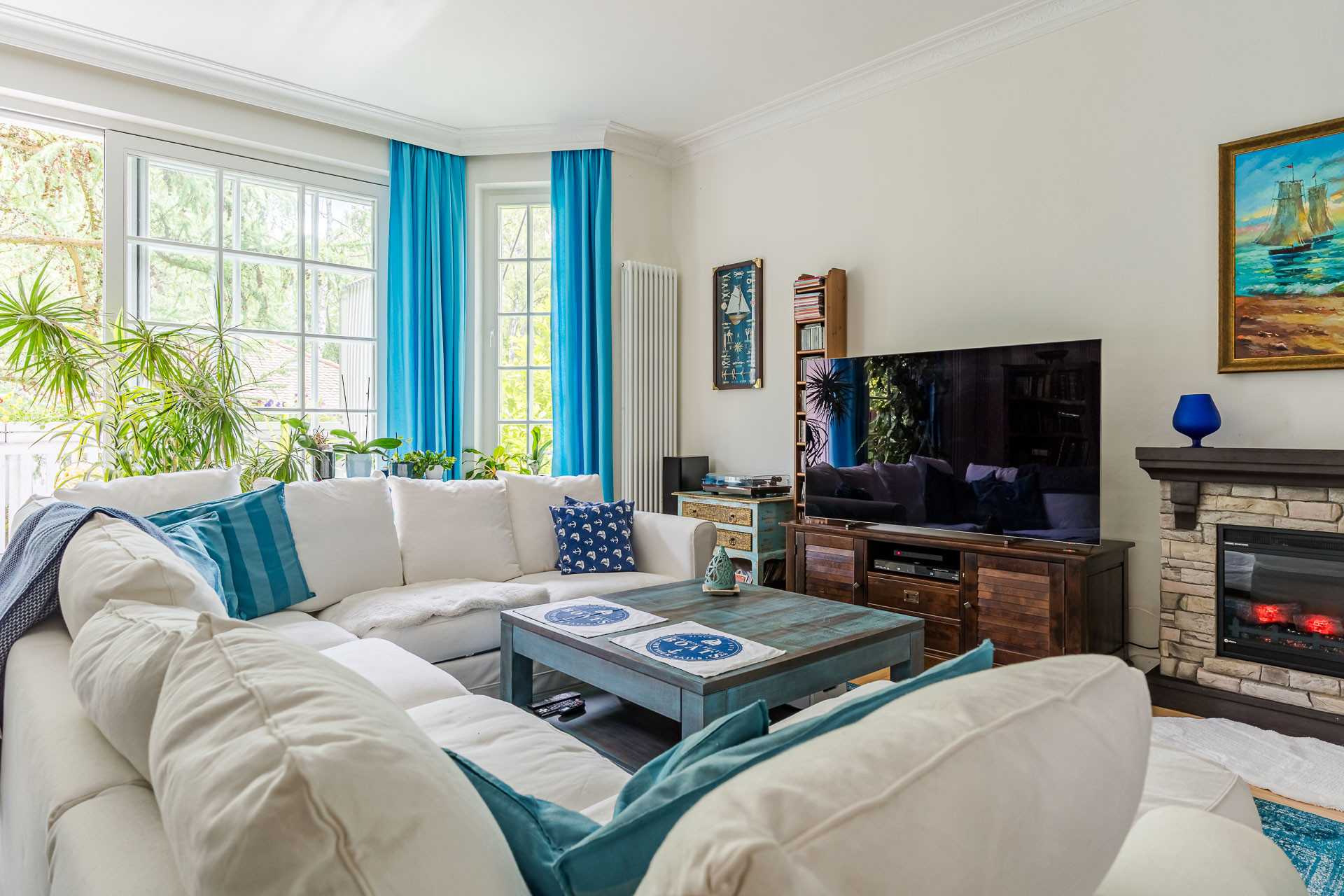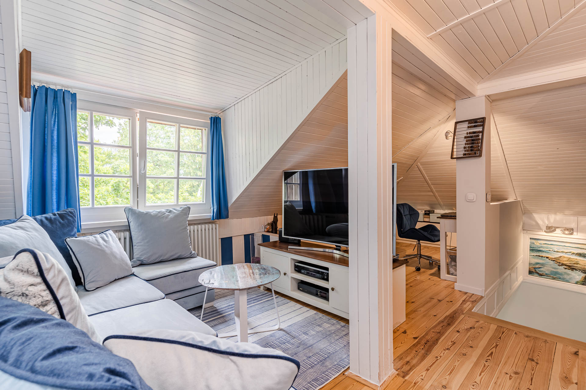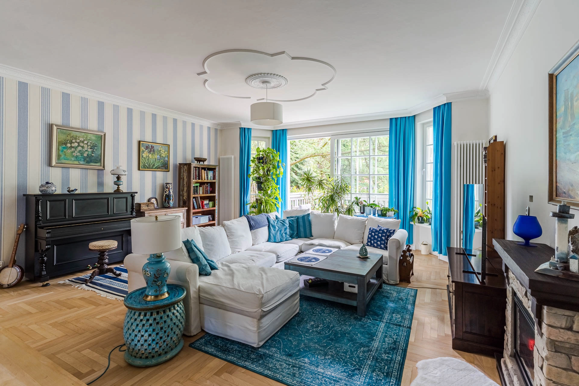– salon (46,50 m2) z wyjściem na taras, z którego rozpościera się widok na ogród i okoliczne drzewa; bardzo duża powierzchnia tego pokoju spotęgowana jest dodatkowo jego ponad 3-metrową wysokością, co czyni go niesamowicie przestrzennym,