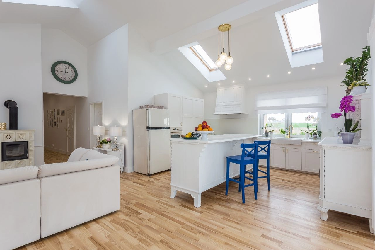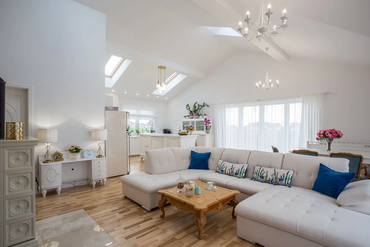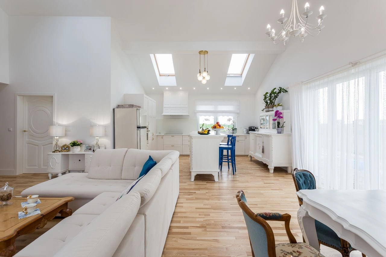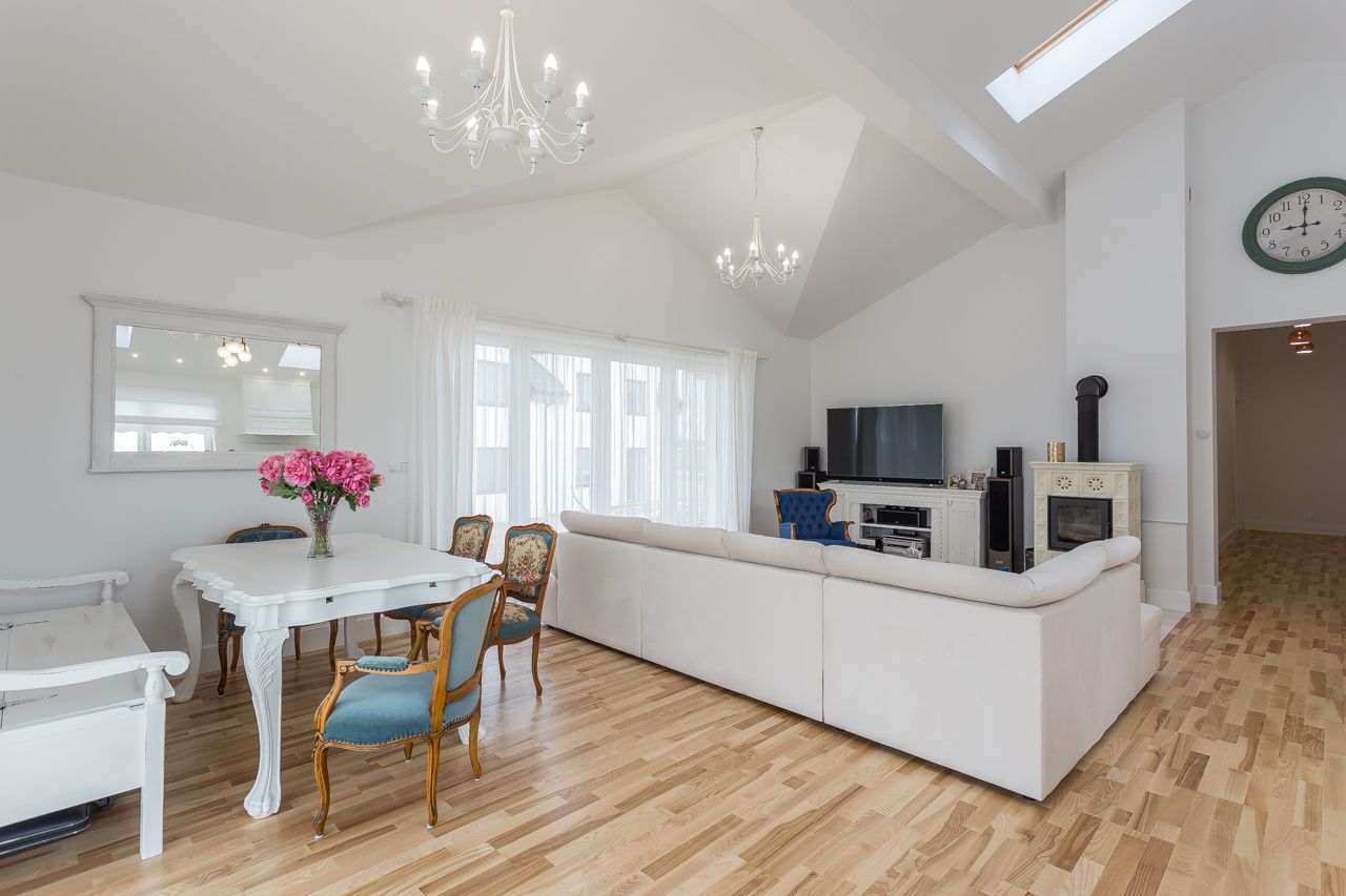 Dom zaprojektowany w bardzo przemyślany sposób. Posiada wysoki salon na ponad 4,5 m z oknami połaciowymi sterowanymi na pilota, które doskonale doświetlają przestrzeń. Wrażenie przestronności potęgują białe ściany i kontrastująca podłoga wykonana z deski barlineckiej.