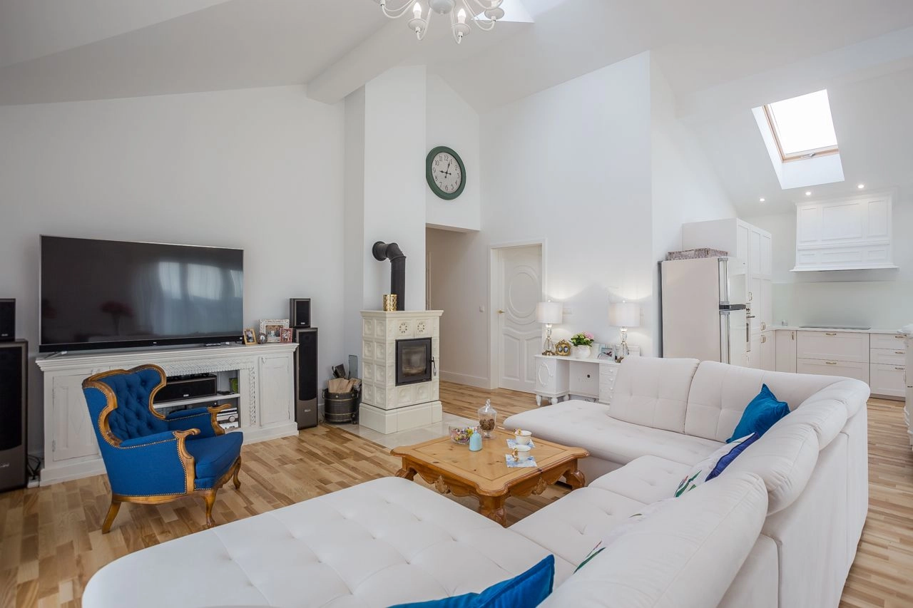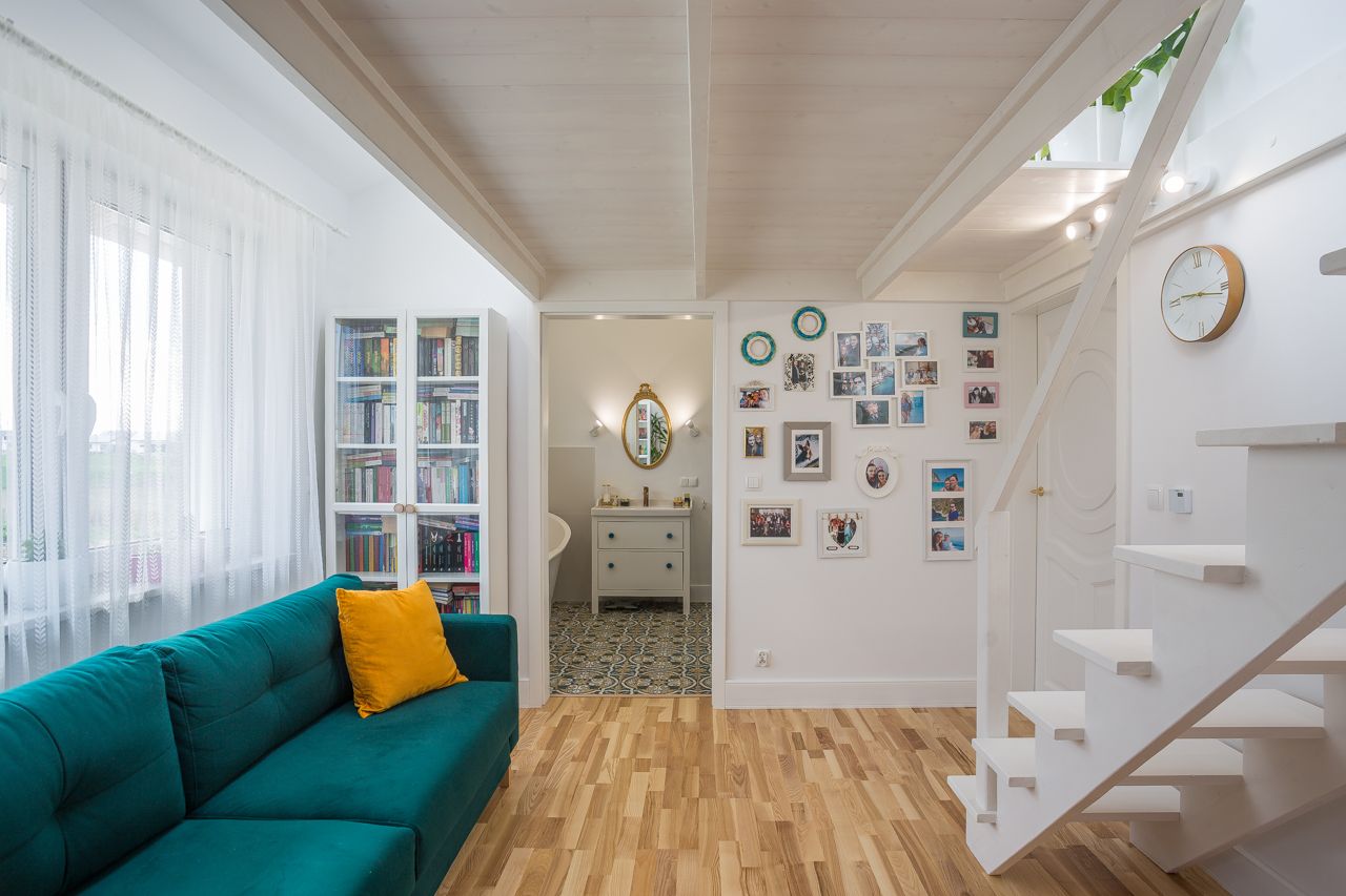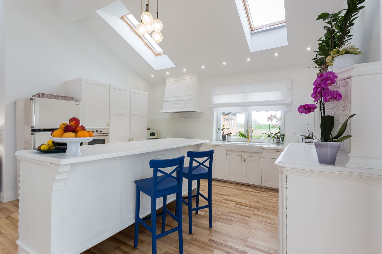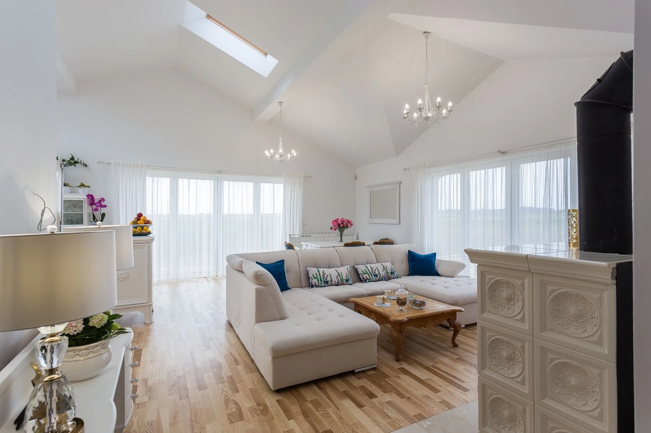 Dom zaprojektowany w bardzo przemyślany sposób. Posiada wysoki salon na ponad 4,5 m z oknami połaciowymi sterowanymi na pilota, które doskonale doświetlają przestrzeń. Wrażenie przestronności potęgują białe ściany i kontrastująca podłoga wykonana z deski barlineckiej.