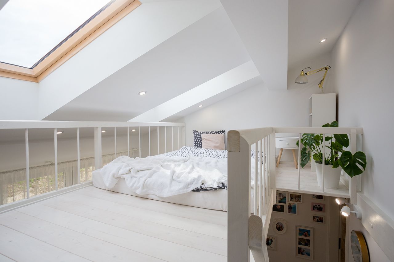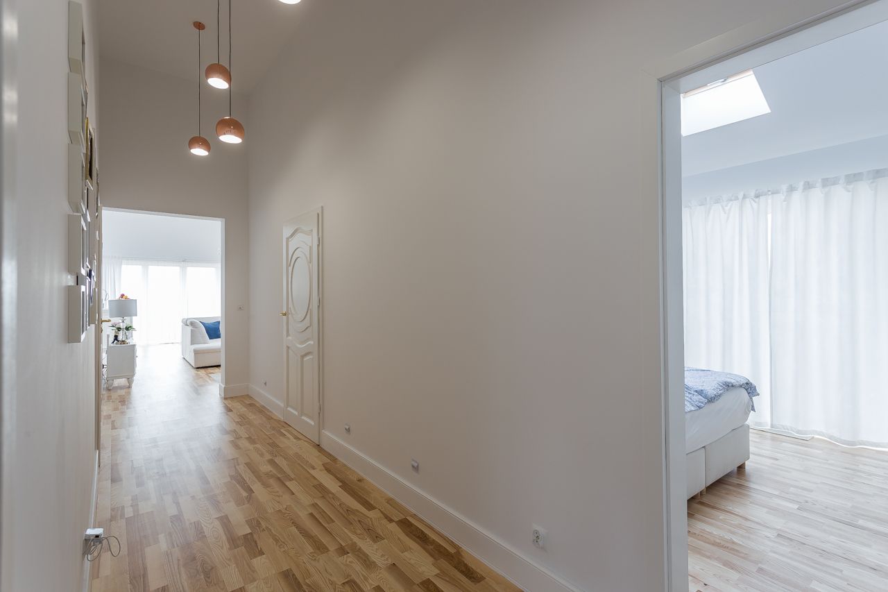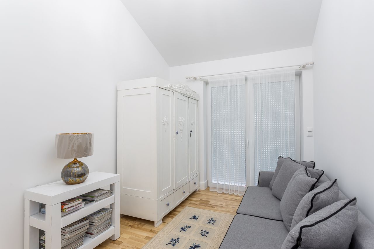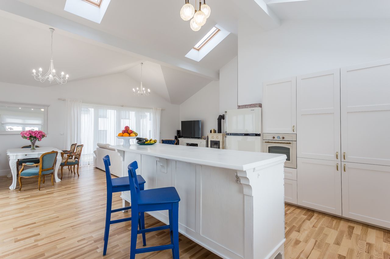 Dom zaprojektowany w bardzo przemyślany sposób. Posiada wysoki salon na ponad 4,5 m z oknami połaciowymi sterowanymi na pilota, które doskonale doświetlają przestrzeń. Wrażenie przestronności potęgują białe ściany i kontrastująca podłoga wykonana z deski barlineckiej.