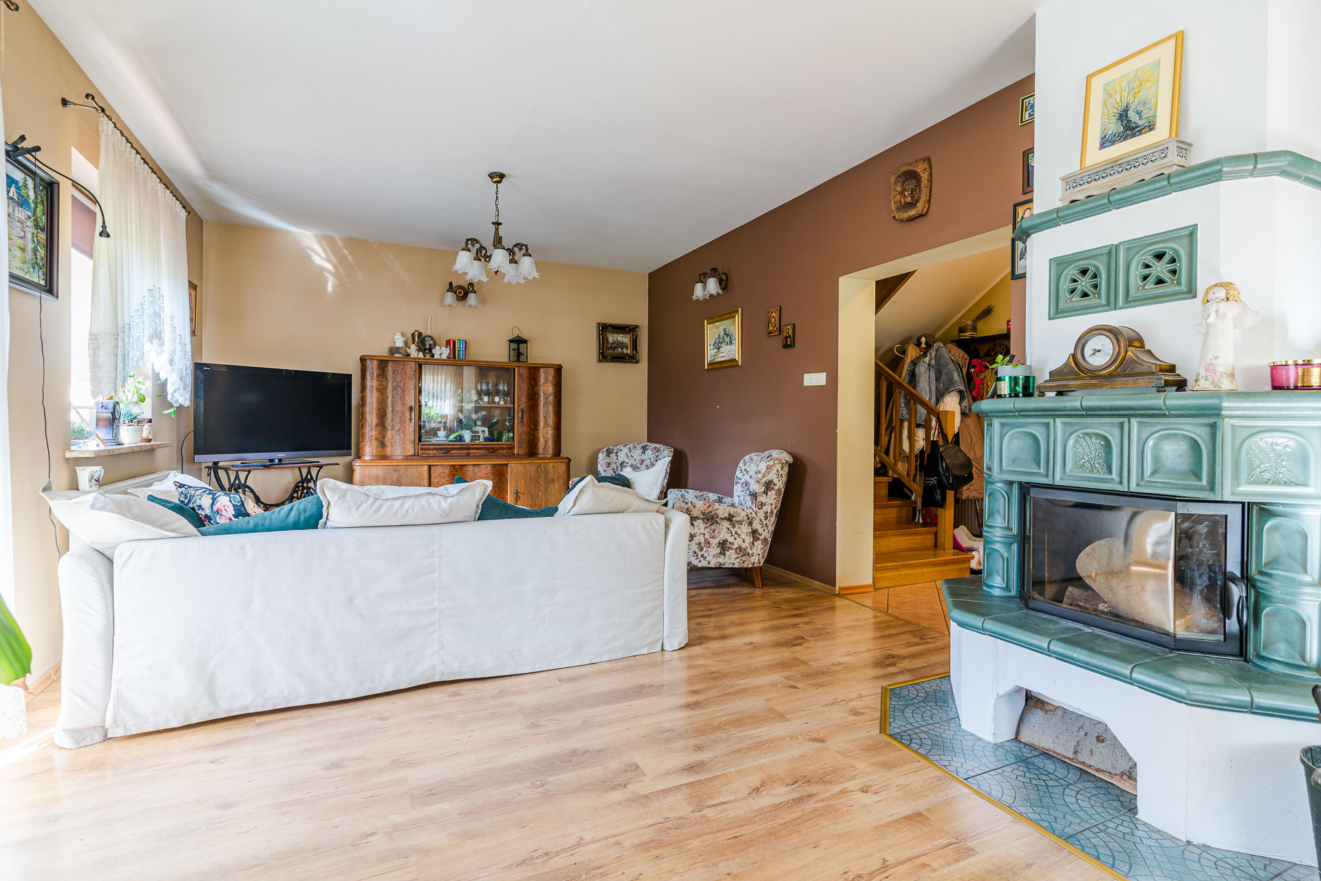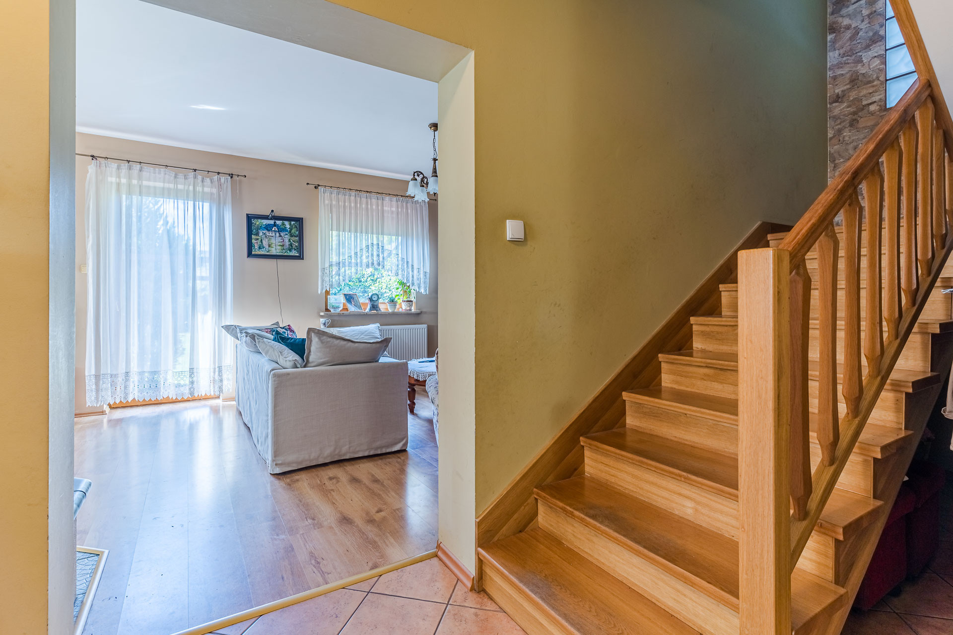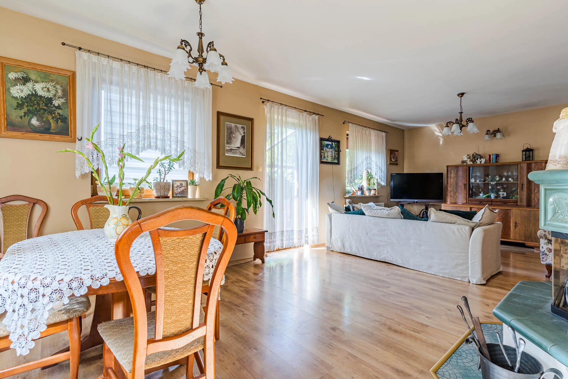 – salon (ok 32 m/2) z bezpośrednim wyjściem na taras i ogród