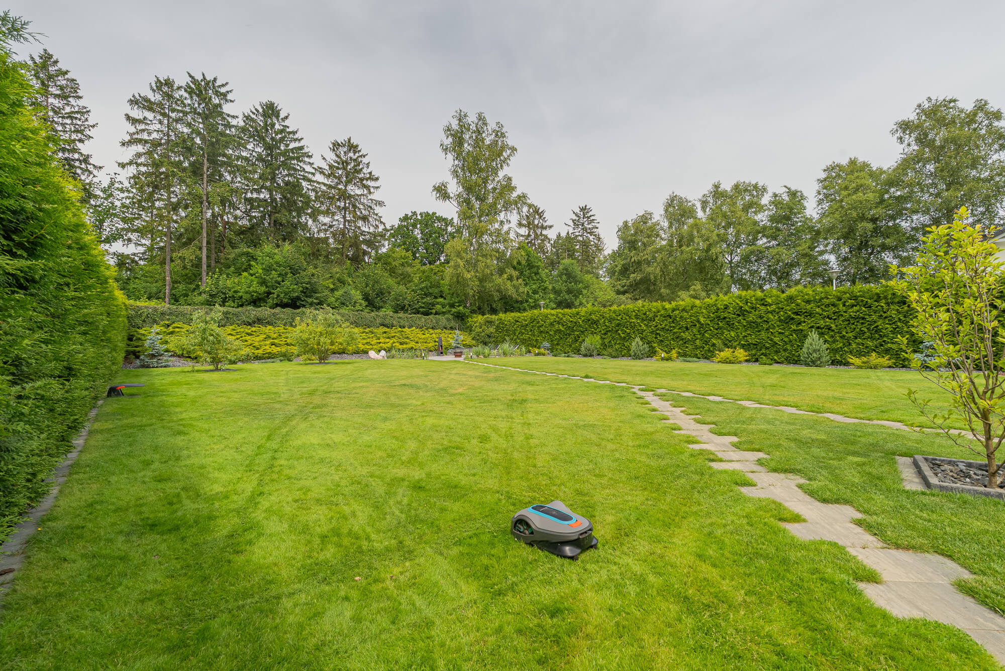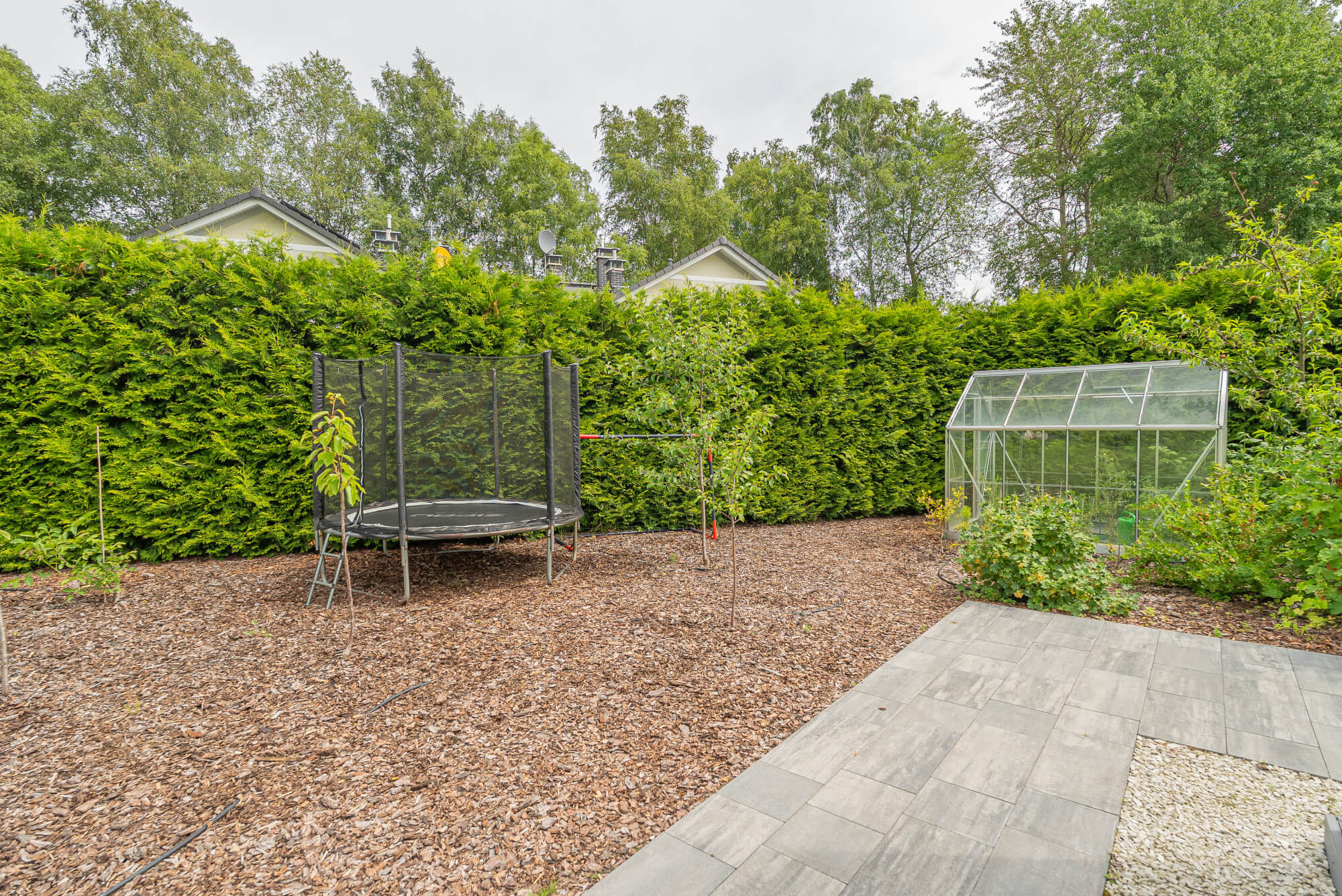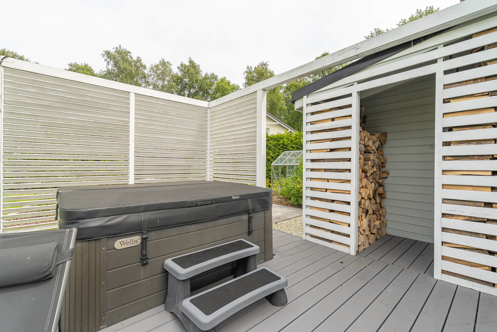 Drewniany taras o powierzchni około 90 m² oraz dodatkowy taras z betonowych płyt, liczący około 70 m², wyposażony w palenisko i kominek. Dopełnieniem strefy wypoczynkowej jest sześcioosobowe, podświetlane jacuzzi marki Wellis, wyposażone w cztery głośniki oraz funkcję ozonowania. Działka jest zadbana i łatwa w utrzymaniu dzięki robotowi koszącemu marki Gardena oraz automatycznemu systemowi podlewania. Na posesji znajduje się praktyczne pomieszczenie gospodarcze z drewutnią, idealne do przechowywania narzędzi i opału. W ogrodzie wydzielono również część przeznaczoną na sad ze szklarnią, co stwarza doskonałe warunki do uprawy roślin i własnych owoców.