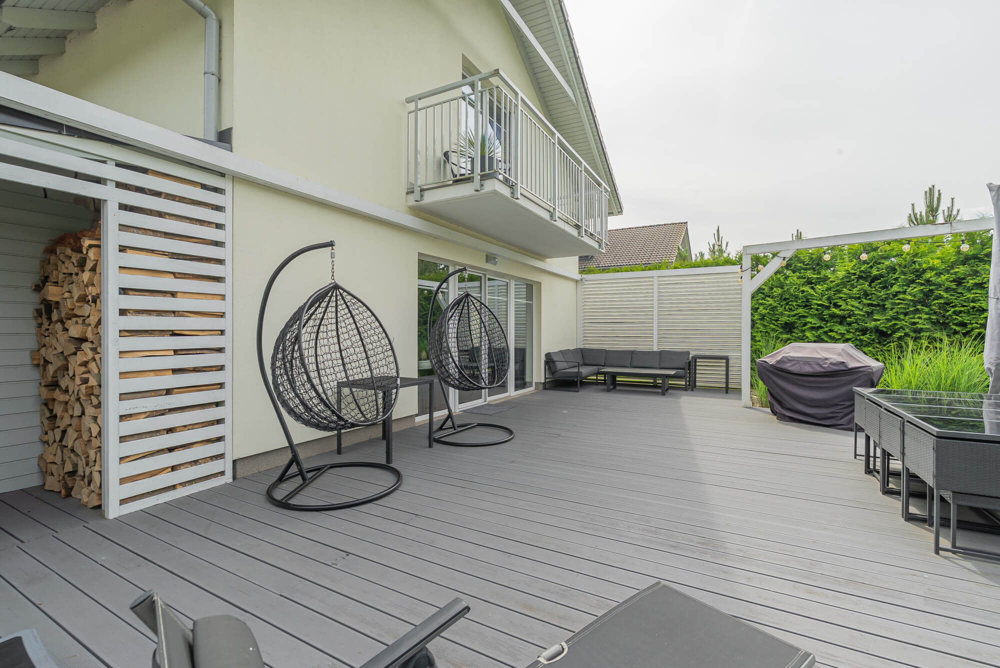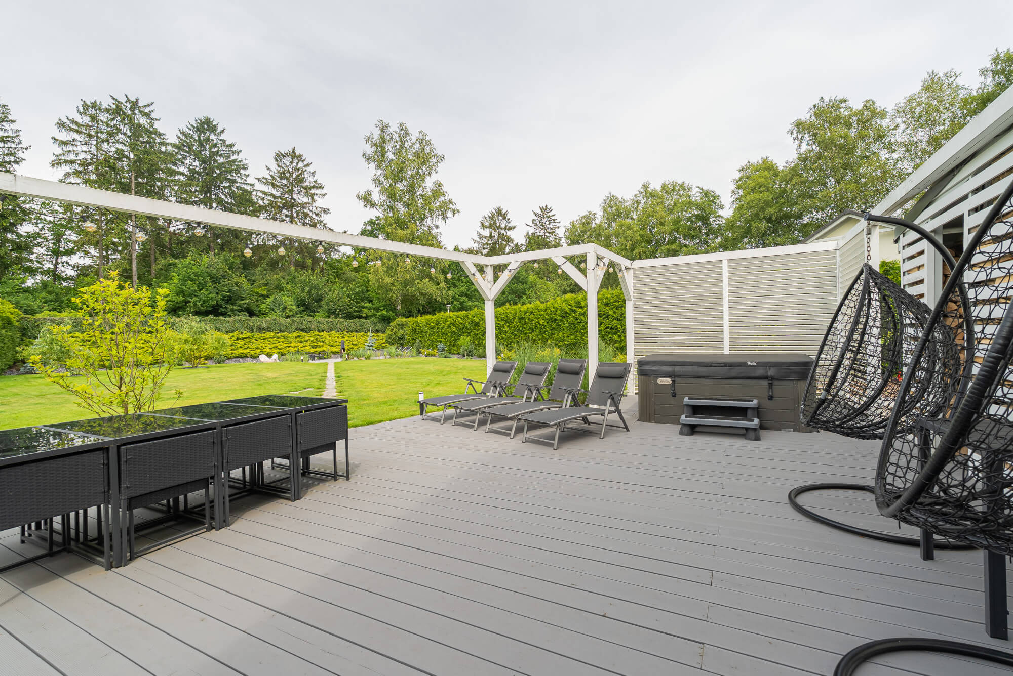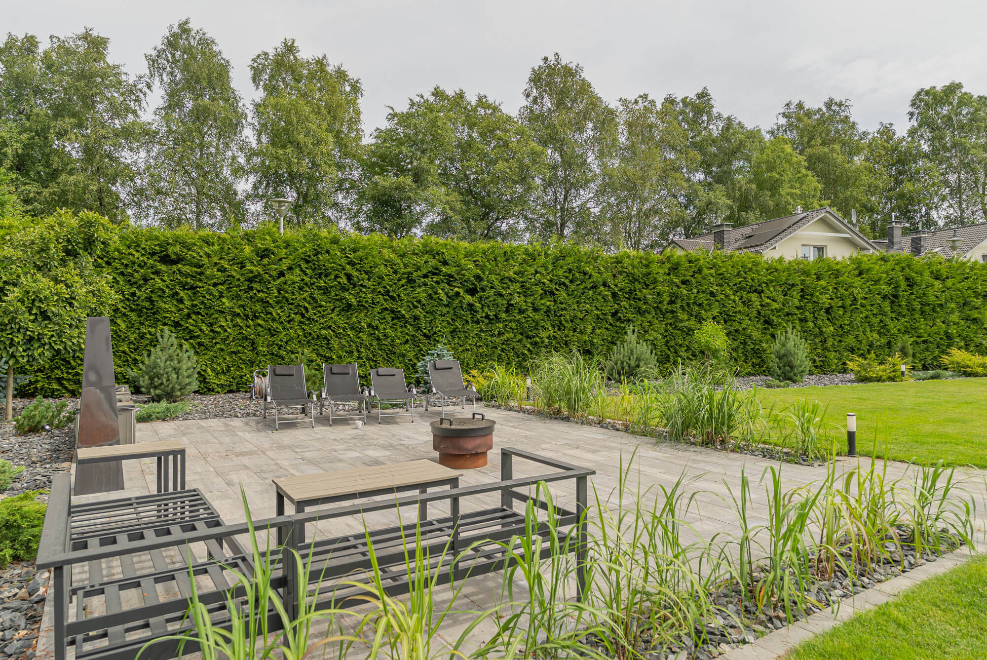 Drewniany taras o powierzchni około 90 m² oraz dodatkowy taras z betonowych płyt, liczący około 70 m², wyposażony w palenisko i kominek. Dopełnieniem strefy wypoczynkowej jest sześcioosobowe, podświetlane jacuzzi marki Wellis, wyposażone w cztery głośniki oraz funkcję ozonowania. Działka jest zadbana i łatwa w utrzymaniu dzięki robotowi koszącemu marki Gardena oraz automatycznemu systemowi podlewania. Na posesji znajduje się praktyczne pomieszczenie gospodarcze z drewutnią, idealne do przechowywania narzędzi i opału. W ogrodzie wydzielono również część przeznaczoną na sad ze szklarnią, co stwarza doskonałe warunki do uprawy roślin i własnych owoców.