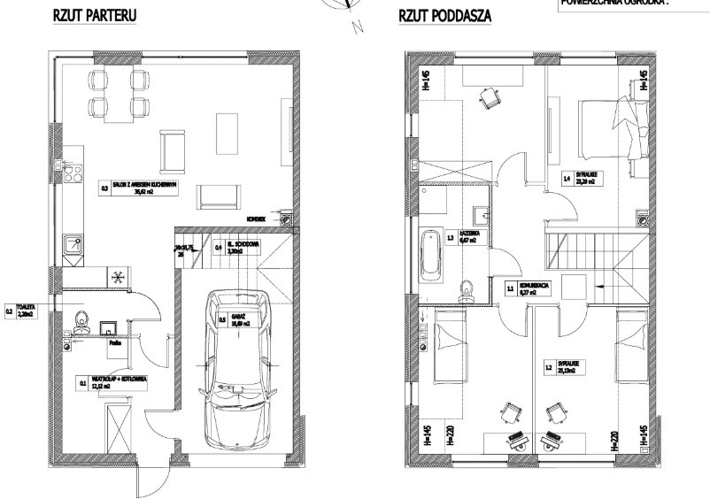 Dom dwu poziomowy z garażem w bryle budynku. Pow. użytkowa 133,12m2, pow. całkowita 162,44. Garaż o pow. 16,72m2