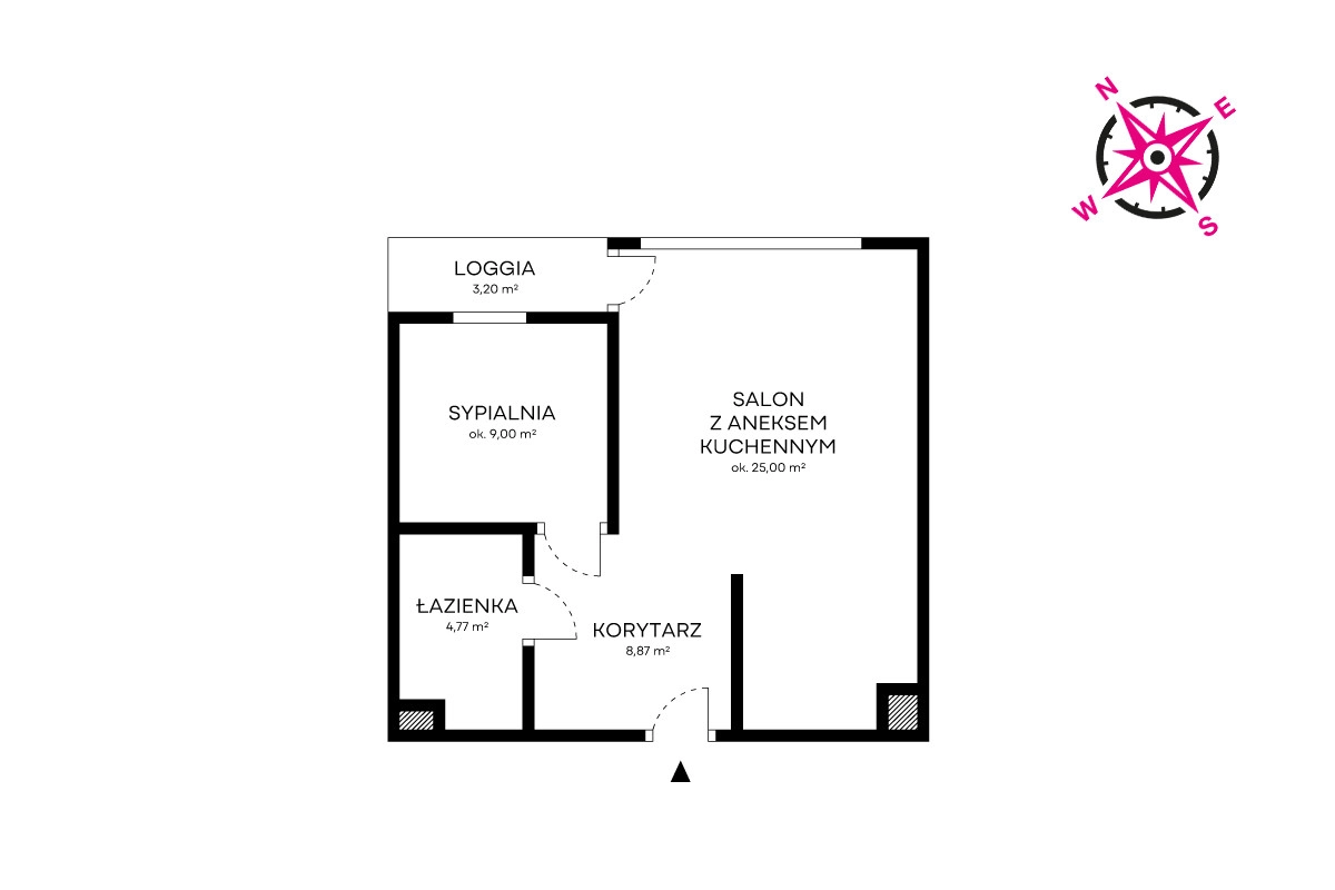 – salon z aneksem kuchennym (ok. 25,00 m2); w części kuchennej meble w zabudowie i pełne wyposażenie w sprzęt AGD; stąd również wyjście na loggię (3,20 m2),