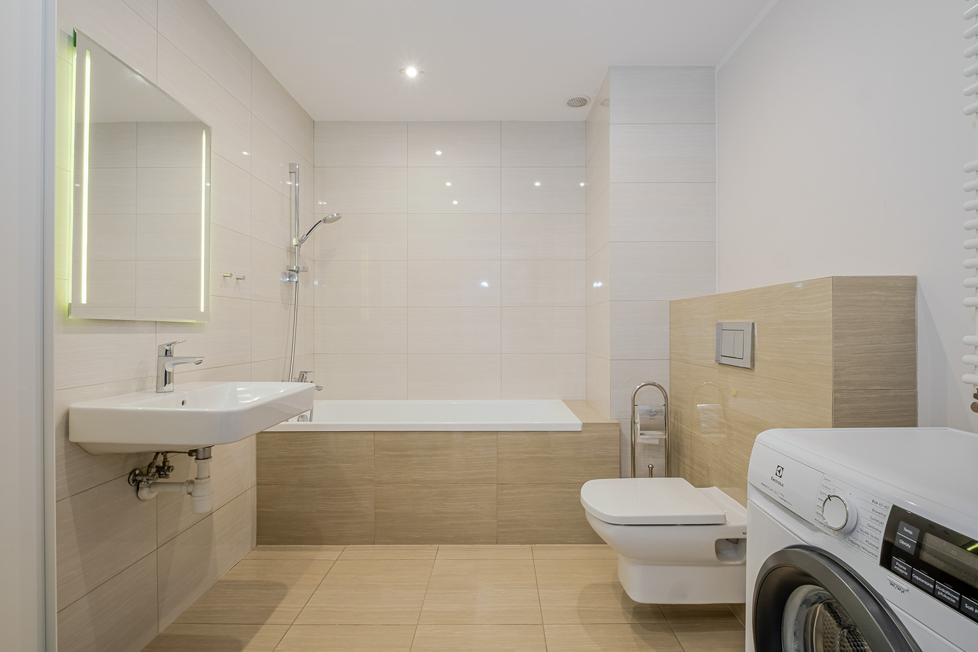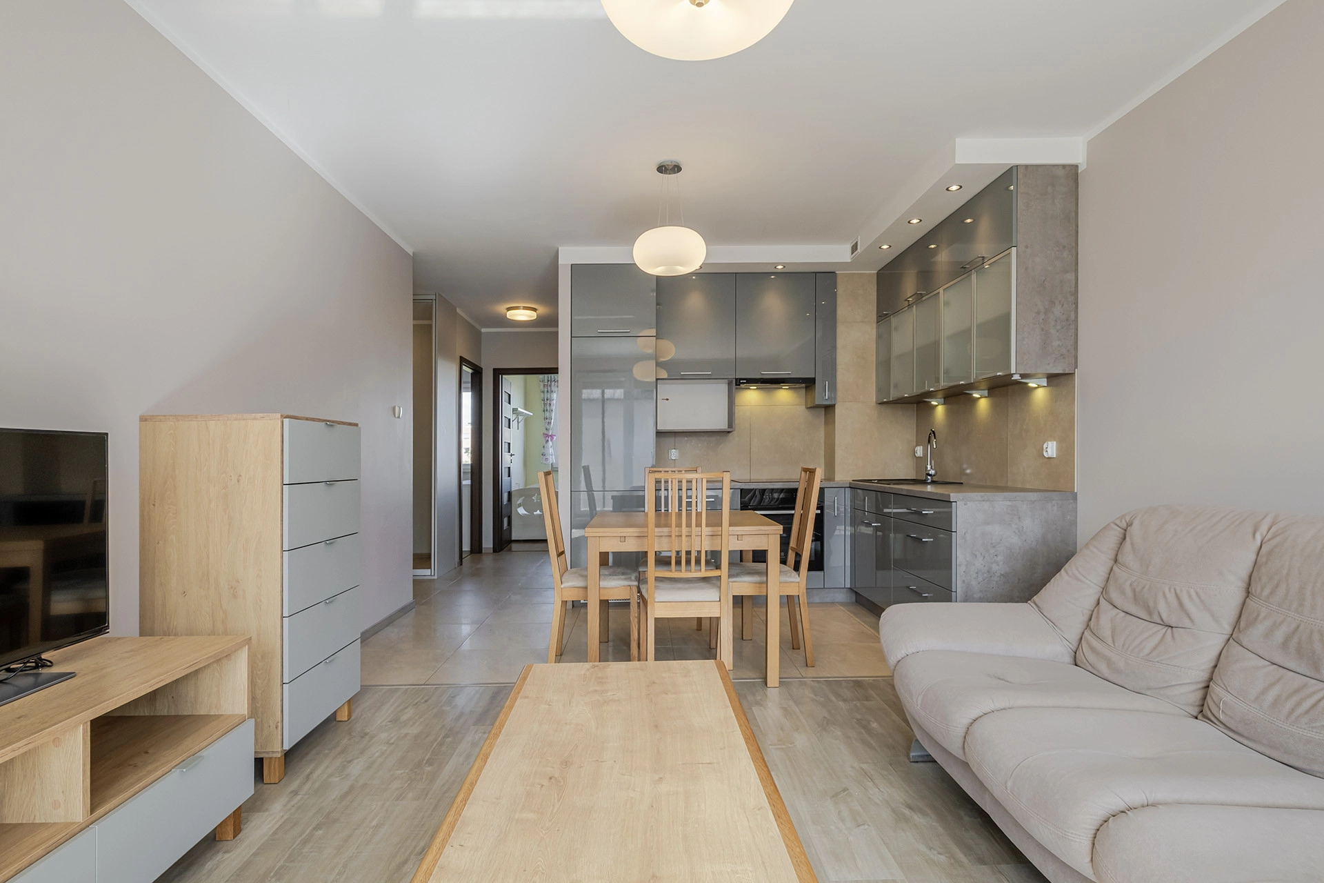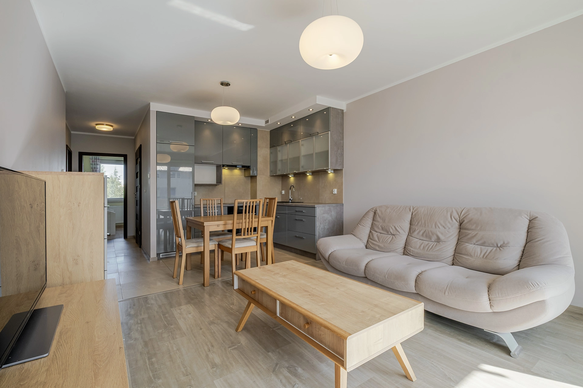 – salonu z aneksem kuchennym (21,25 m2) + przestronnego balkonu (5,4 m2);