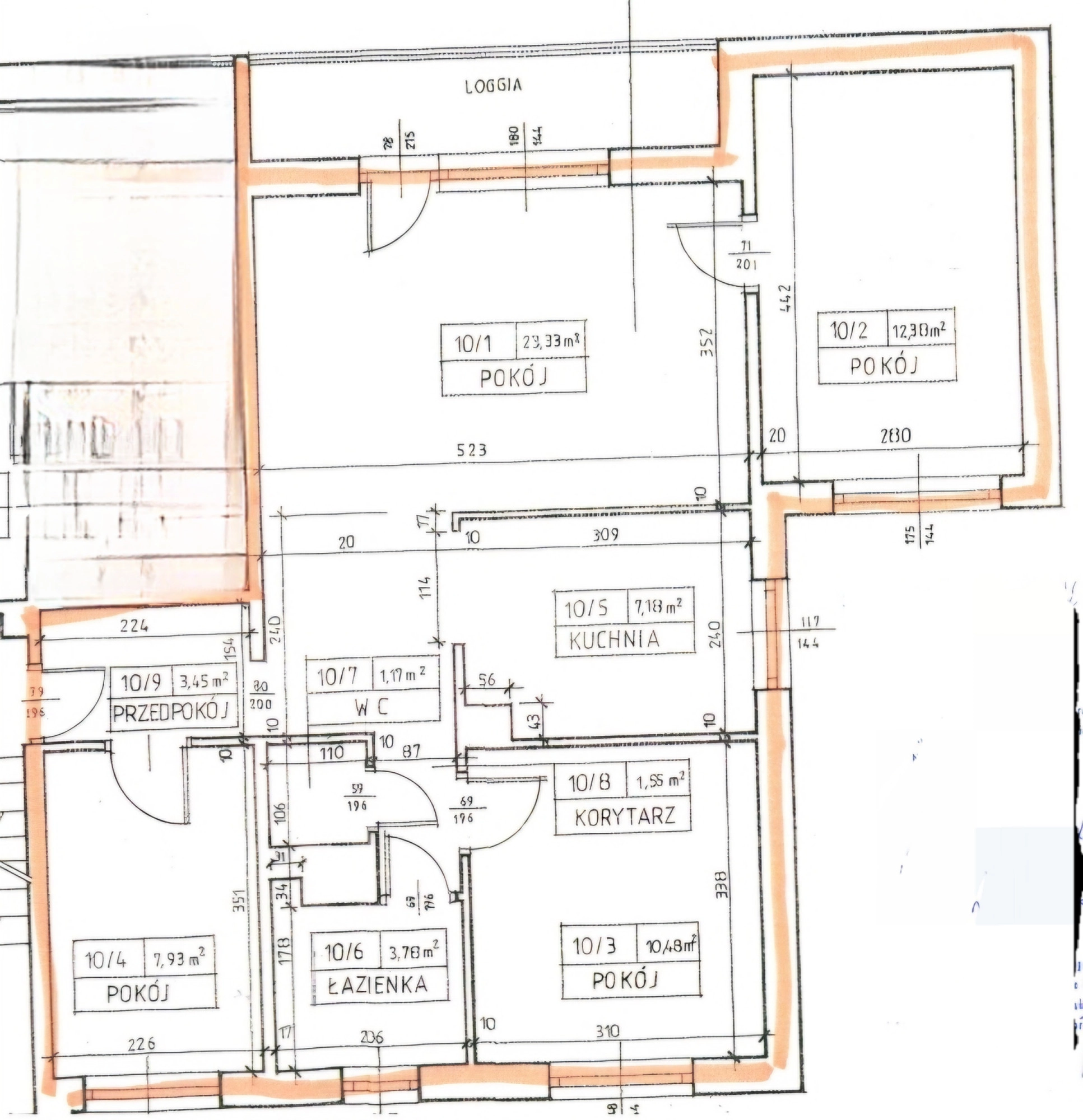 – trzy pokoje (12,3 m2, 10,5 m2, 8m2)