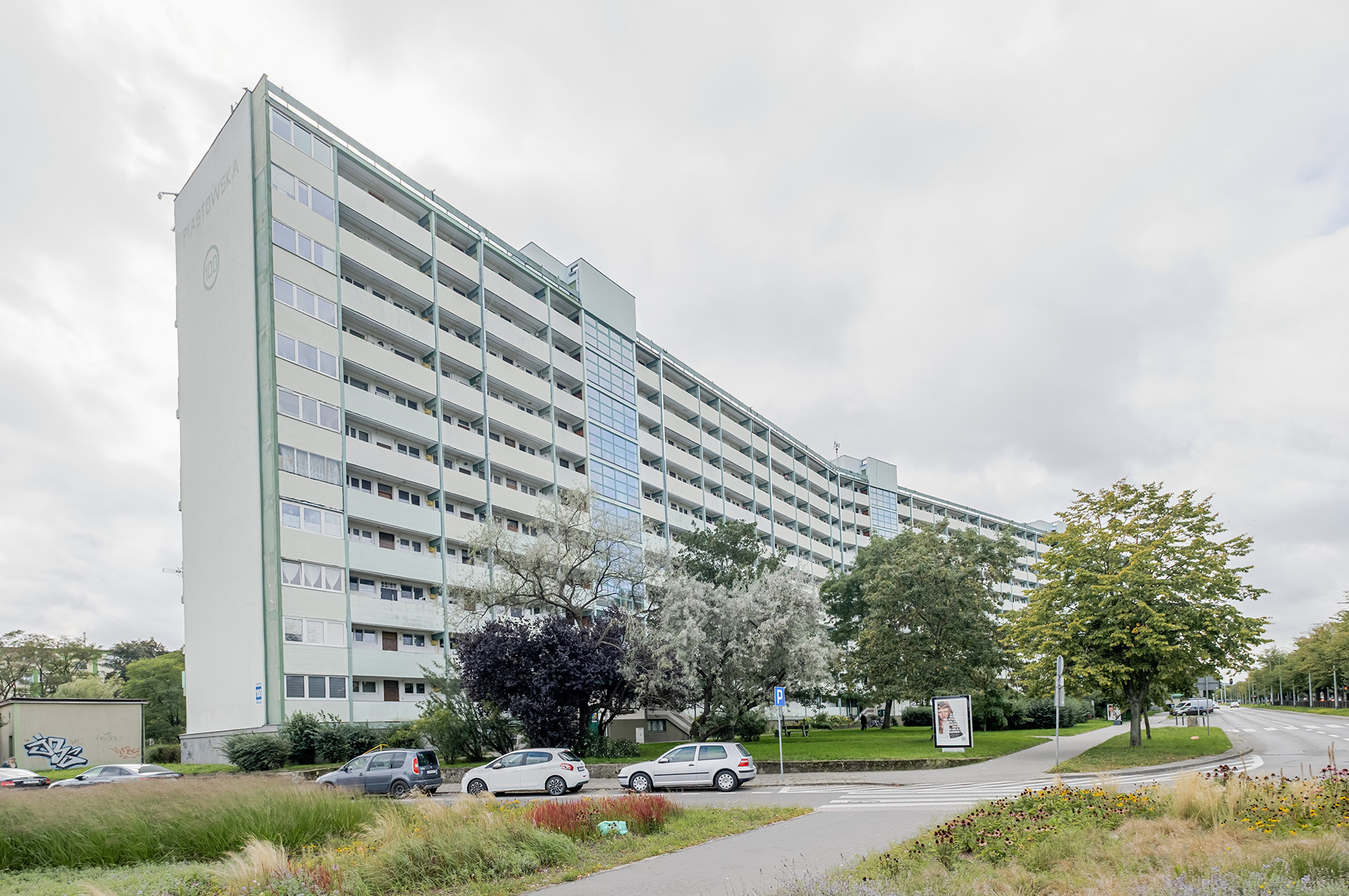 Wzdłuż budynku mieści się duży parking z ogólnodostępnymi miejscami.