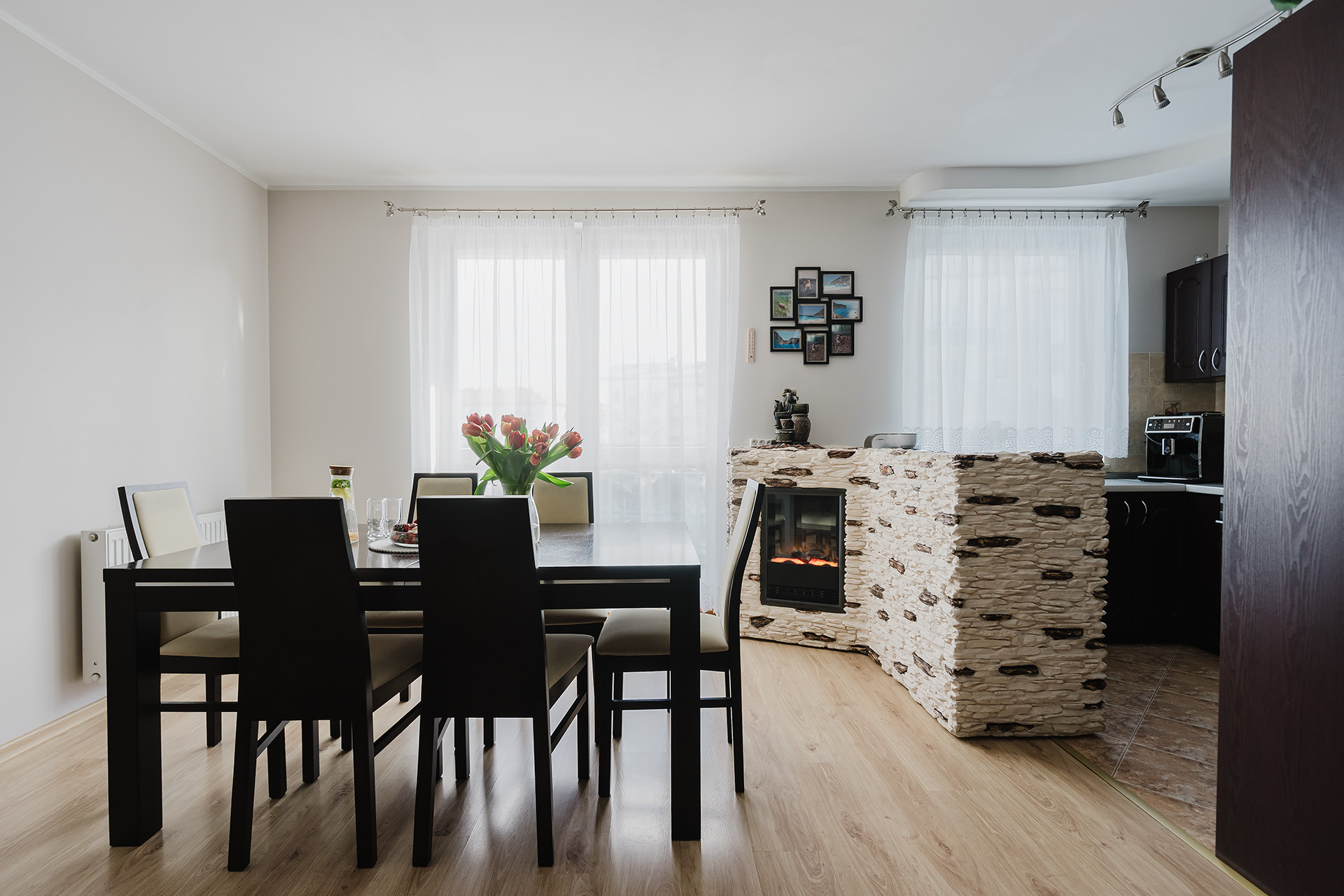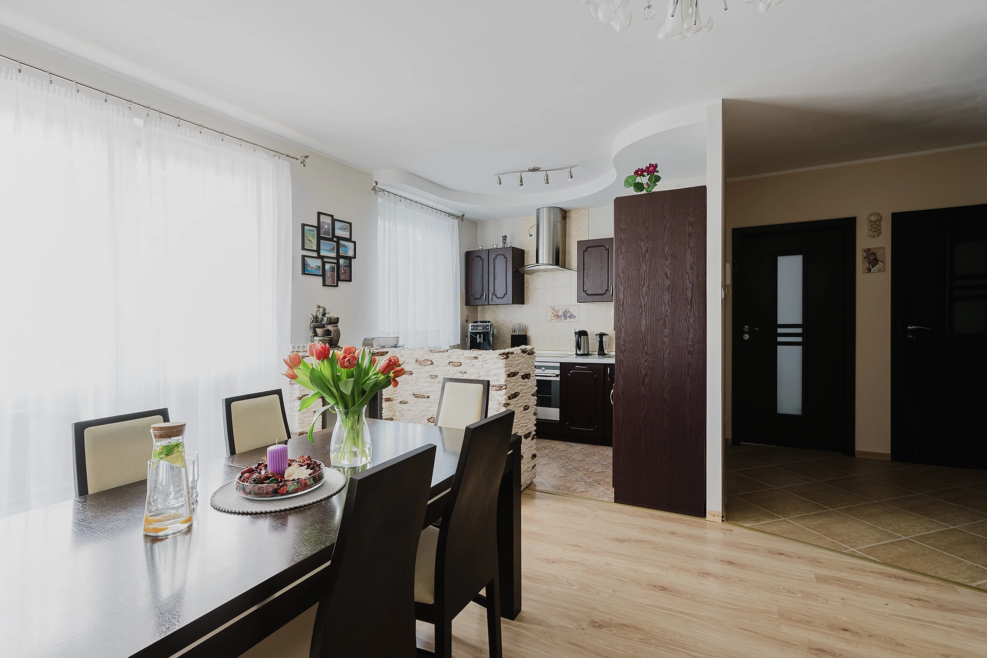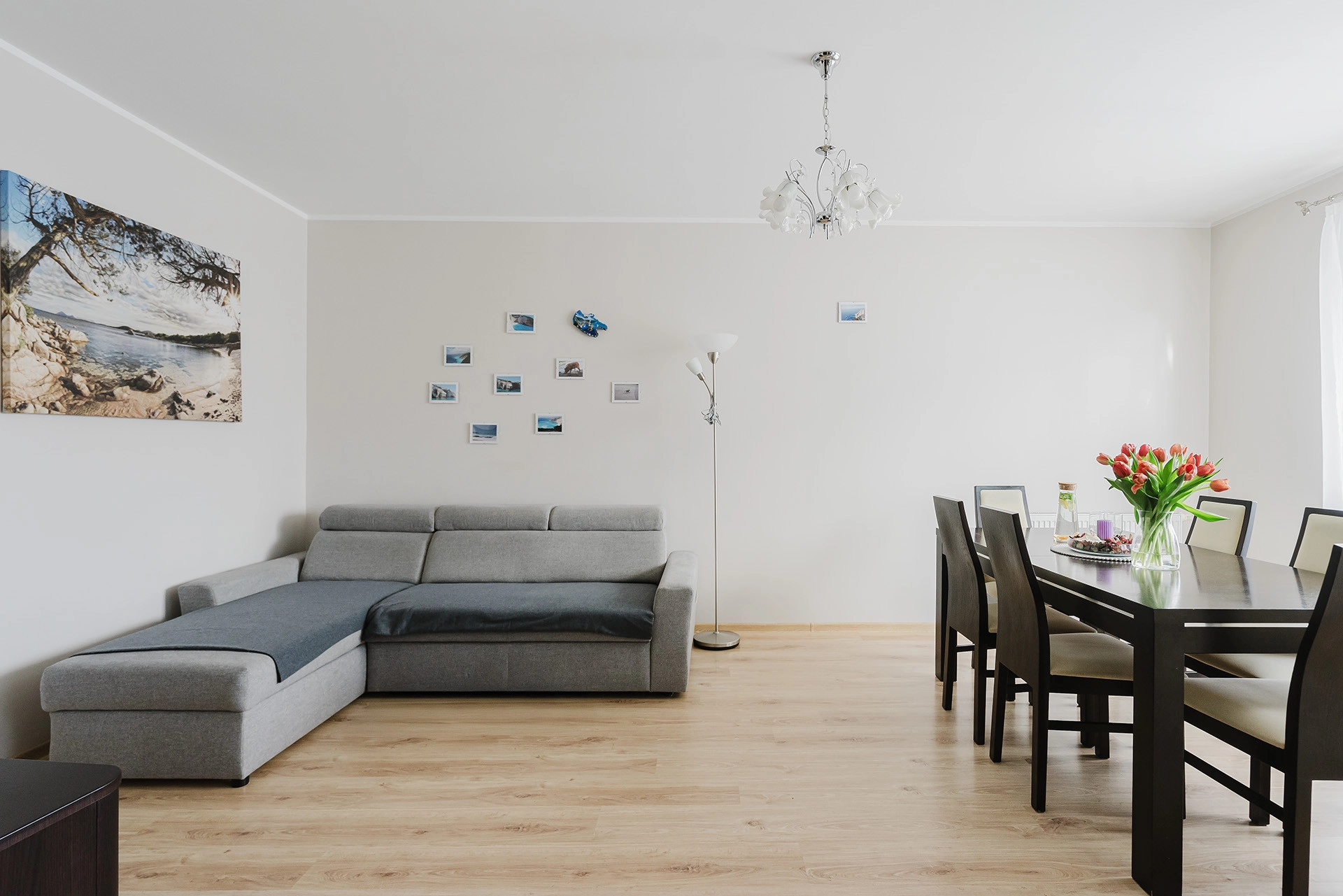 - słoneczny salon z aneksem kuchennym, idealny do wspólnego spędzania czasu, z wyjściem na balkon o powierzchni 5,5 m² – doskonałe miejsce na poranną kawę,