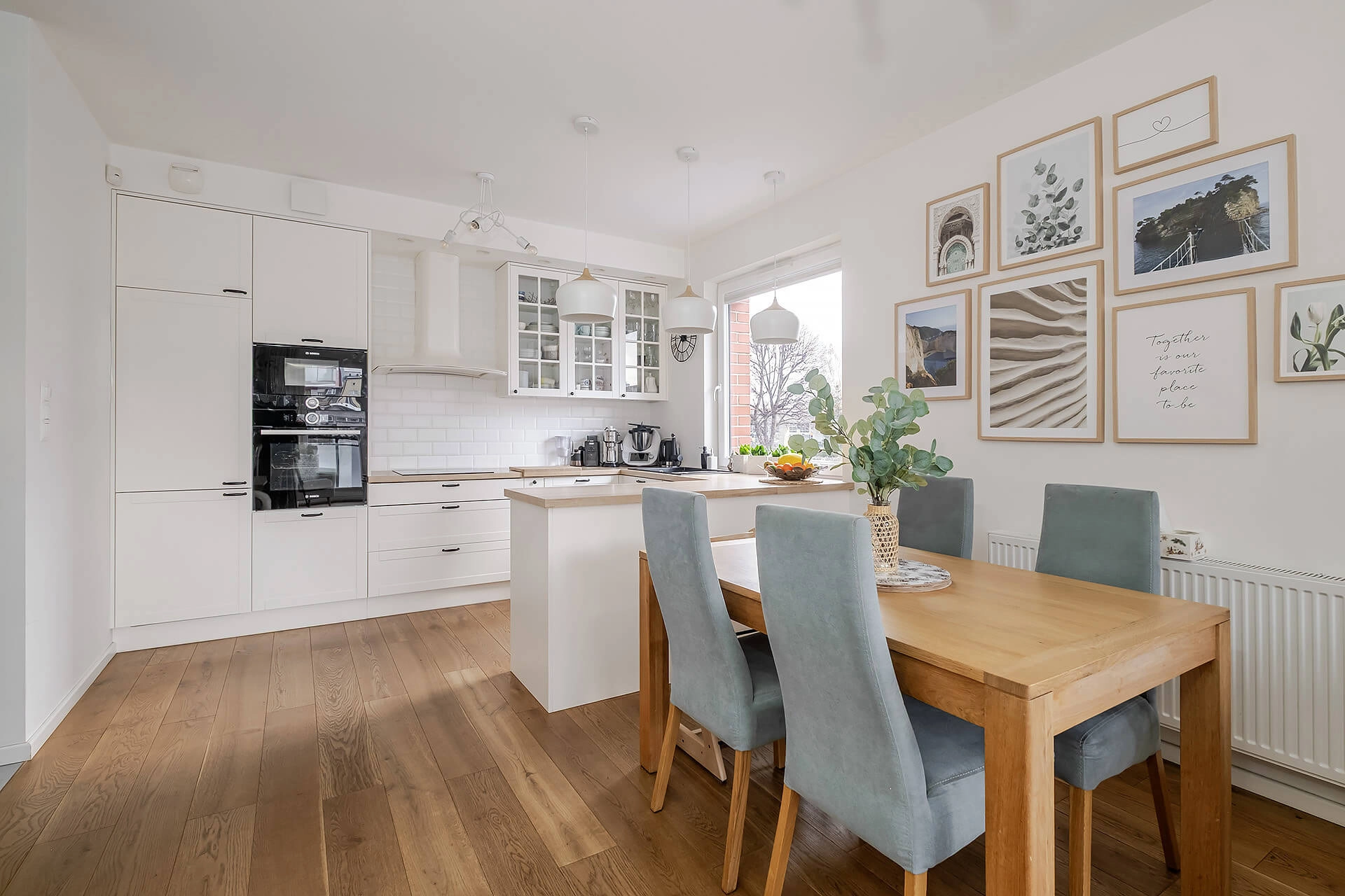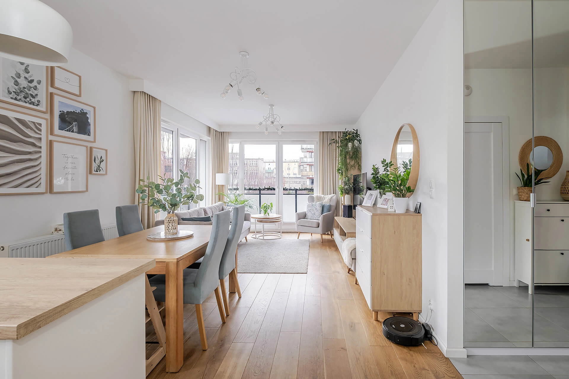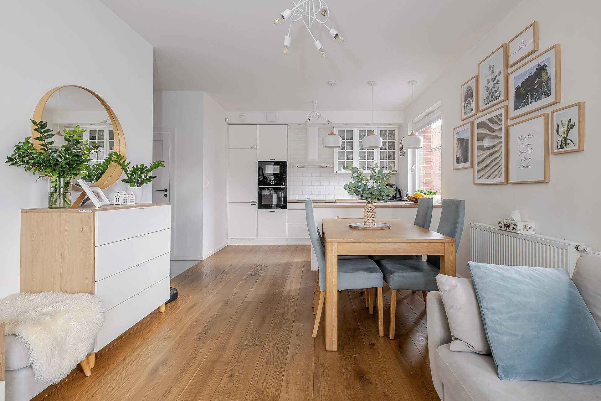 Mieszkanie zostało wykończone w jasnych, ciepłych barwach, z dębową deską na podłodze, która nadaje wnętrzu elegancji i naturalnego charakteru. Zabudowa kuchenna oraz szafy zostały wykonane na wymiar przez stolarza, a kuchnia wyposażona jest w wysokiej klasy sprzęt AGD marki Bosch. Dodatkowym atutem jest system alarmowy z powiadomieniami SMS.