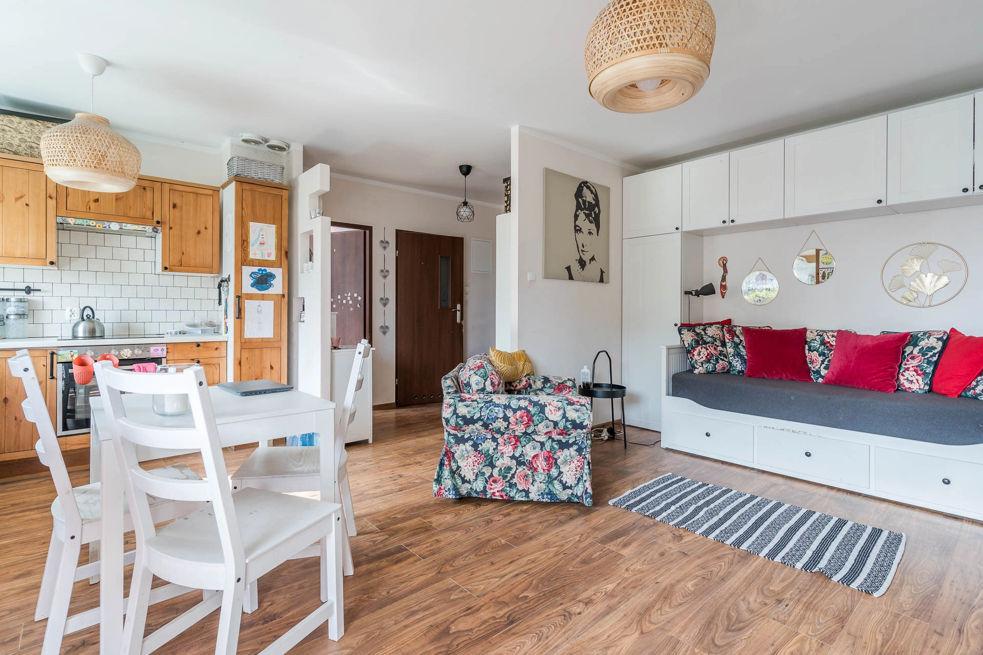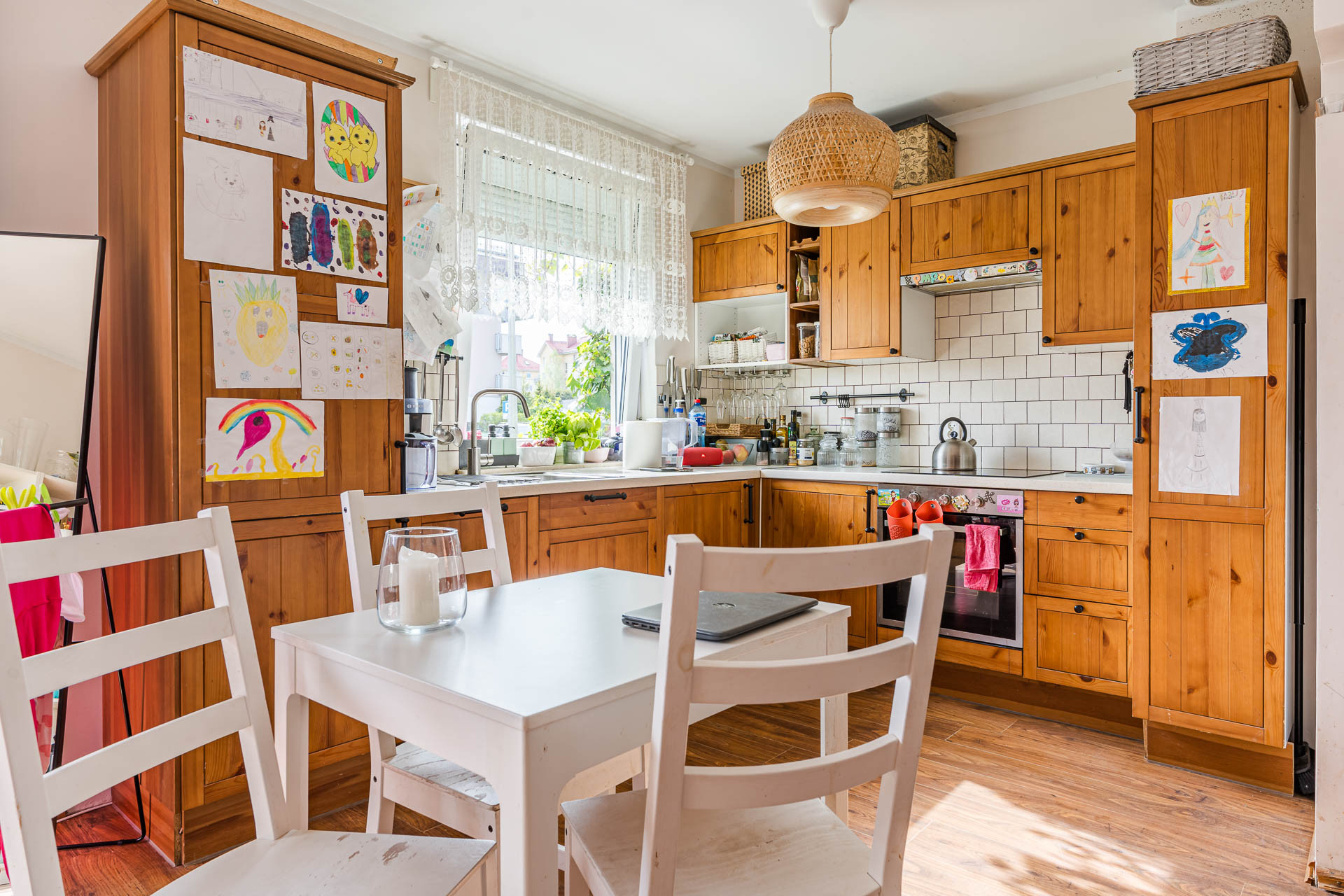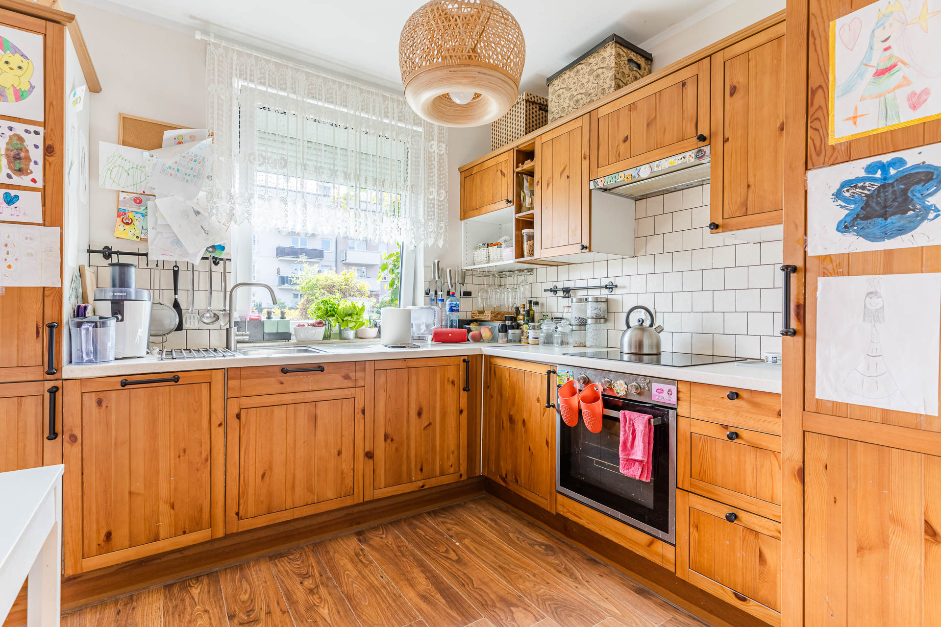 Jest przytulne, gotowe do wprowadzenia lub wynajmu. Zabudowy stałe stanowią wyposażenie mieszkania. Na podłogach znajdują się panele imitujące drewno, w łazience płytki gresowe. Meble w kuchni są drewniane. Kuchnia jest wyposażona w płytę indukcyjną, lodówkę, piekarnik.