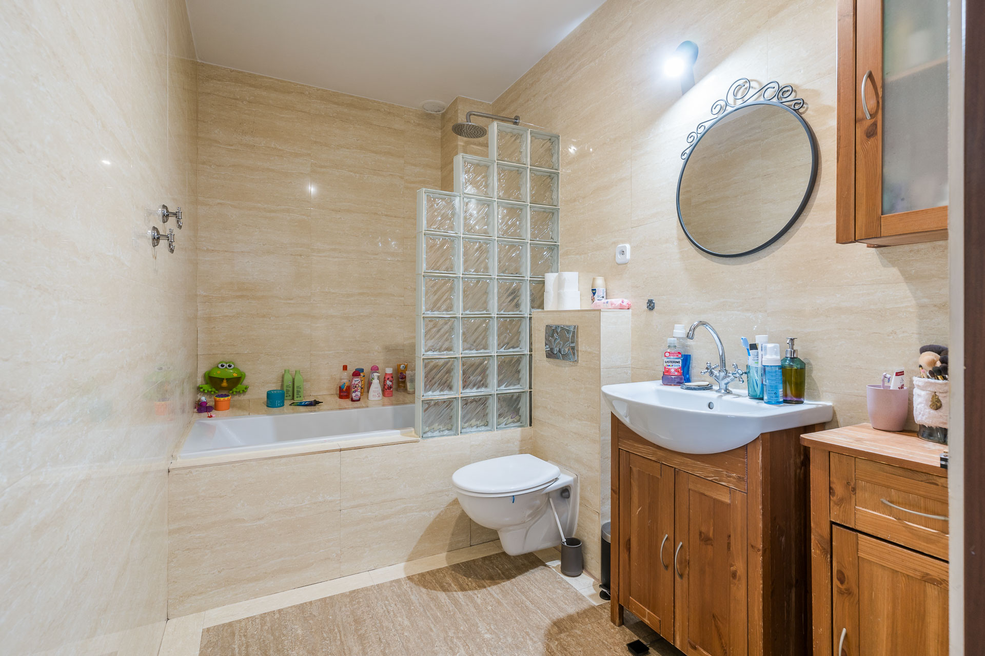 – łazienka z WC, wanną, umywalką, lustrem,