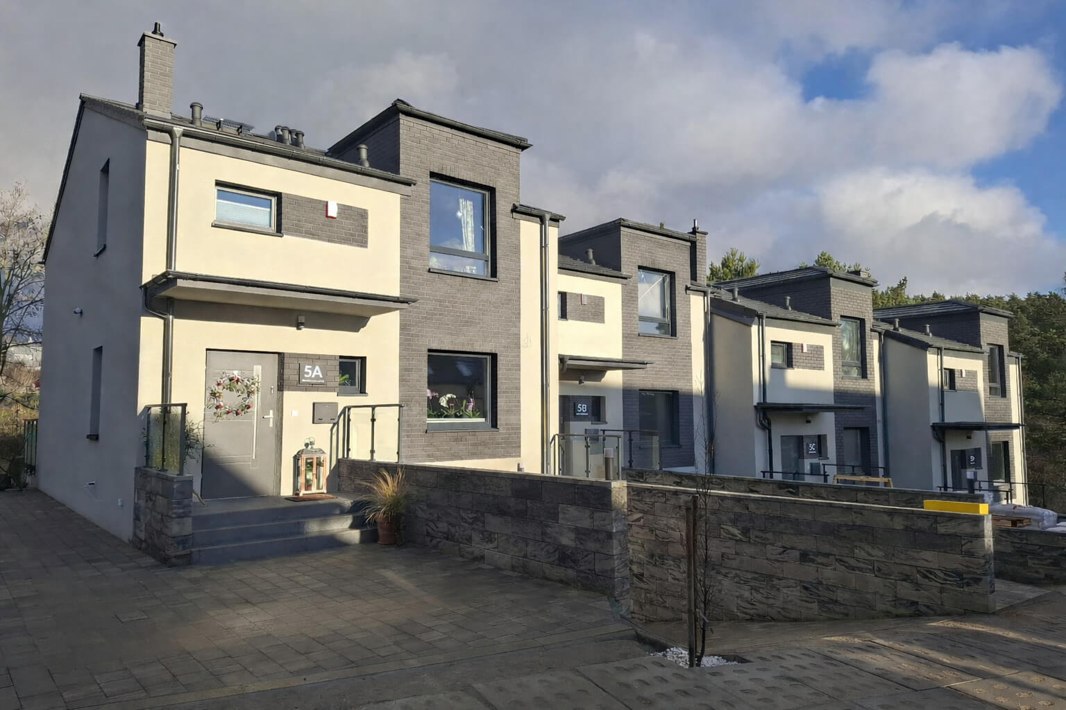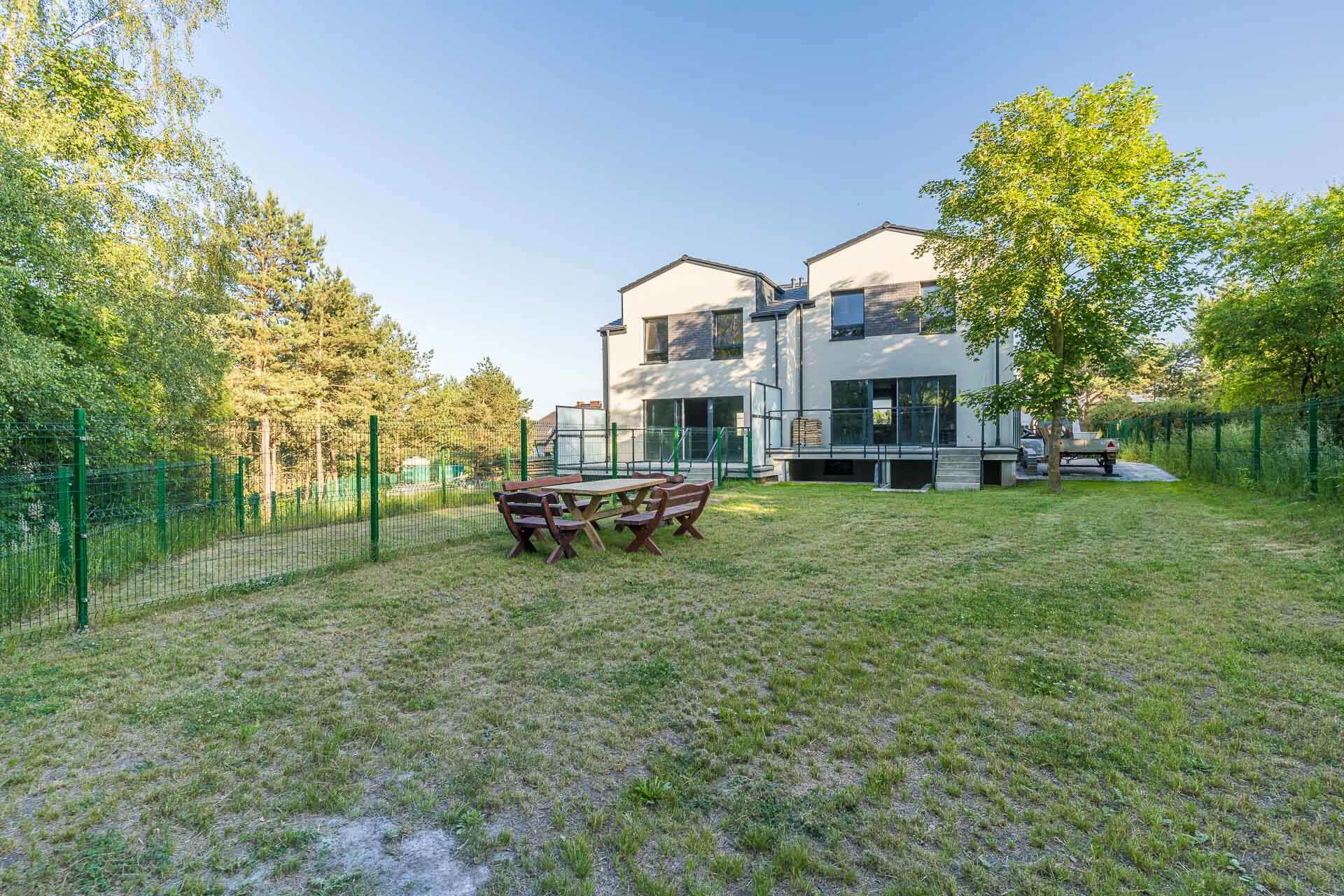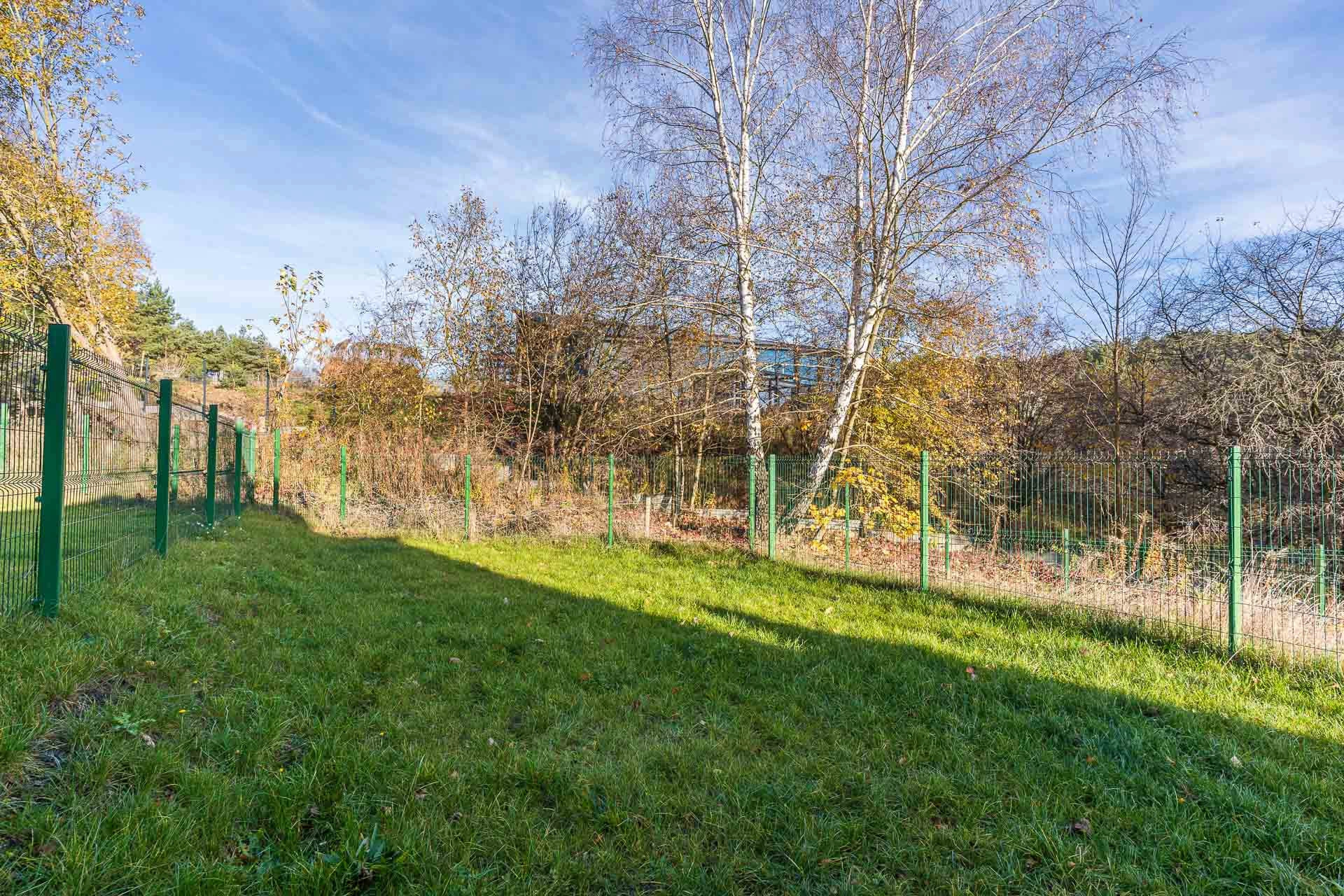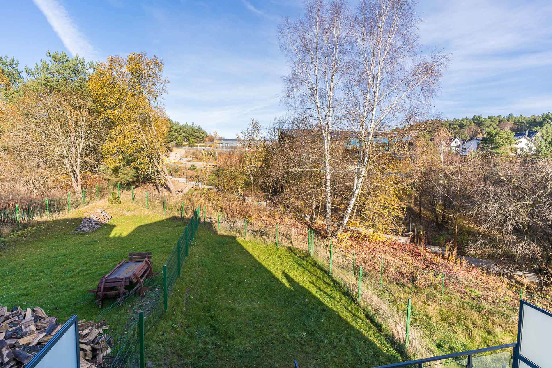 Skrajny szereg, ogródek obsadzony trawnikiem i ogrodzony siatką panelową. Od frontu brak ogrodzenia, dwa murki odgradzające wejście do domu i wjazd do garażu. Na posesji wkopany zbiornik na deszczówkę.