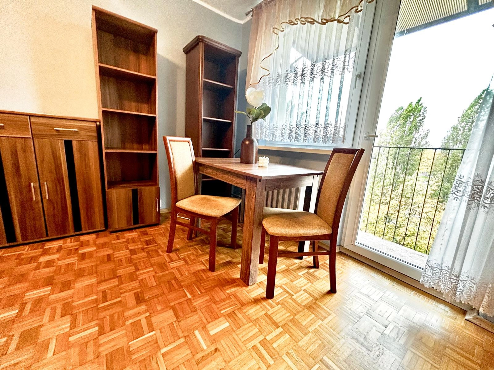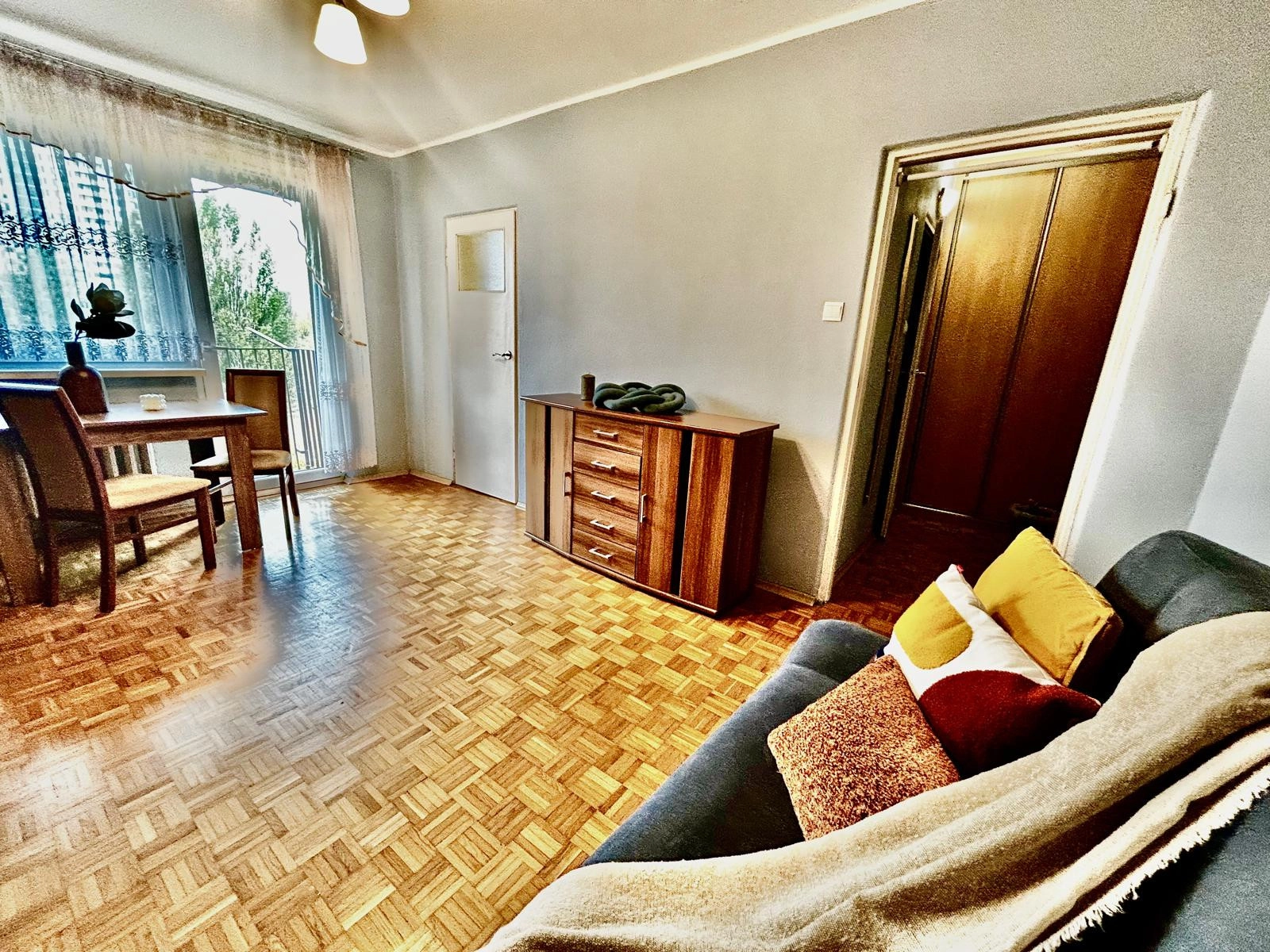 – słoneczny salon z wyjściem na balkon