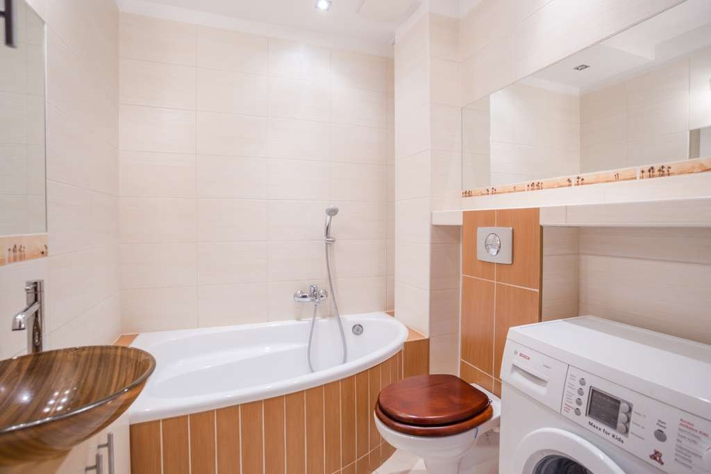 – łazienka z WC, wanna, umywalką, grzejnikiem drabinkowym
