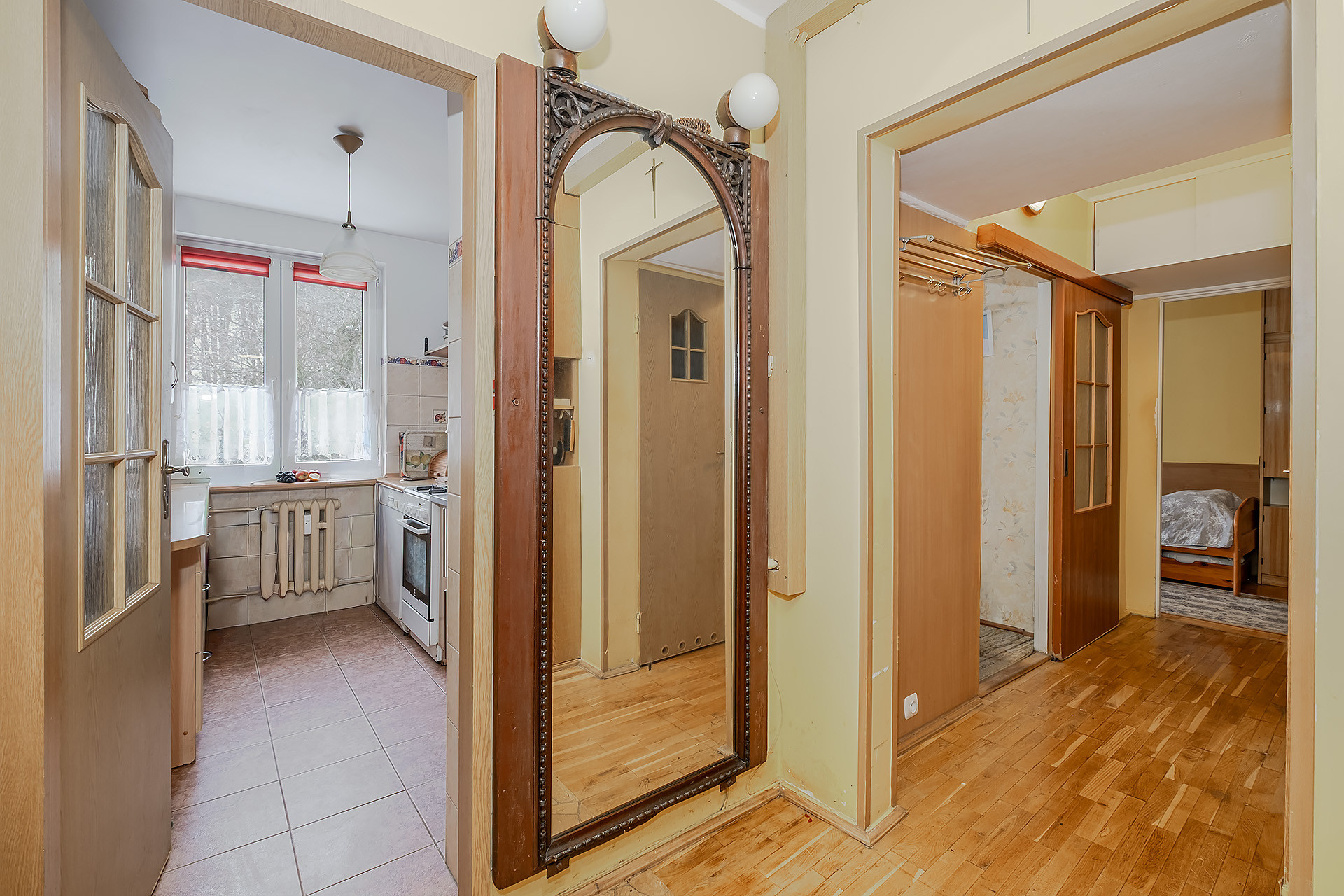 3 pokojowe (pierwotnie składało się z 4 pokoi i do tego układu można wrócić niewielkim nakładem – dwa pokoje zostały ze sobą połączone, a miejsce zlikwidowanej ściany pokazano na rzucie pomieszczeń) ustawne, jasne i ciepłe mieszkanie o powierzchni użytkowej 59,27 m2. Znajduje się na 1 piętrze w budynku położonym w otulinie lasu, będącego częścią Trójmiejskiego Parku Krajobrazowego. Okna, za wyjątkiem jednego, wychodzą na stronę południową przez co mieszkanie jest bardzo dobrze nasłonecznione. Na podłogach w pokojach parkiet, który dzisiaj jest zasłonięty, do renowacji. Łazienka została wyremontowana niedawno, natomiast reszta pomieszczeń wymaga odnowienia.