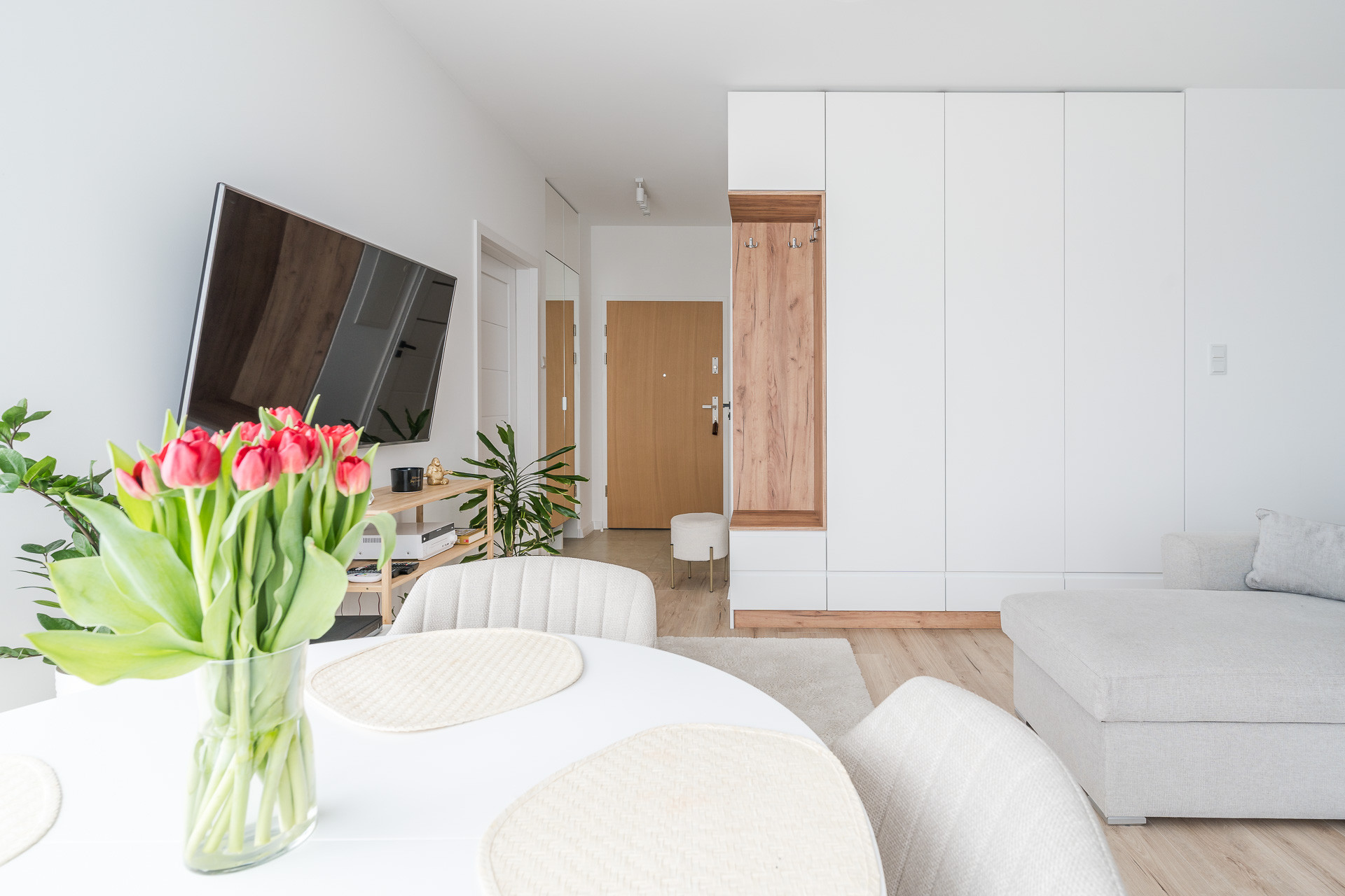 Nieruchomość zaprojektowana tak, by jak najlepiej wykorzystać przestrzeń. Panoramiczne okna sprawiają, że mieszkanie jest świetnie doświetlone, jasne i ciepłe. Kuchnia oraz zabudowy robione na zamówienie u stolarza. Mieszkanie wykończone ze smakiem z materiałów wysokiej jakości.