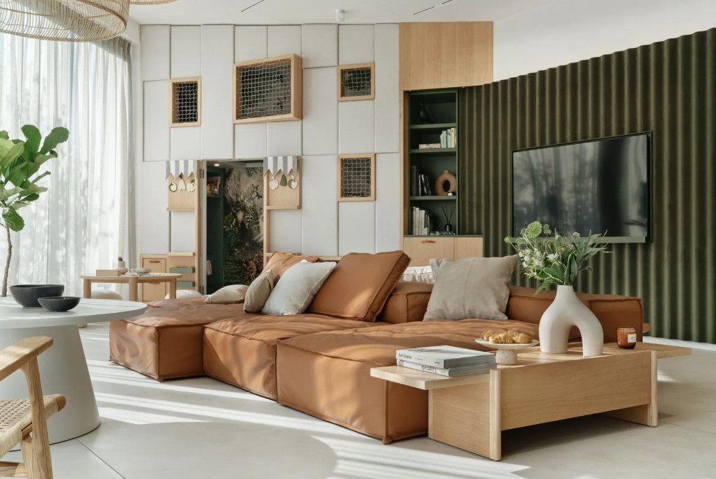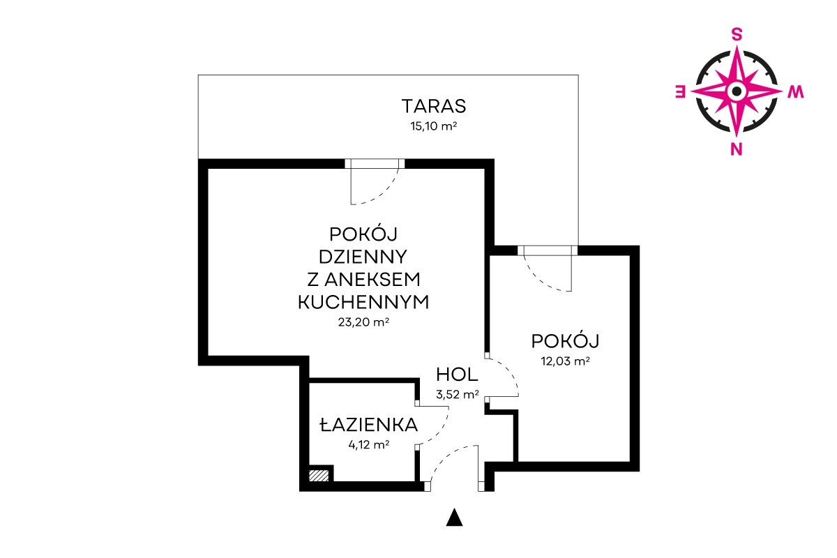– salon z aneksem kuchennym (23,02 m2) z wyjściem na taras (15,10 m2),