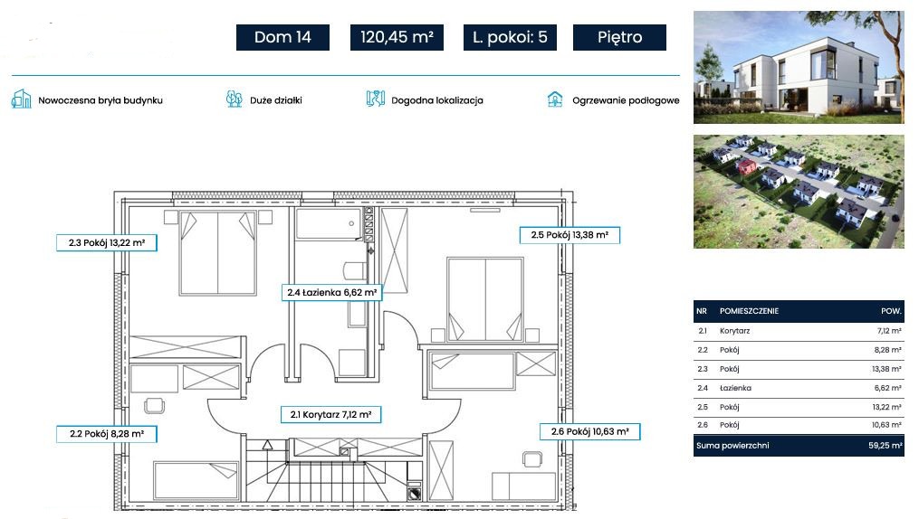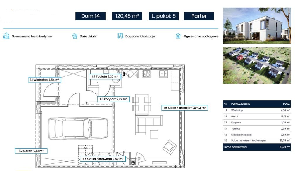 DOM: W stanie deweloperskim o powierzchni 120,45 m2. Składający się z 5 pokoi, dwóch łazienek oraz dużego garażu. Wystawa południowa, Przed budynkiem 3 miejsca parkingowe.