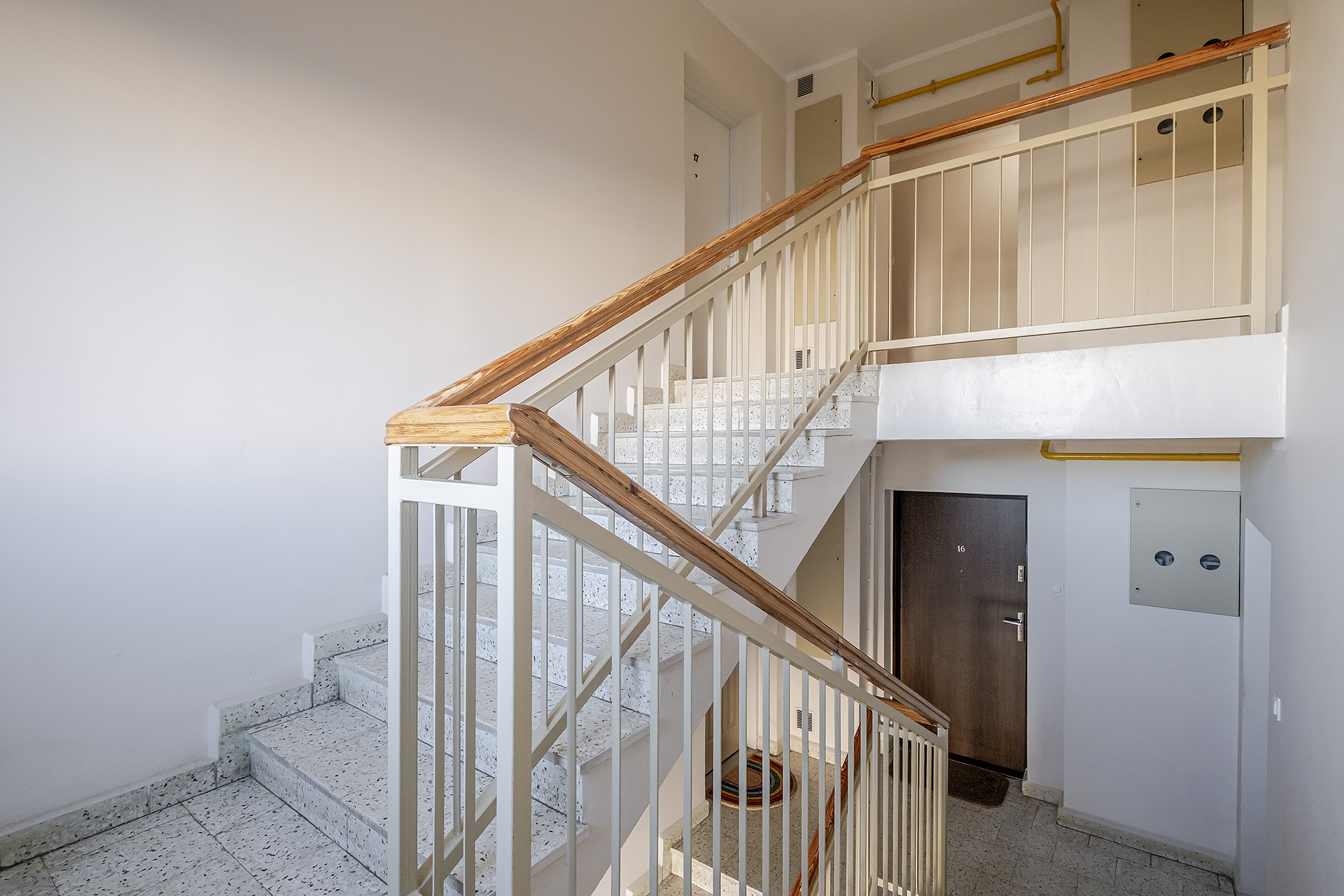 Klatka schodowa czysta i szeroka, wejście zabezpieczone domofonem.
